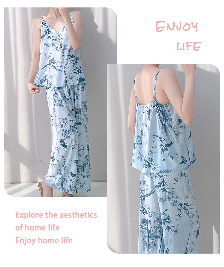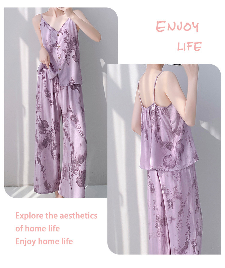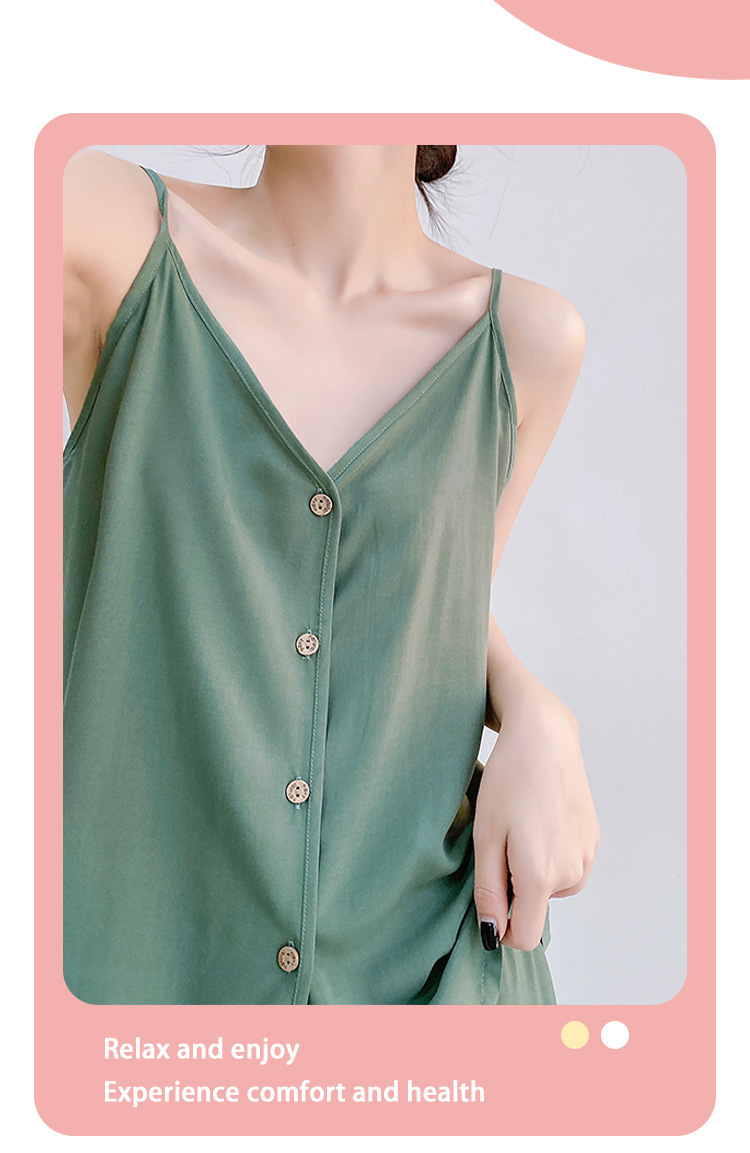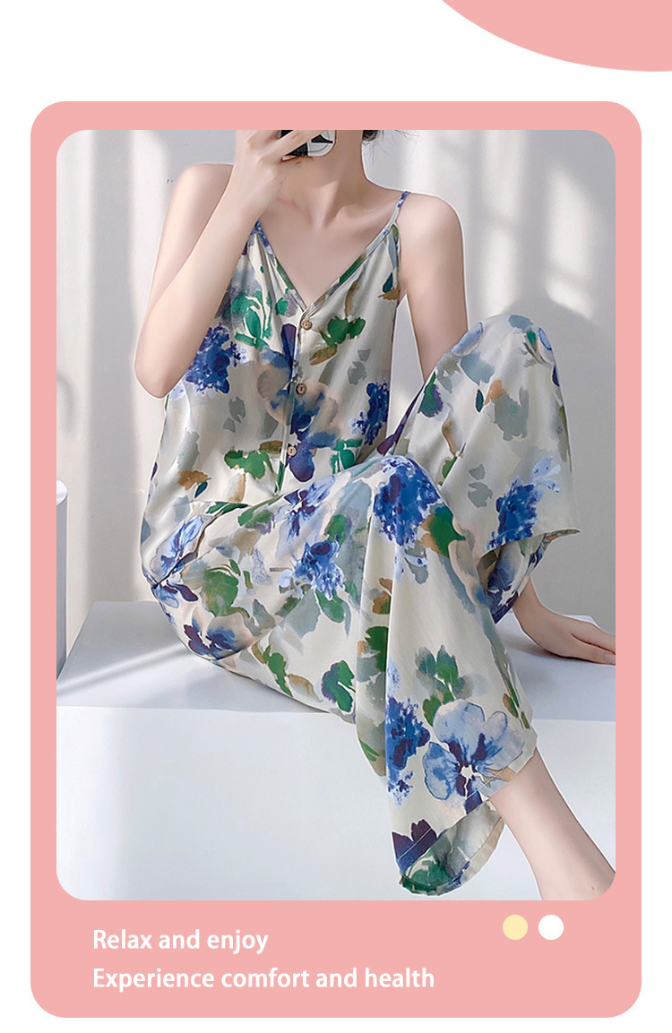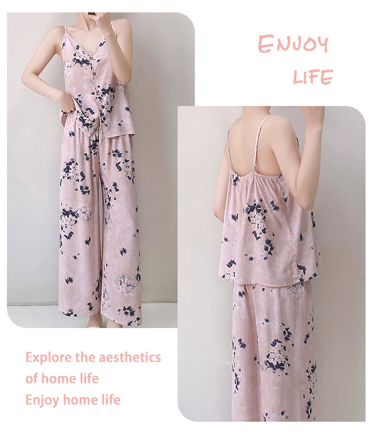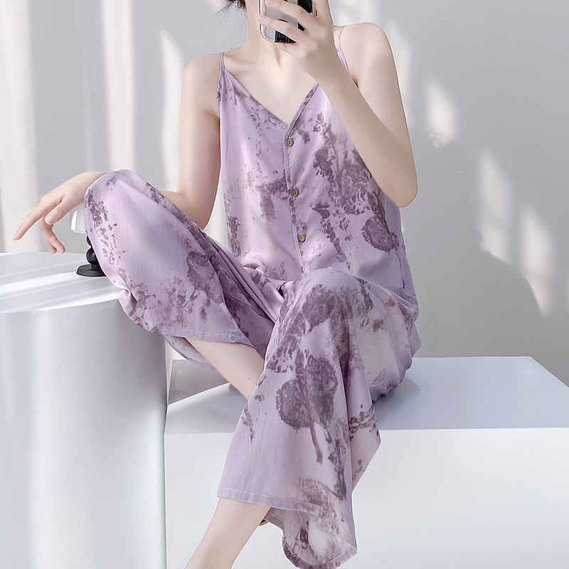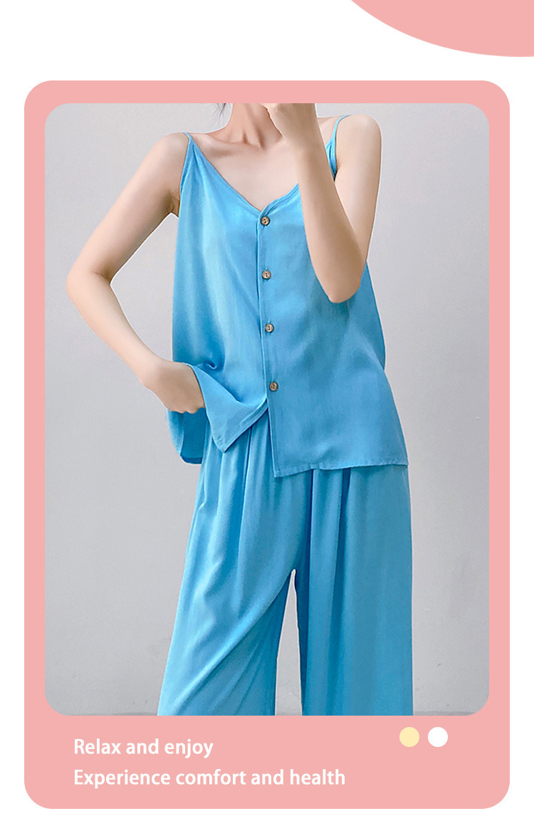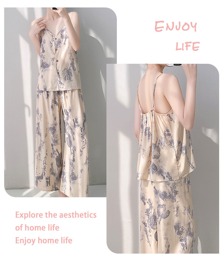 가벼운 럭셔리 코튼 실크 잠옷 여성의 봄 가을과 여름 투피스 슬링 홈 옷 느슨한 간단한 단색 카디건 세트