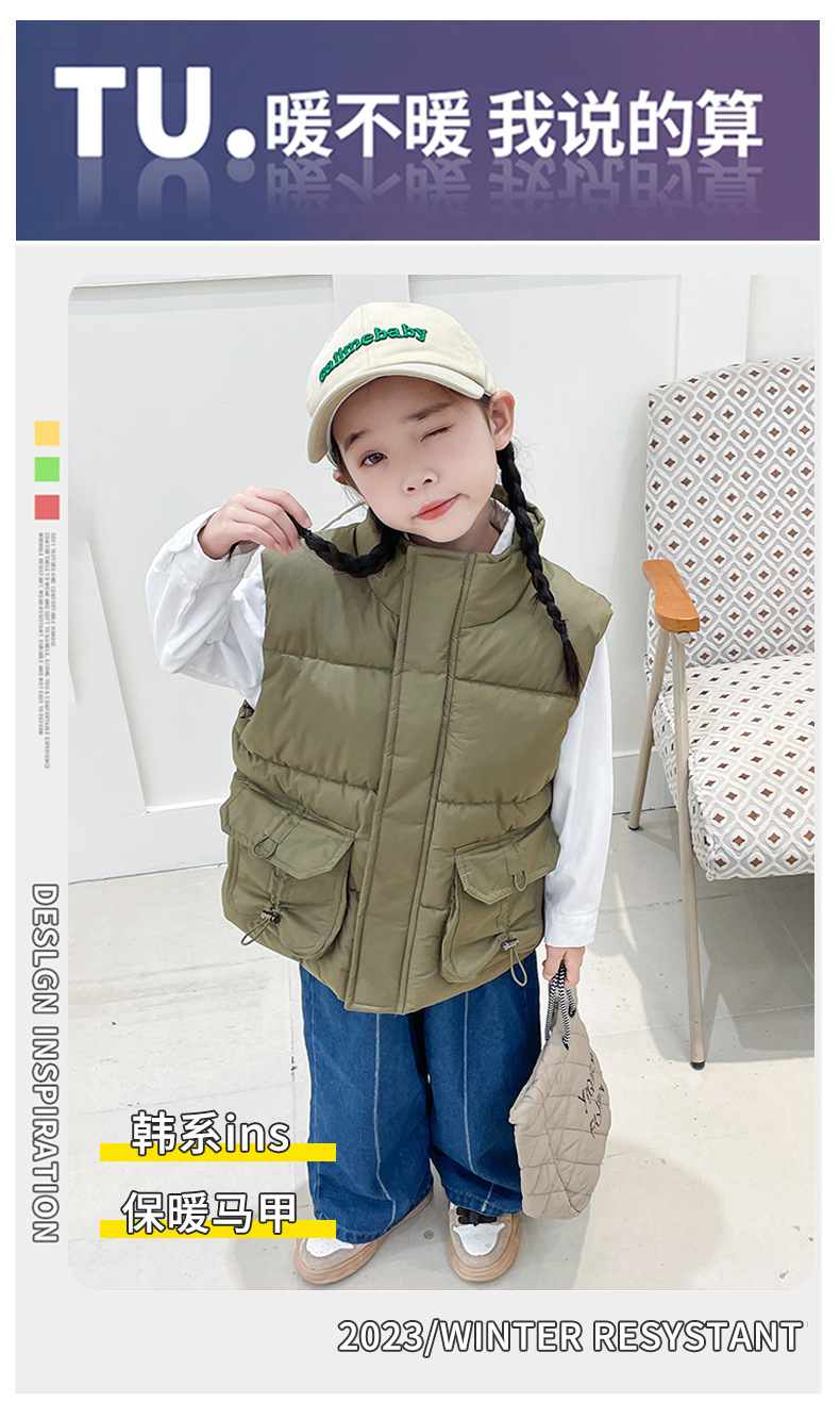 2023冬新款儿童宝宝百搭男女童马甲女孩工装保暖加厚棉马夹外穿潮