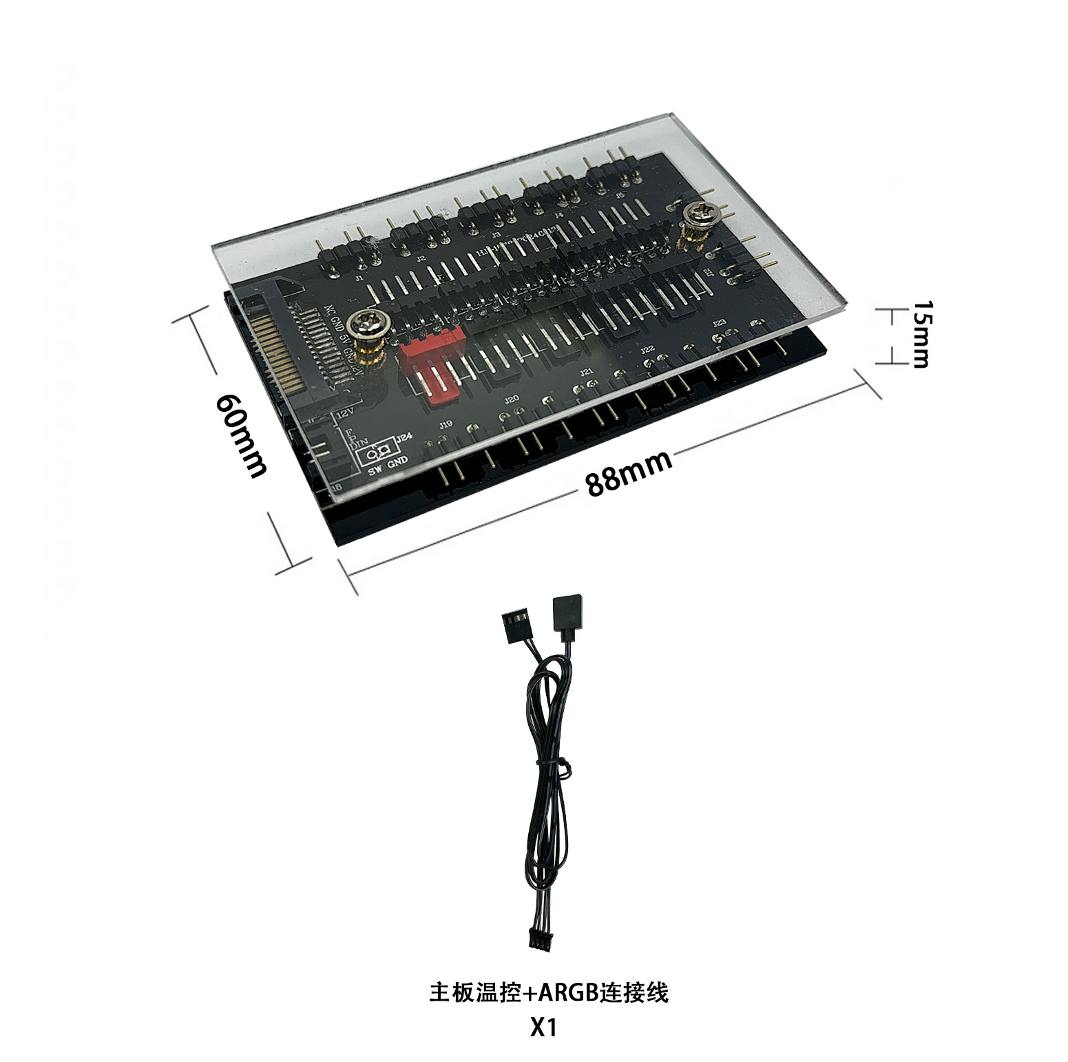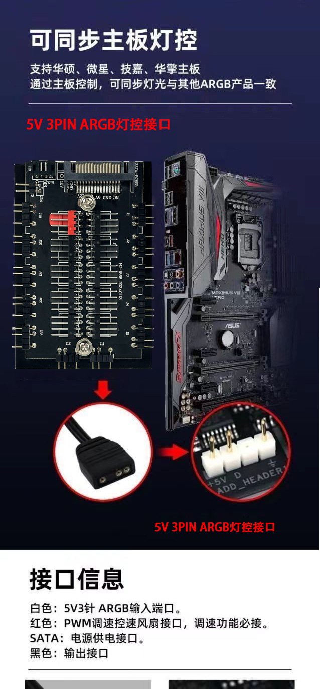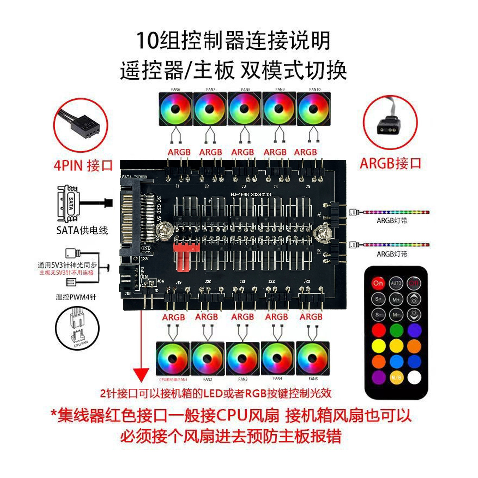 컴퓨터 ARGB 듀얼 10 방향 팬 허브 5v3 핀 pwm 무선 원격 제어 SATA 전원 공급 장치 섀시 컨트롤러
