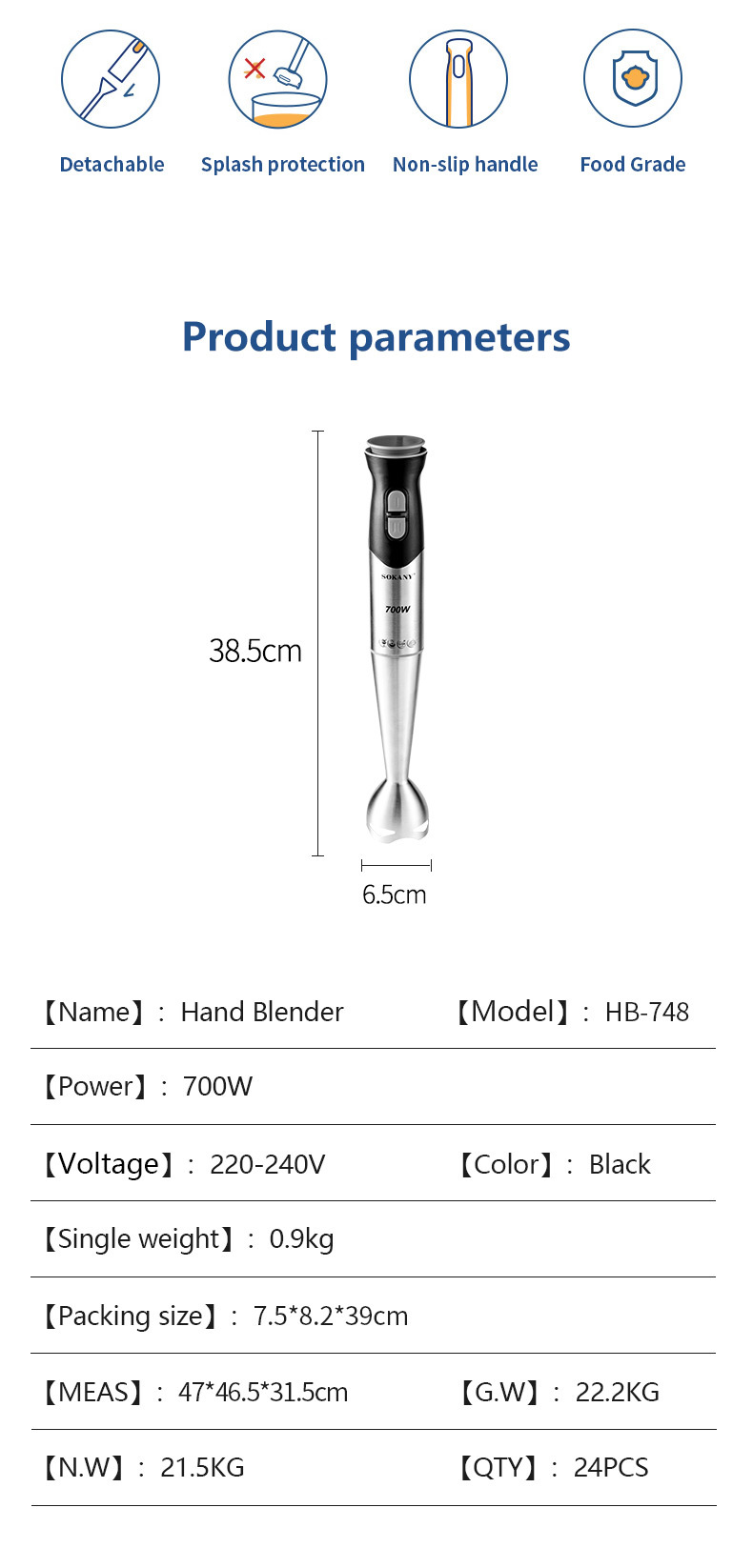 국경 간 유럽 게이지 700W 휴대용 전기 믹서 고속 교반 바 아기 보완 식품 가공 4 블레이드