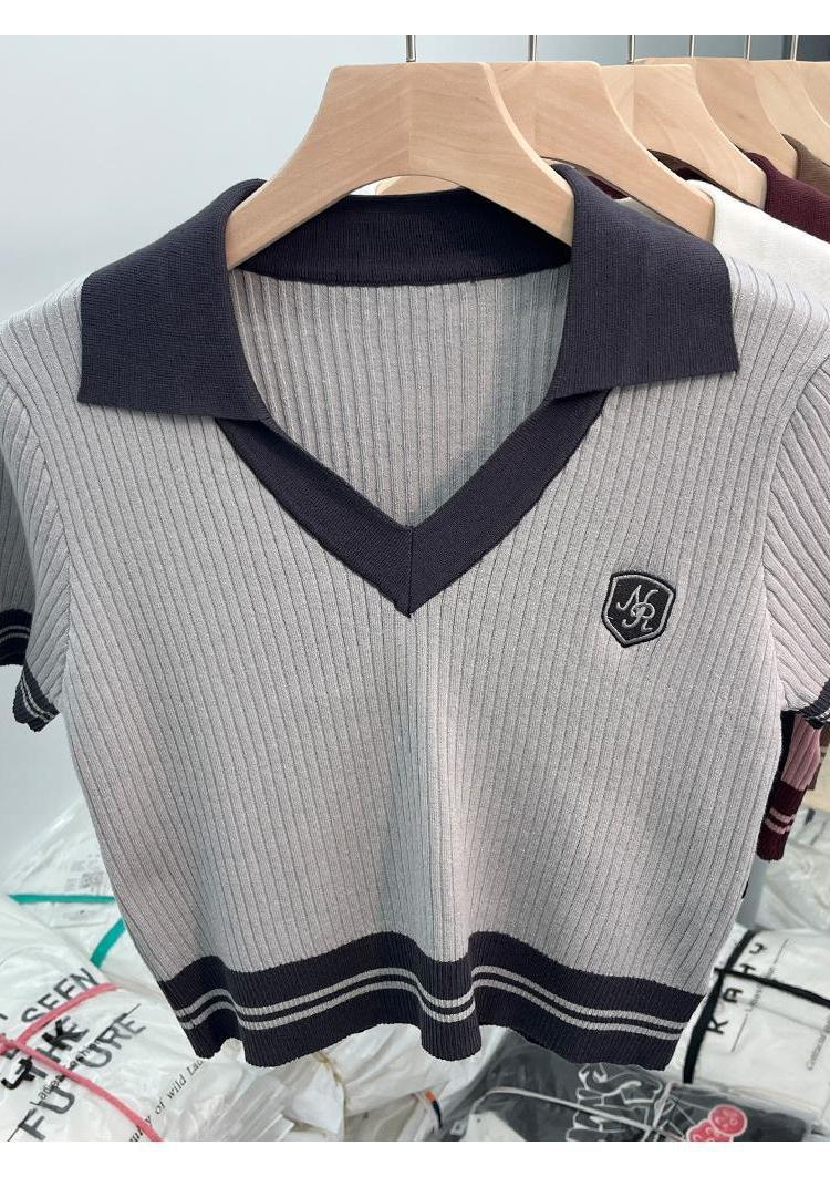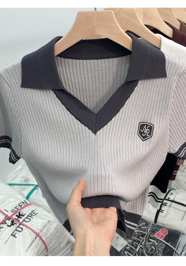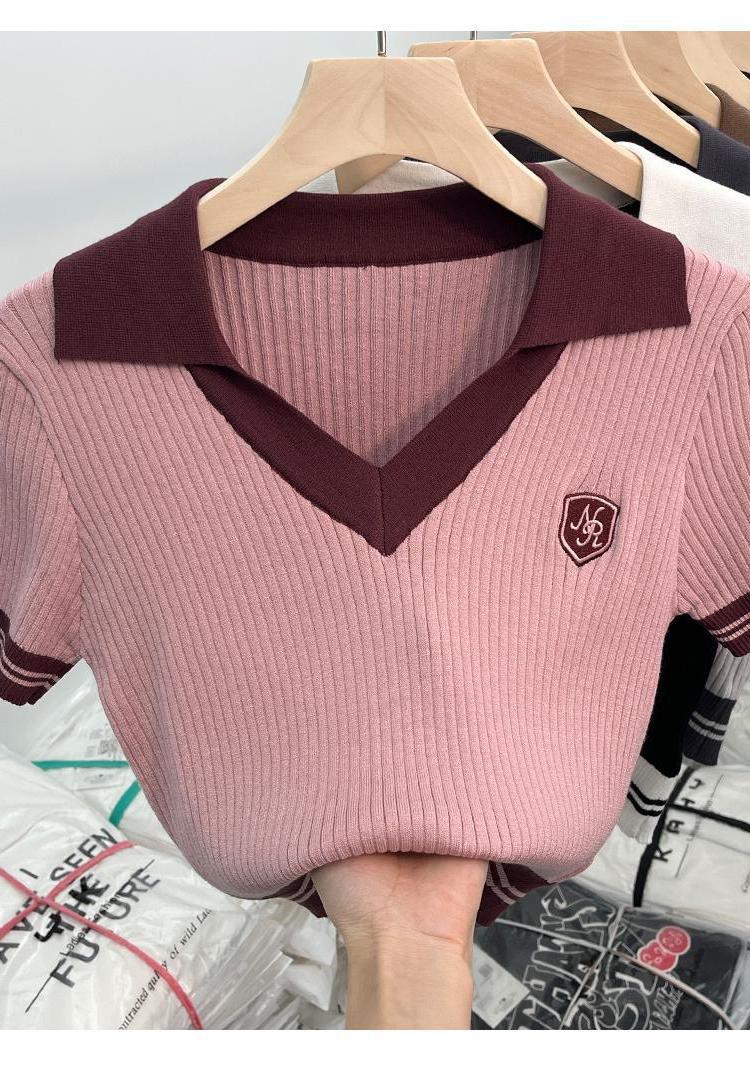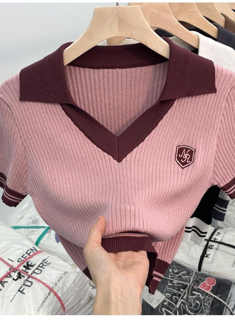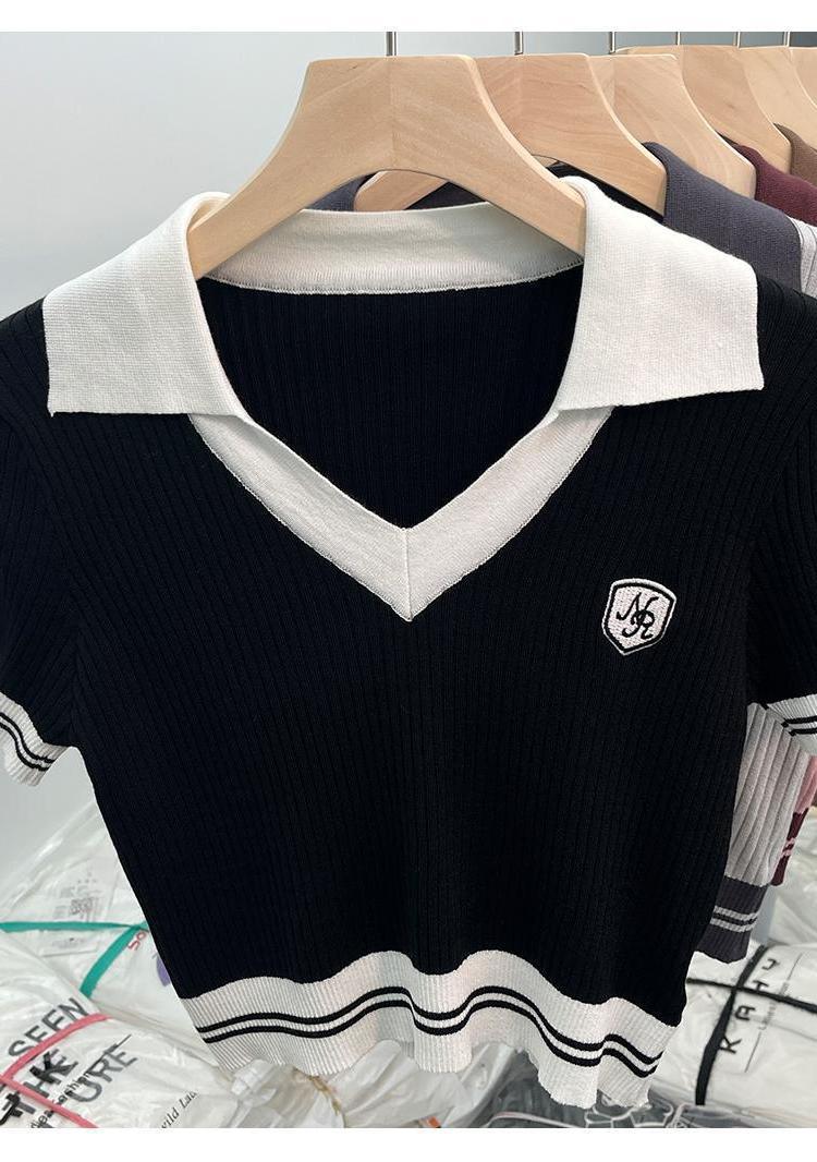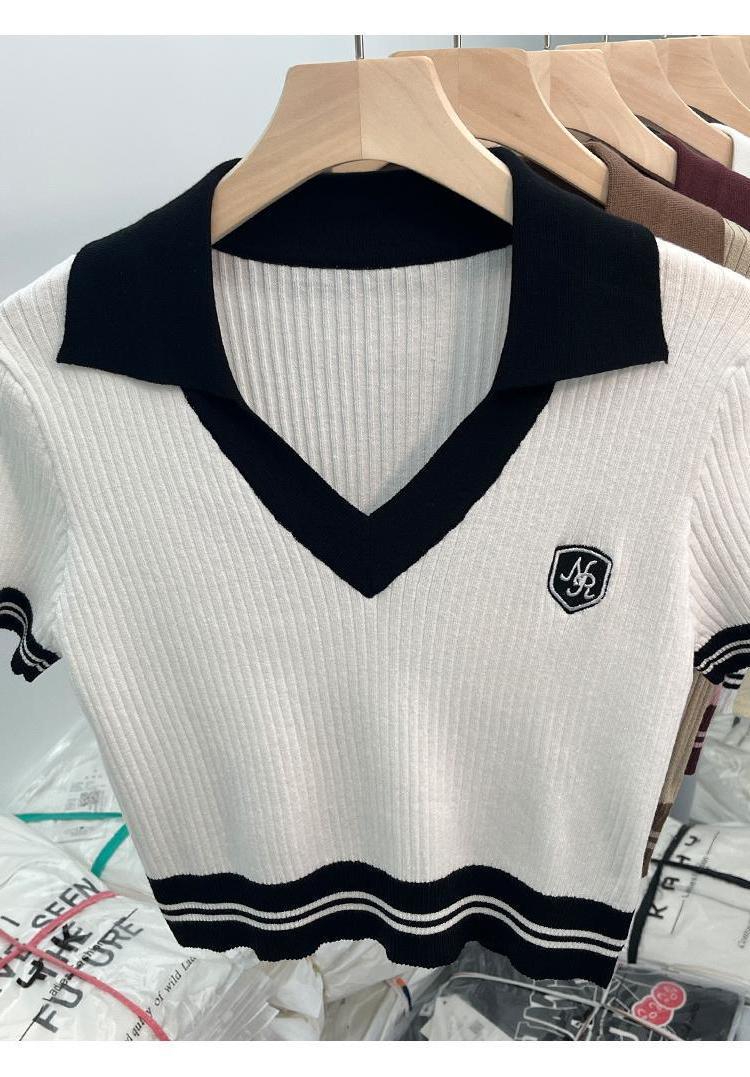 독특한 홍콩 스타일 달콤한 스파이스 소녀 짧은 칼라 니트 탑 디자인 틈새 반팔 셔츠 여성 여름