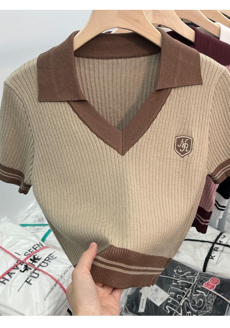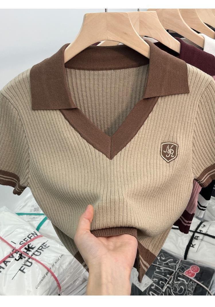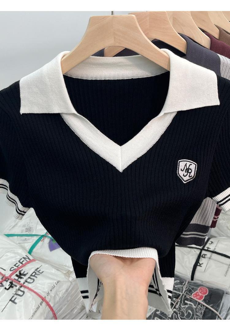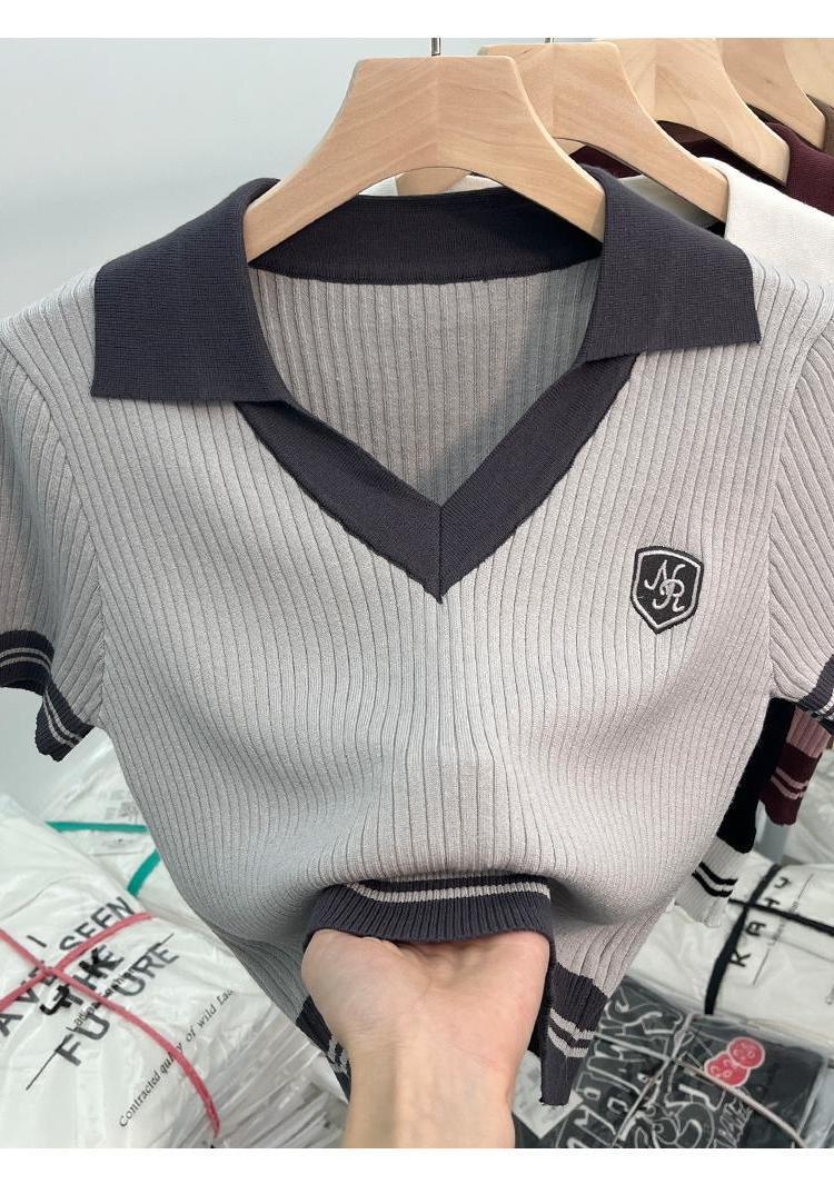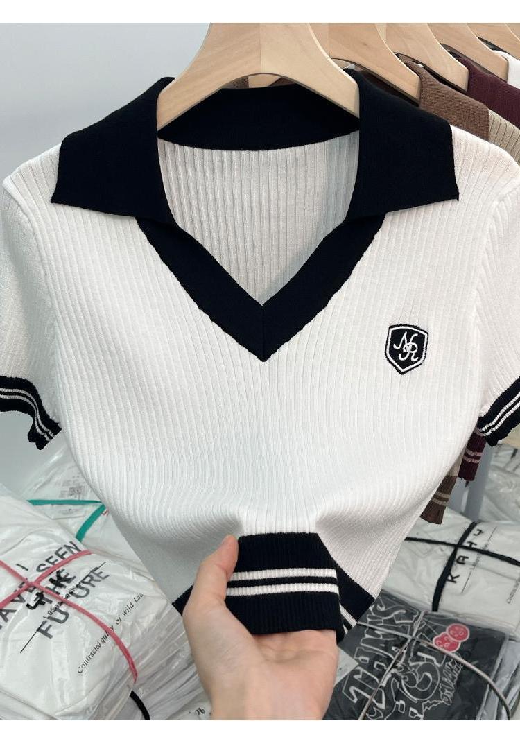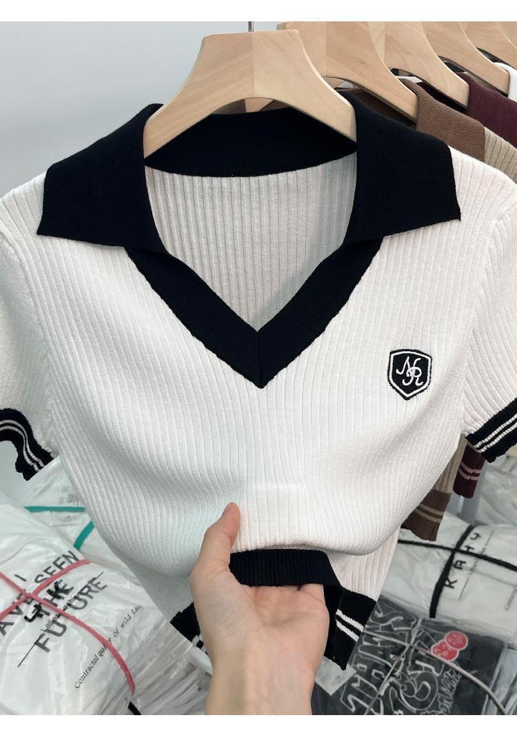 독특한 홍콩 스타일 달콤한 스파이스 소녀 짧은 칼라 니트 탑 디자인 틈새 반팔 셔츠 여성 여름