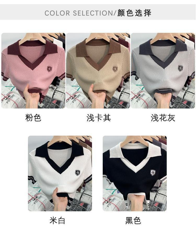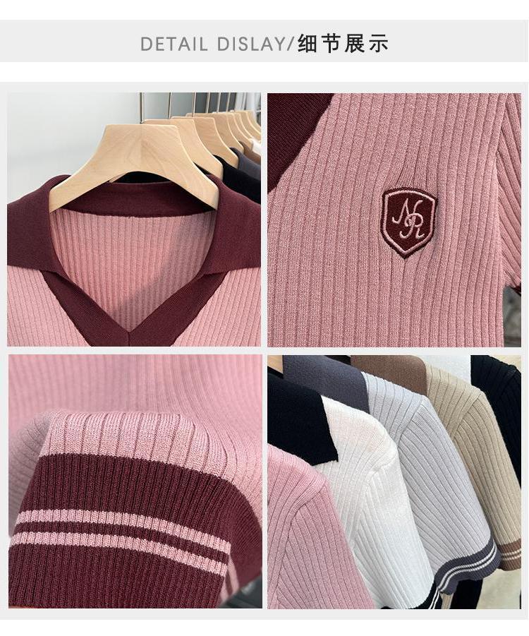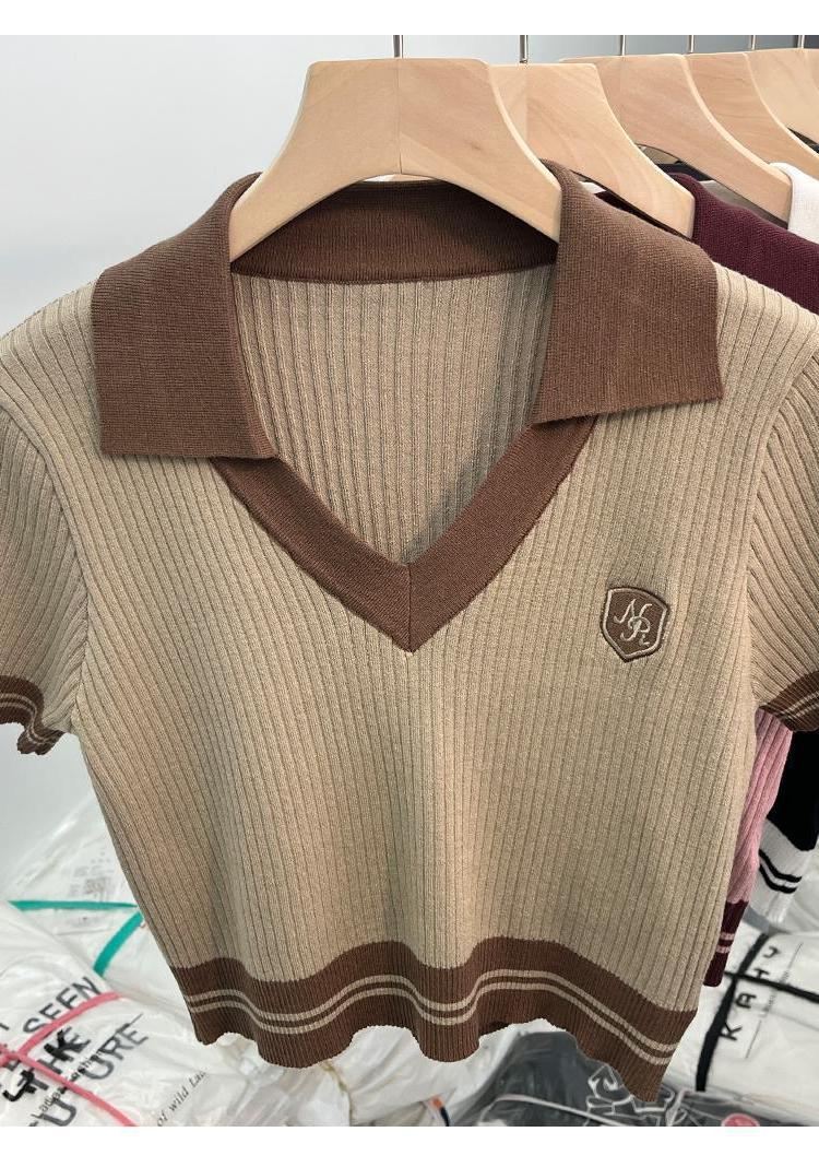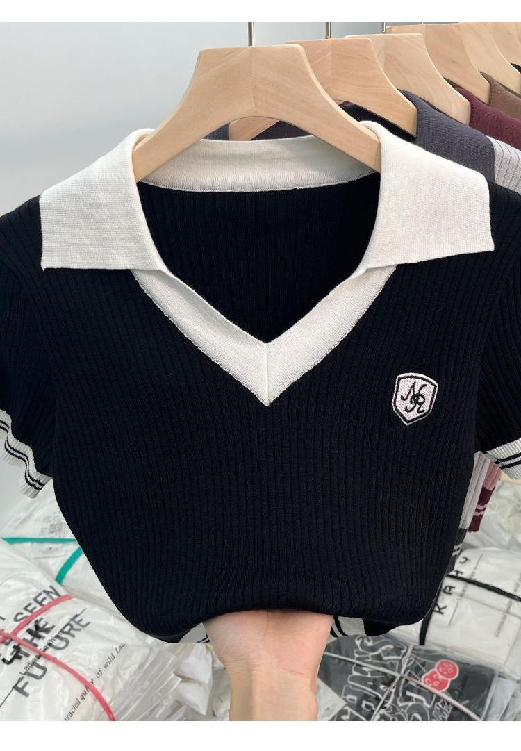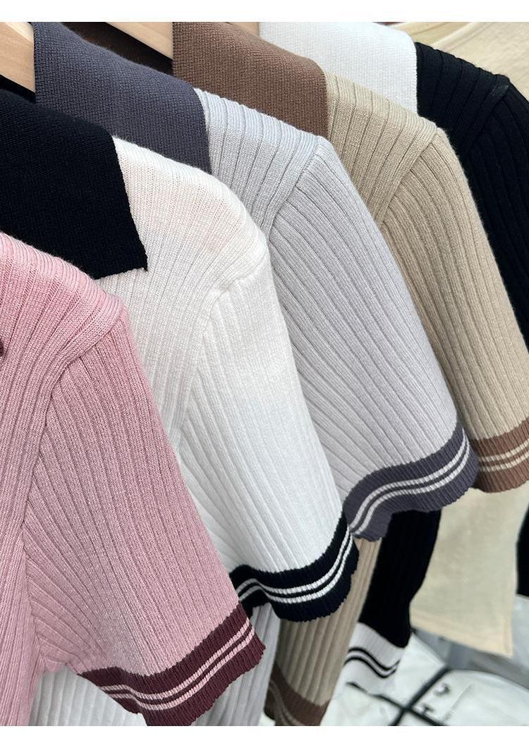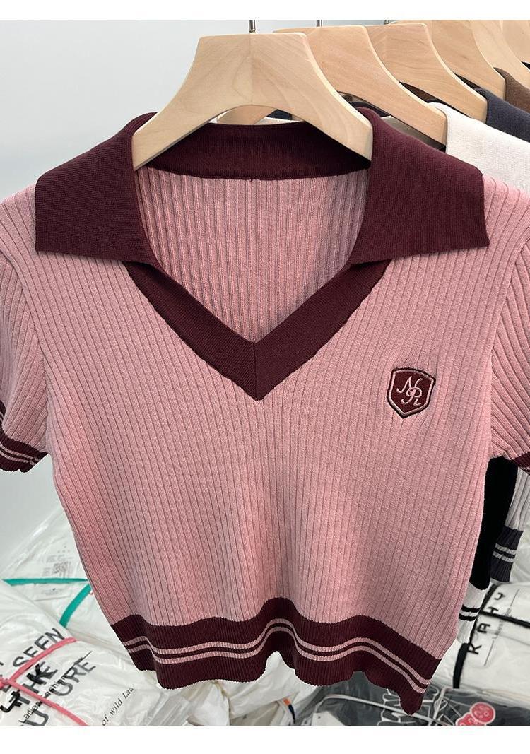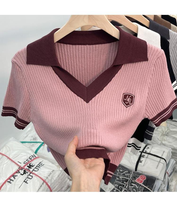독특한 홍콩 스타일 달콤한 스파이스 소녀 짧은 칼라 니트 탑 디자인 틈새 반팔 셔츠 여성 여름스토어 가기