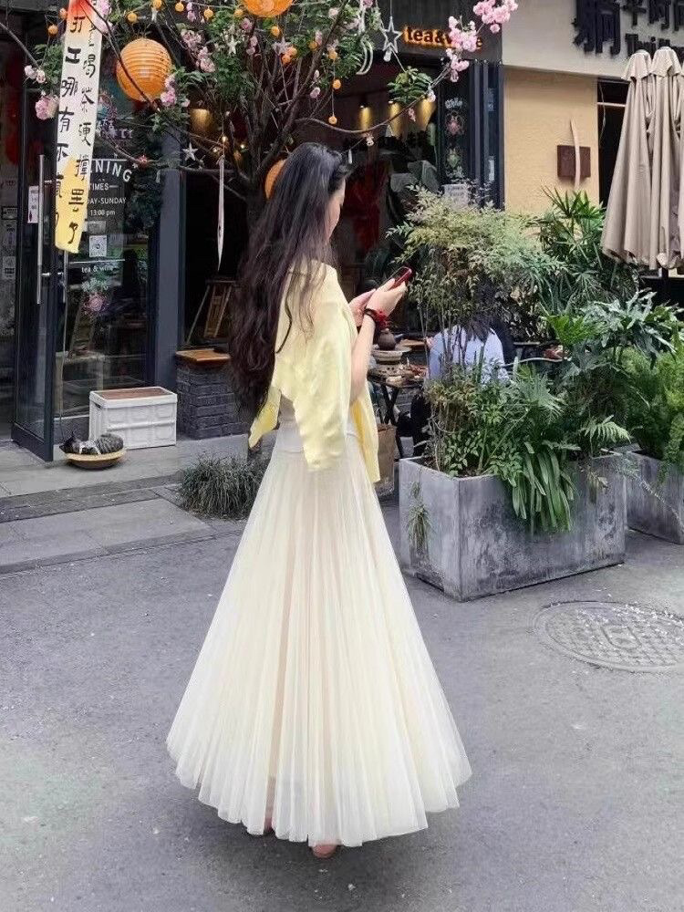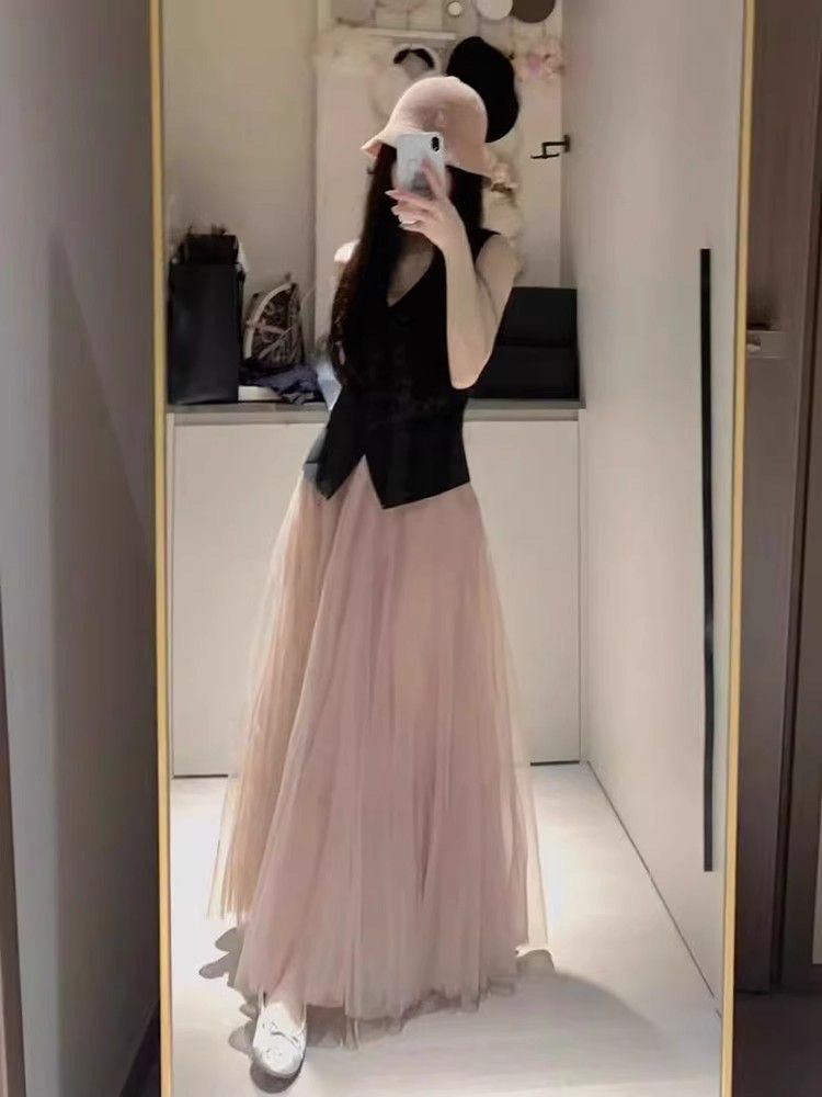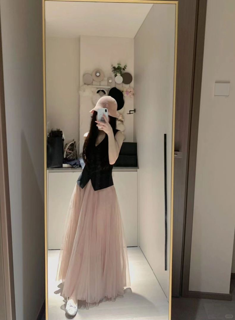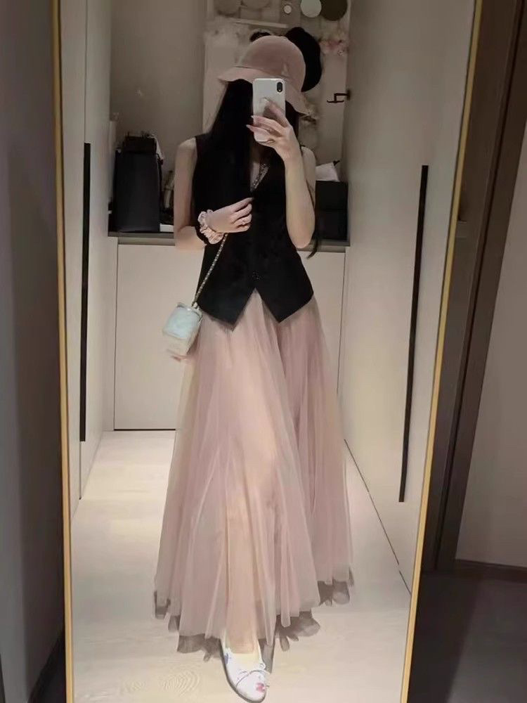 2025 새로운 여름 핑크 A 라인 거즈 스커트 높은 허리 틈새 중간 길이의 거즈 스커트 여성 슈퍼 페어리 우산 스커트 복용량