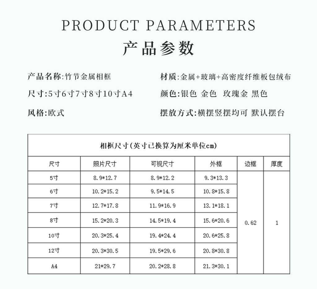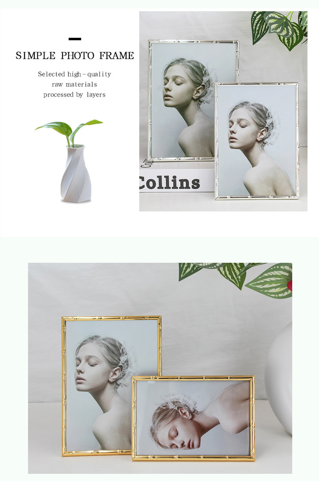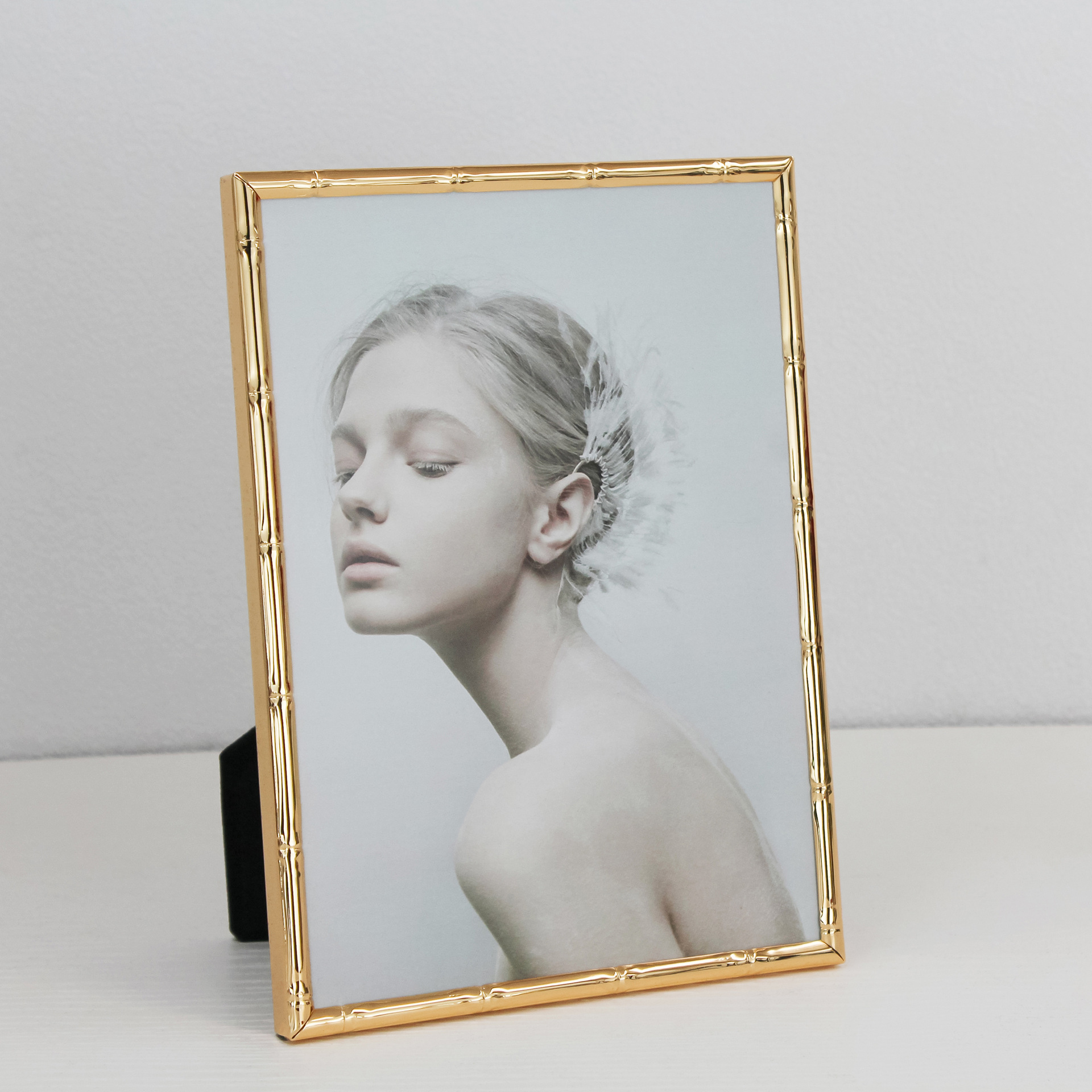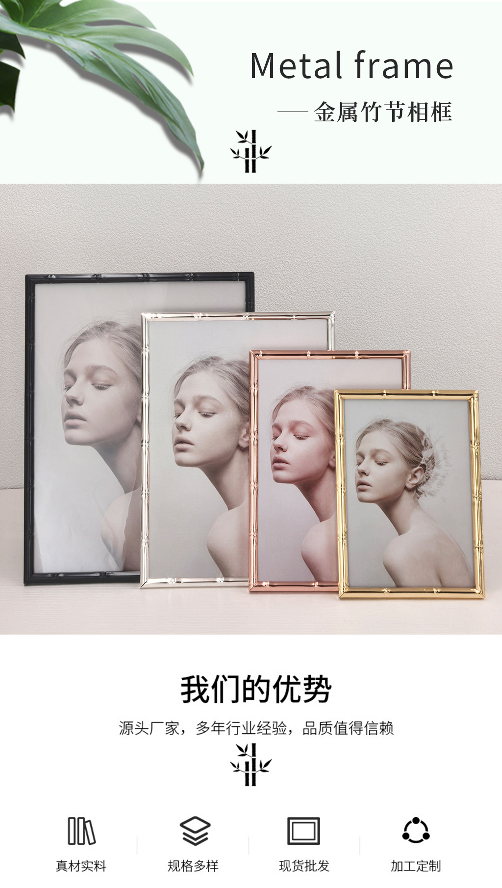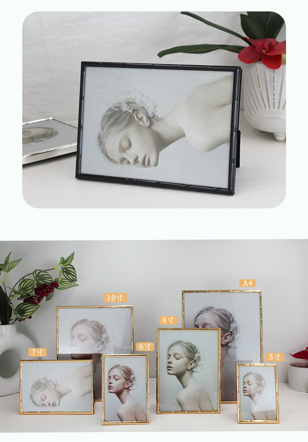 심플한 좁은 테두리의 대나무 무늬 금속 액자, 철제 골드 컬러 7inch A4 사이즈, 벽걸이형 사진액자, 서재용 그림액자
