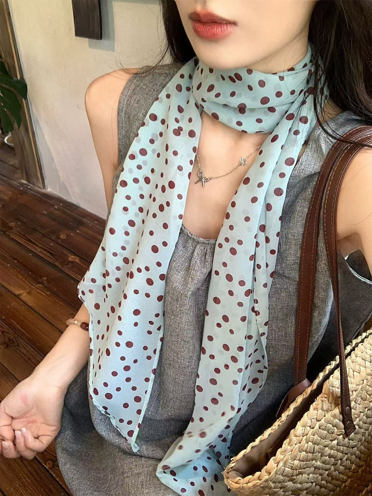 긴 설문 조사 도트 로즈 스카프 여성의 봄과 여름 2025 새로운 목 보호 고급 센스 헤어 밴드 시폰 넥 보호 스카프스토어 가기