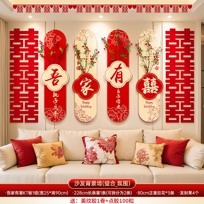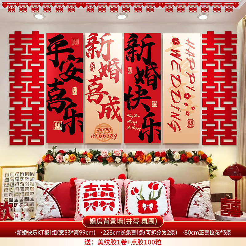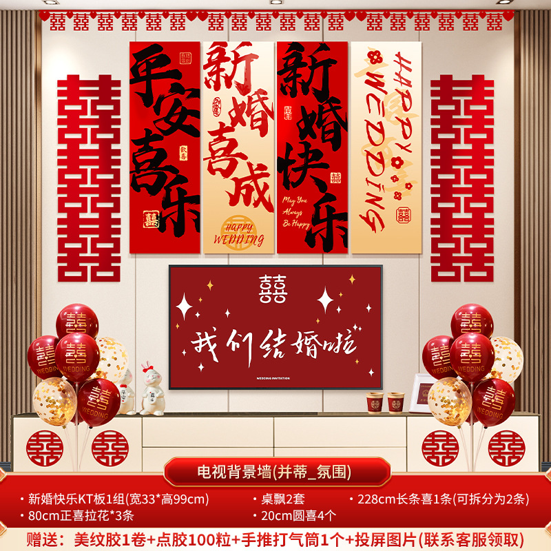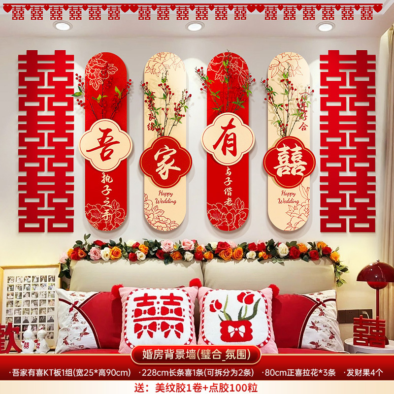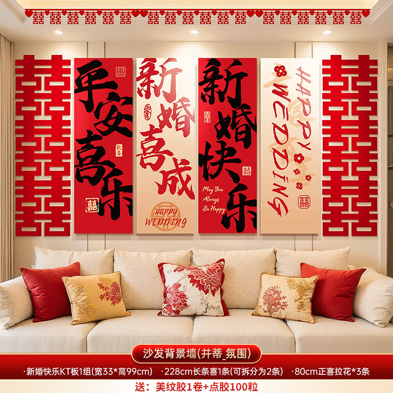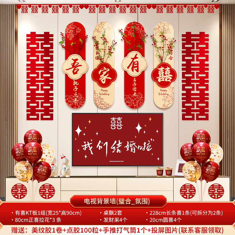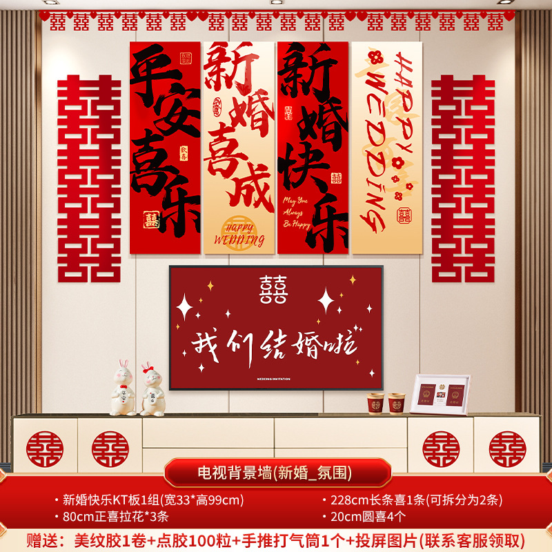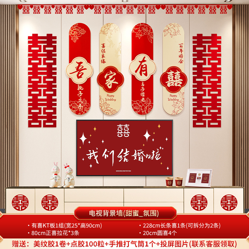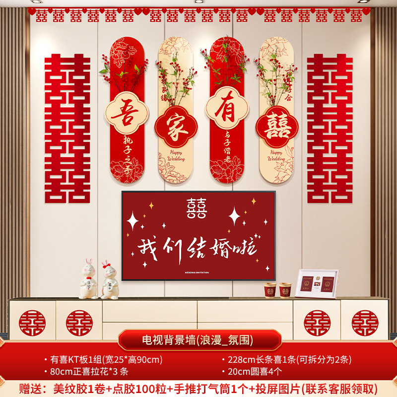 결혼식 레이아웃 세트 행복한 단어 kt 보드 남자와 여자의 광장 거실 침실 TV 배경 벽 장식 행복한 단어 꽃