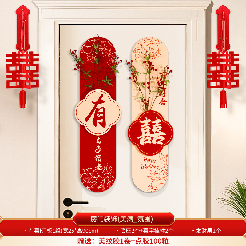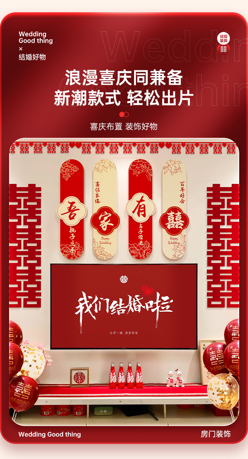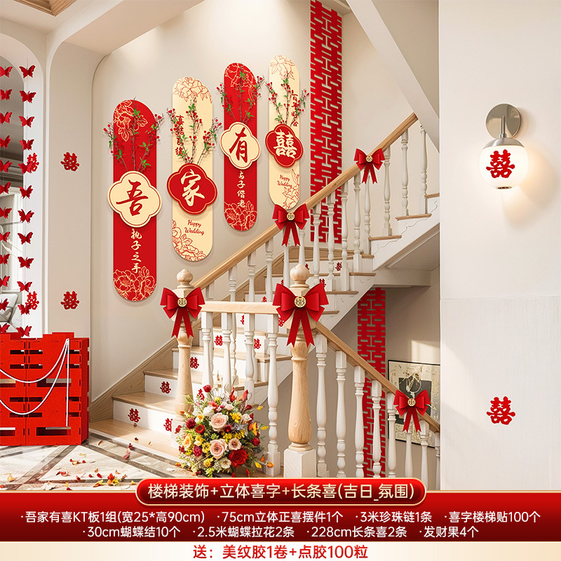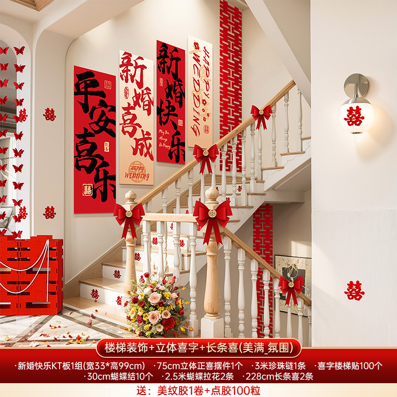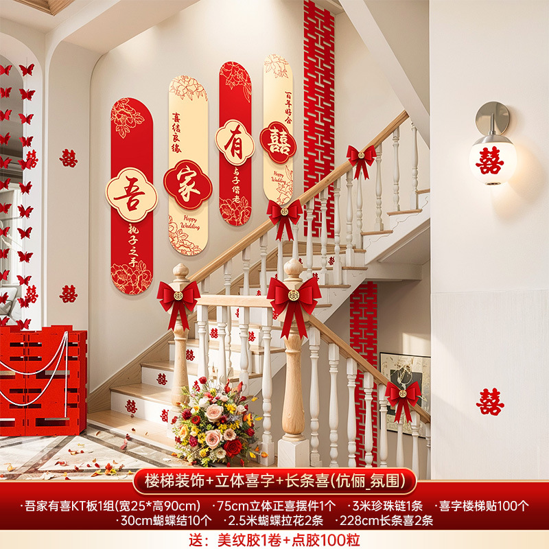 婚房布置女方卧室长条喜字拉花挂饰男方新房结婚装饰背景折纸挂件新中式婚房布置套装网红蝴蝶结男方女方婚房装饰拉花套餐结婚用品