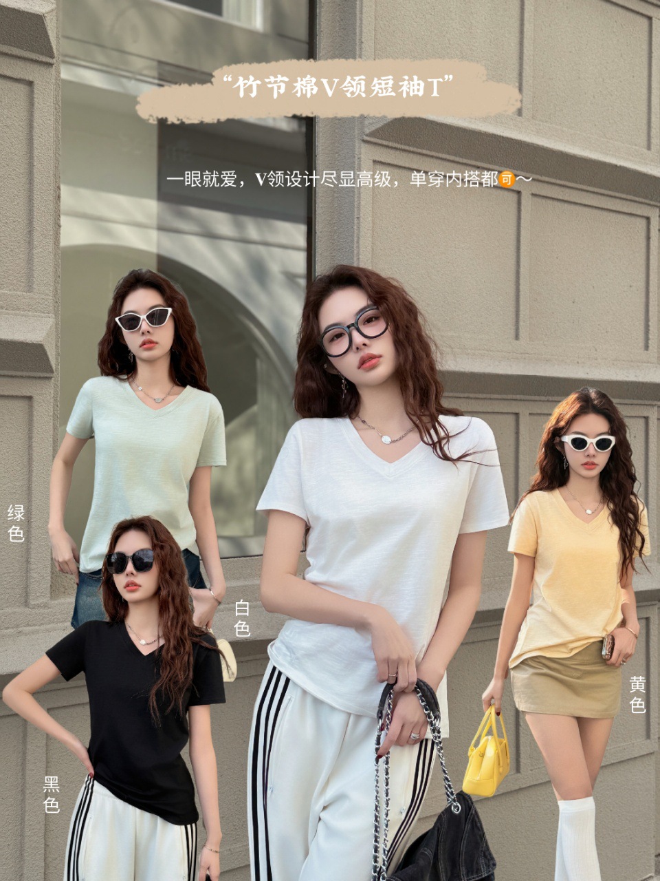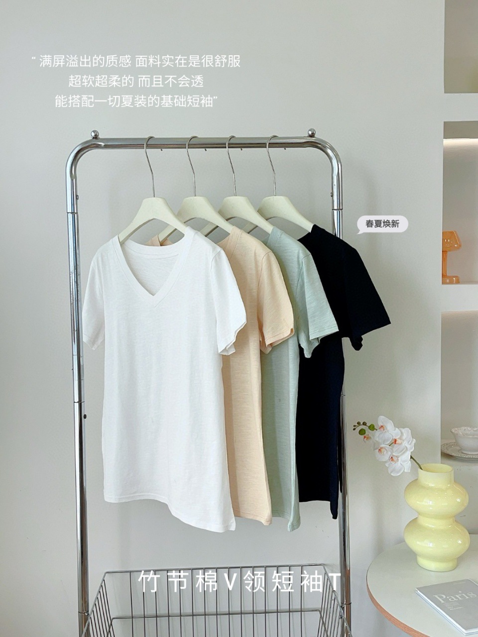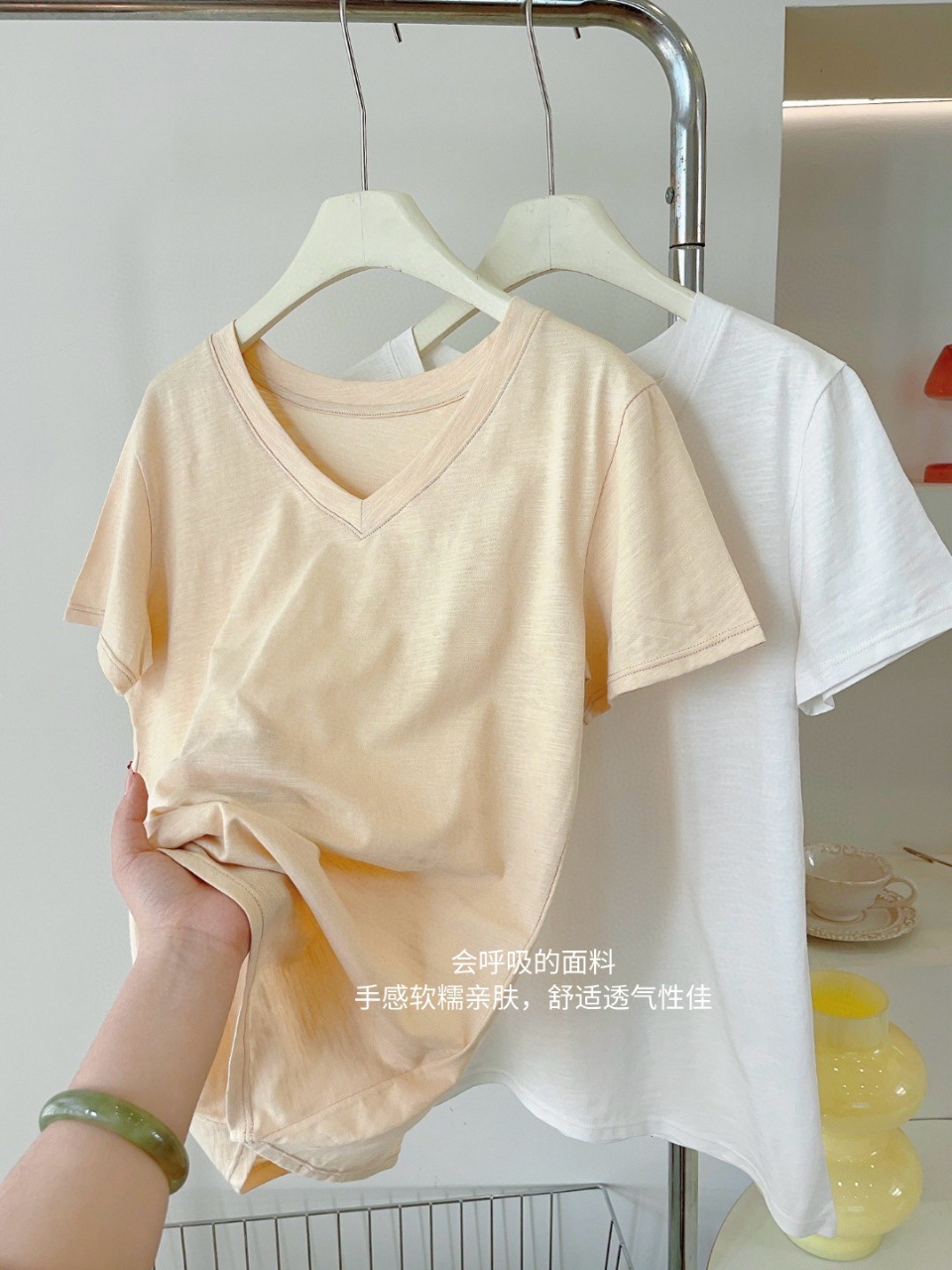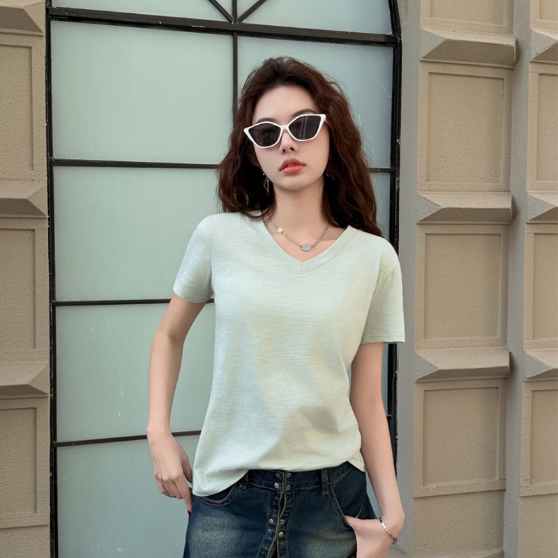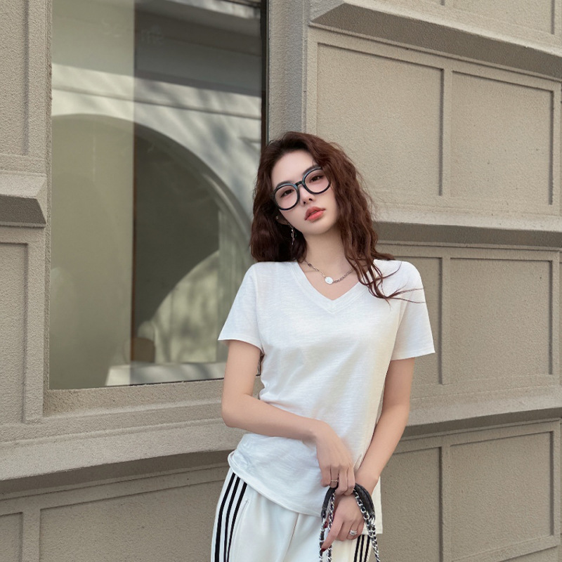 화이트 대나무 코튼 소재의 여성용 여름 반팔 티셔츠, 활용도 높은 숏탑, 브이넥 캐주얼 베이직 티셔츠, 루즈핏스토어 가기