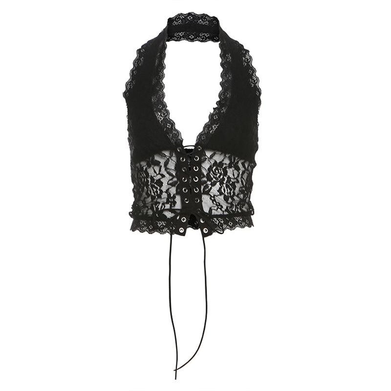 유럽과 미국의 2025 봄 새로운 여성의 순수 스파이스 소녀 레이스 디자인 V 넥 관점 민소매 짧은 탑