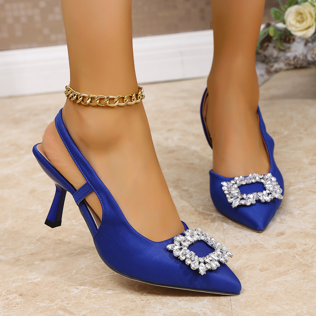 플러스 사이즈 Baotou 하이힐 샌들 여성 2025 년 여름 새로운 유럽과 미국 패션 포인팅 헤드 라인스톤 스퀘어 버클 얇은 힐 패션 샌들