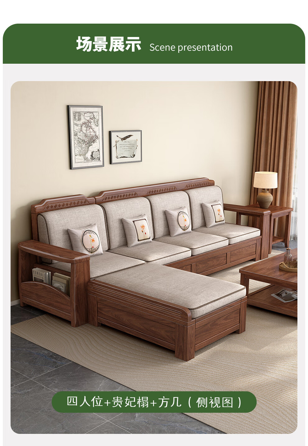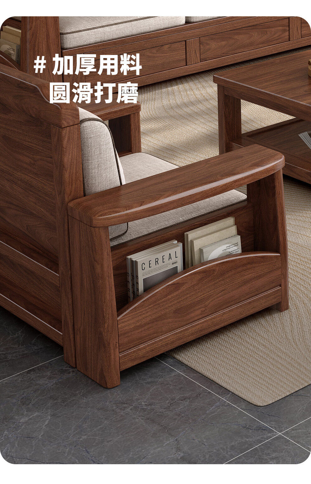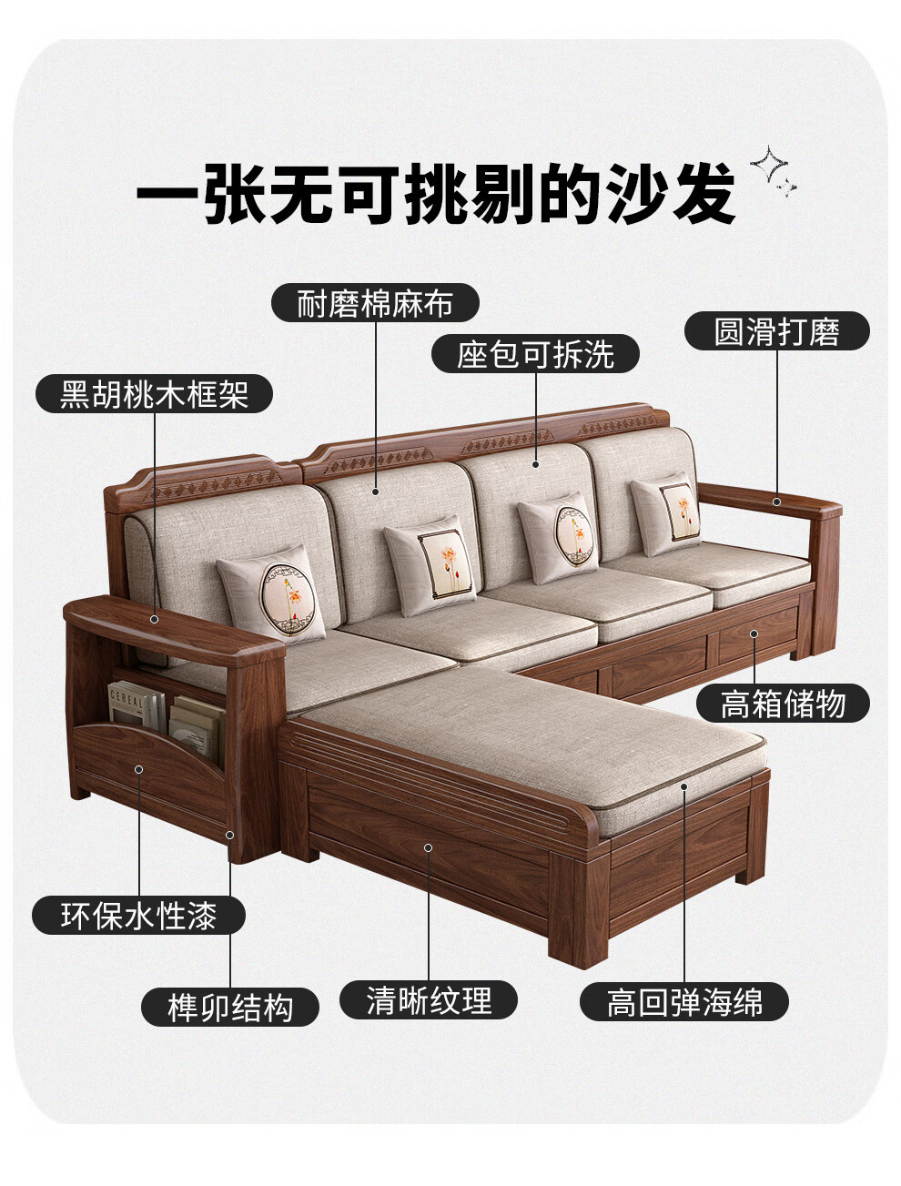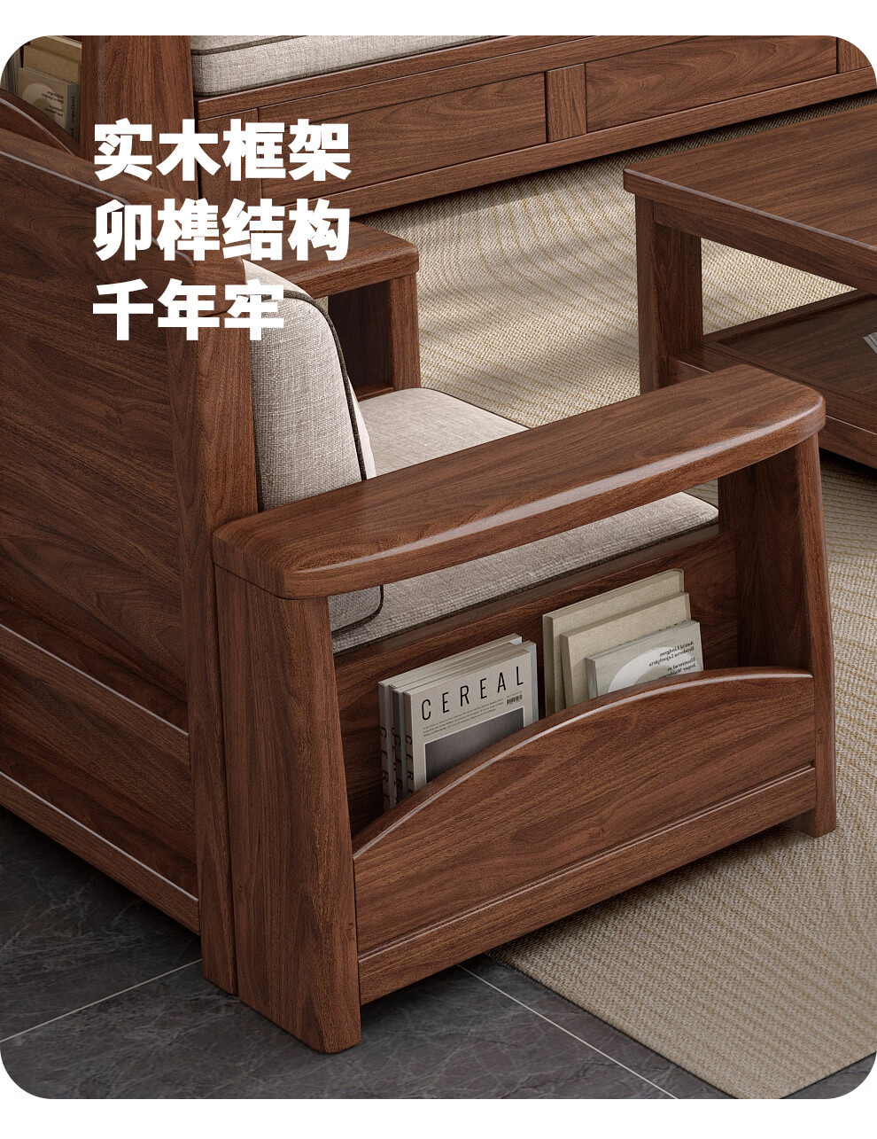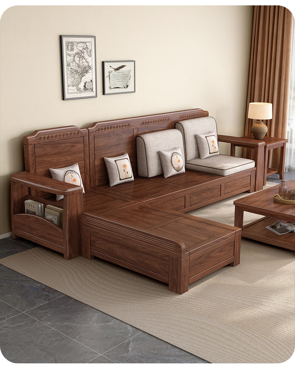 새로운 중국 스타일 블랙 호두 솔리드 우드 소파 거실 현대 간단한 작은 아파트 팔걸이 저장 상자 유형 나무 소파스토어 가기