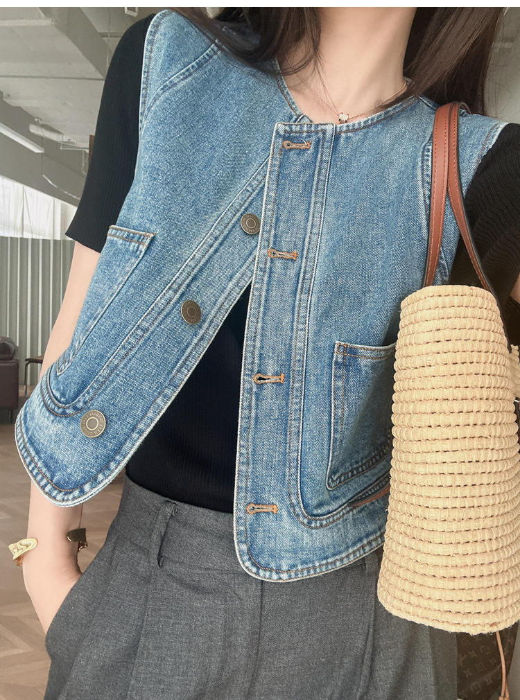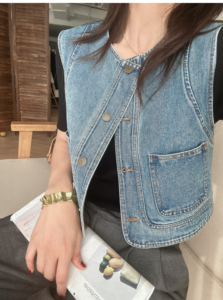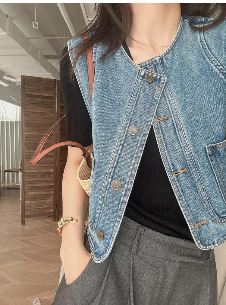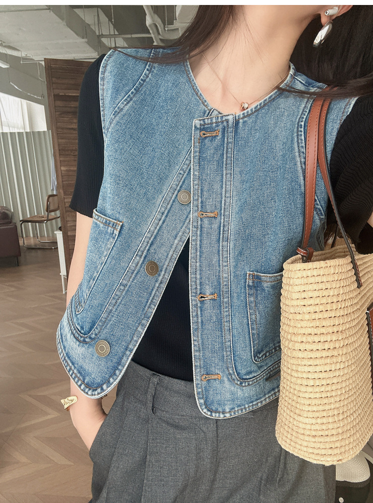 유행과 서양식 올매치 쌓인 데님 조끼 여성 봄과 여름 느슨한 짧은 민소매 재킷 캐주얼 탑
