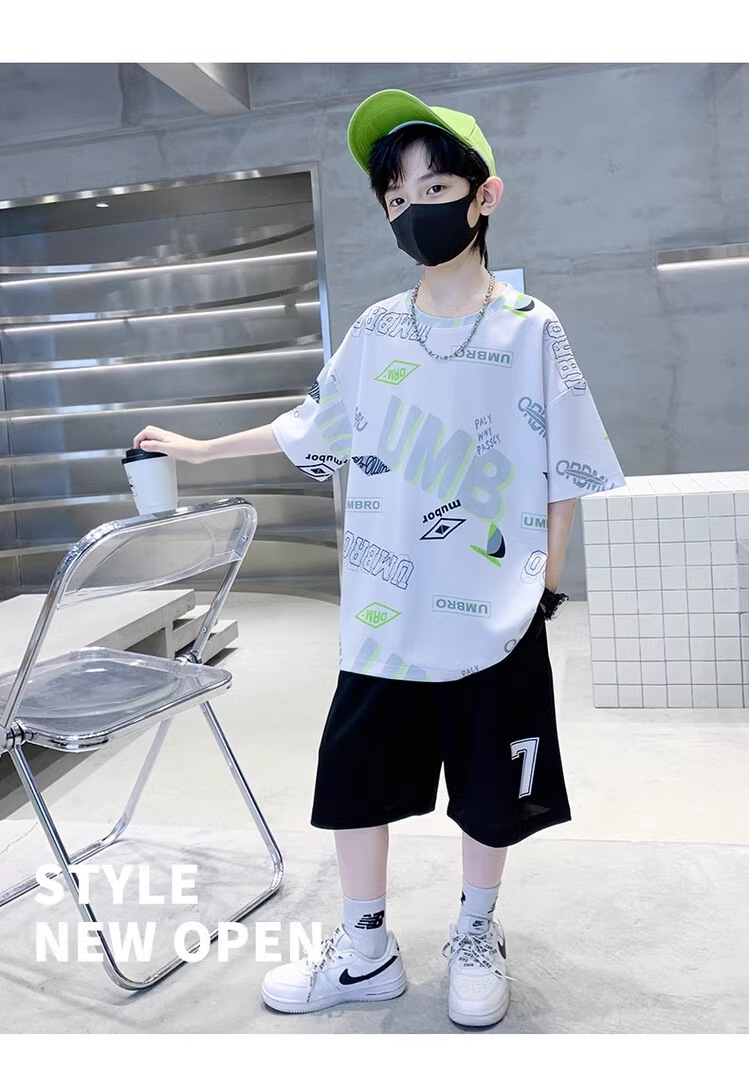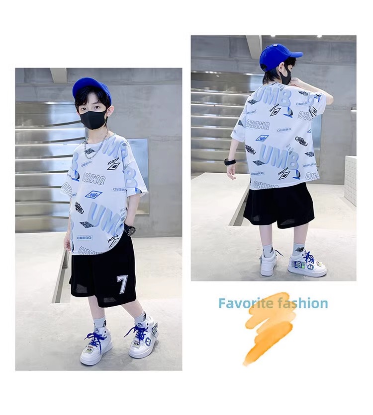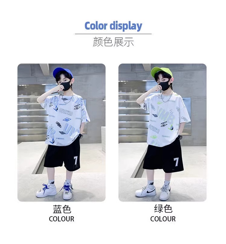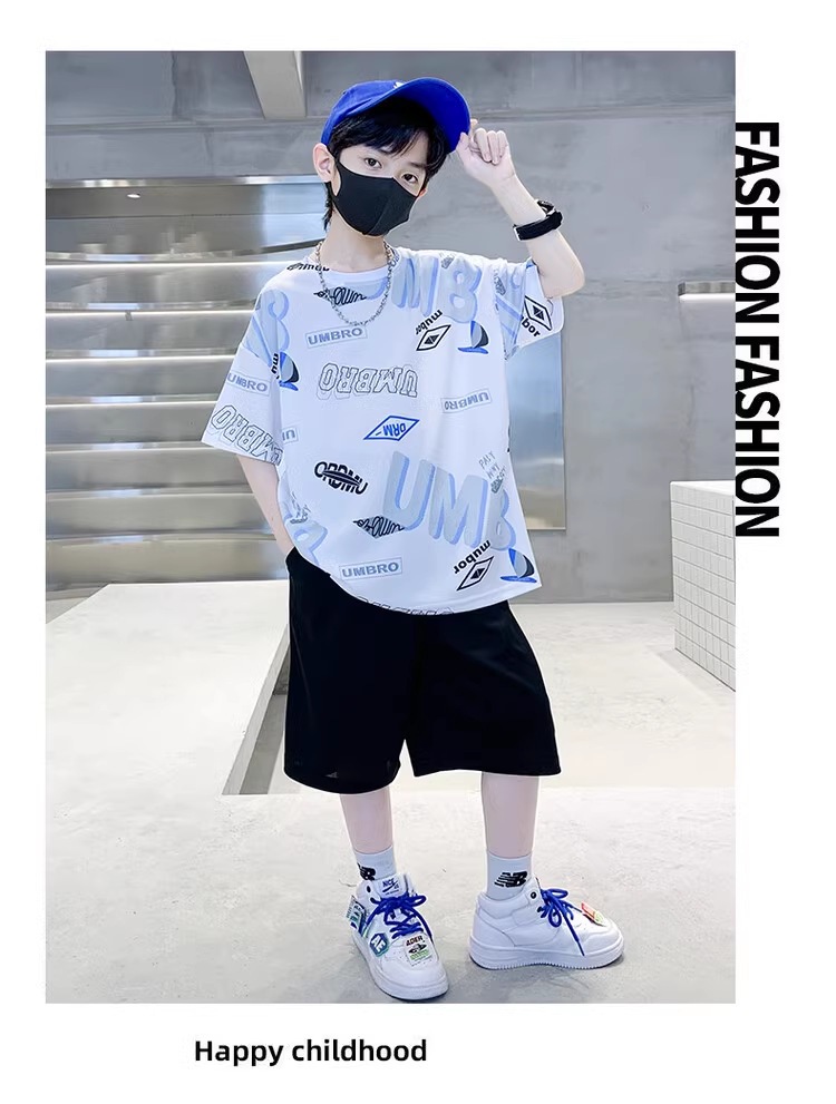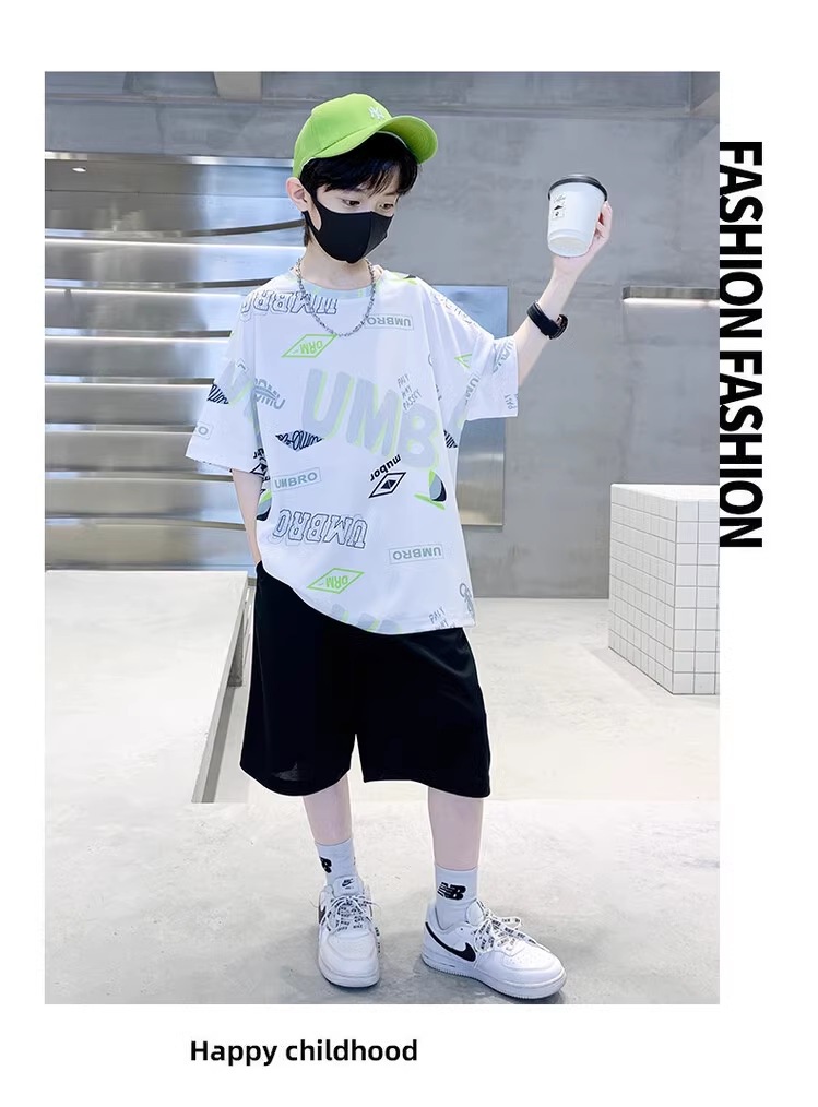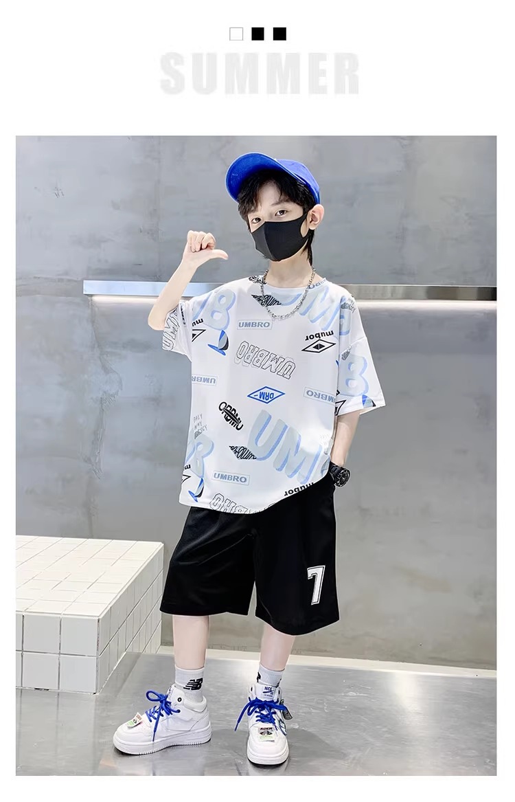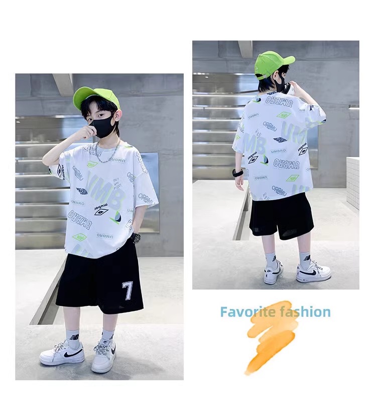 25 여름 새로운 어린이 반팔 반바지 세트 작은 소년의 편지 인쇄 둥근 목 캐주얼 스포츠 투피스 세트