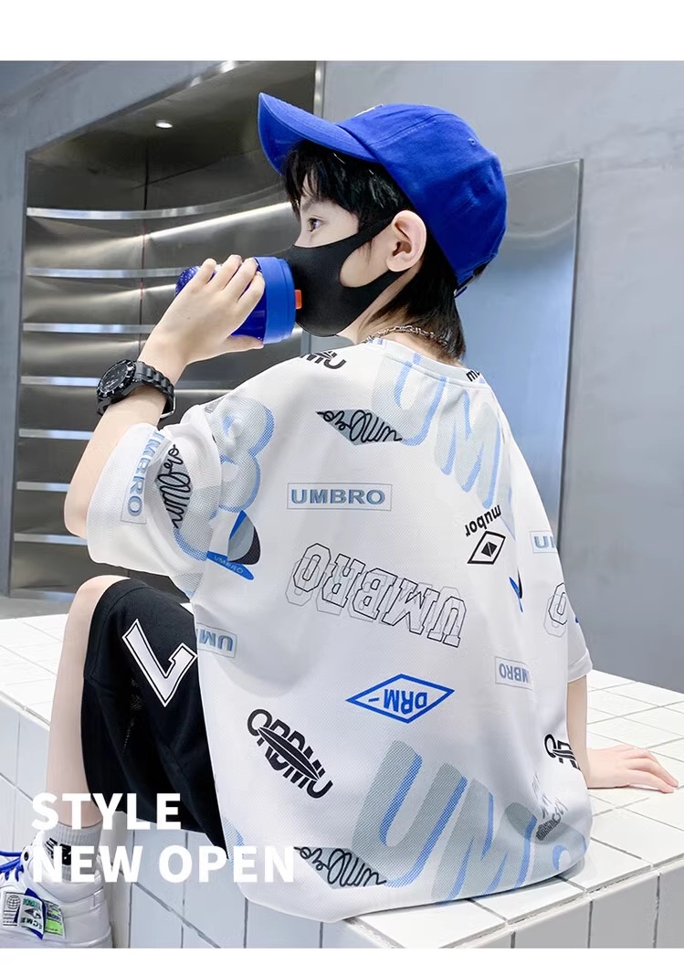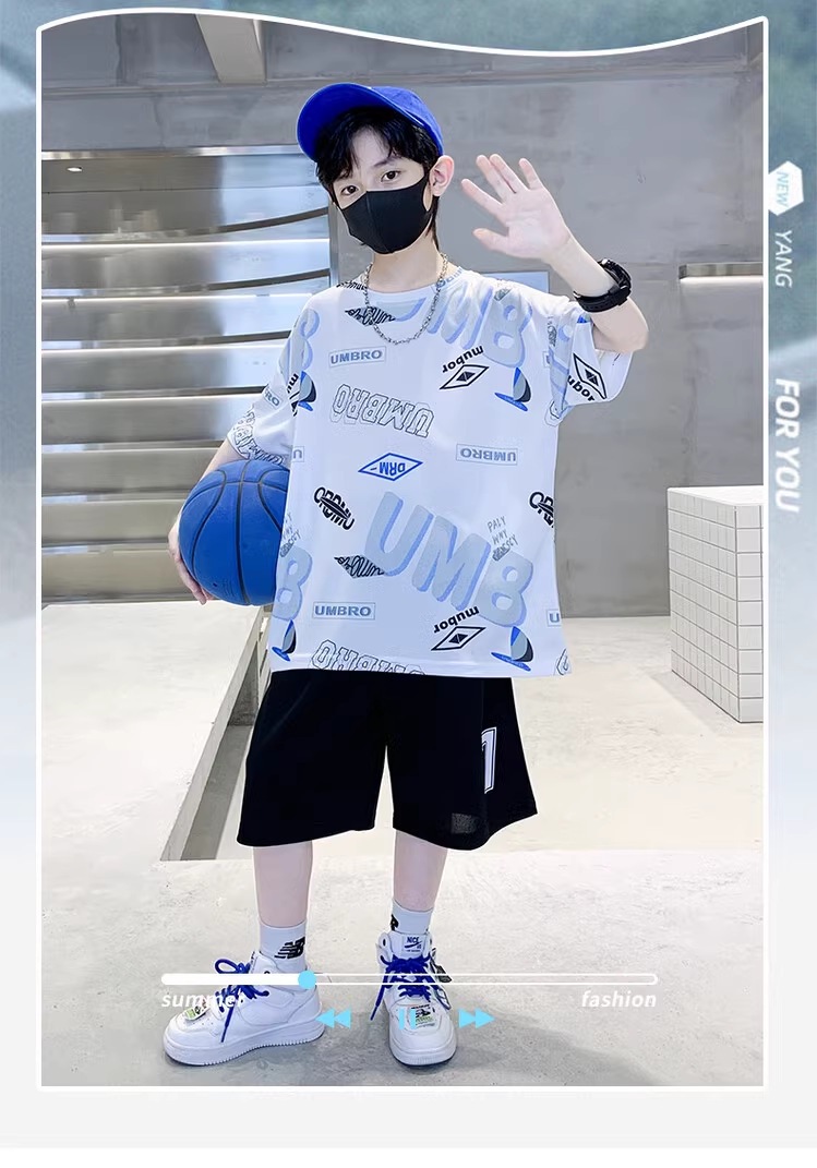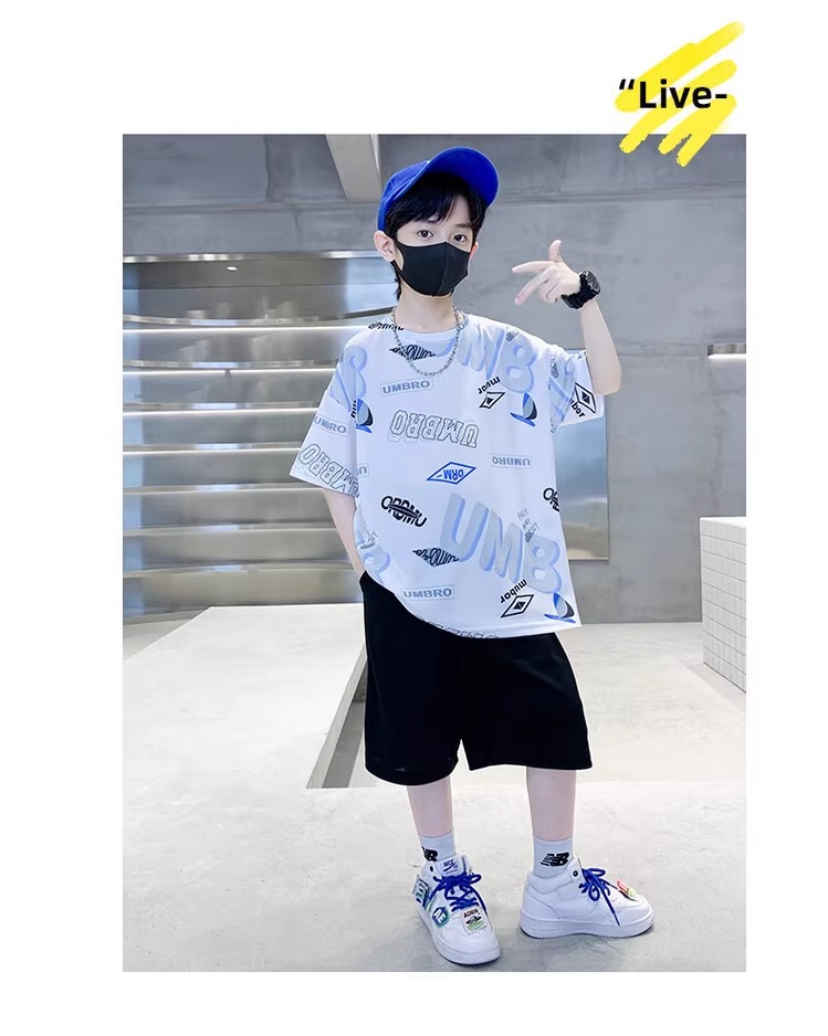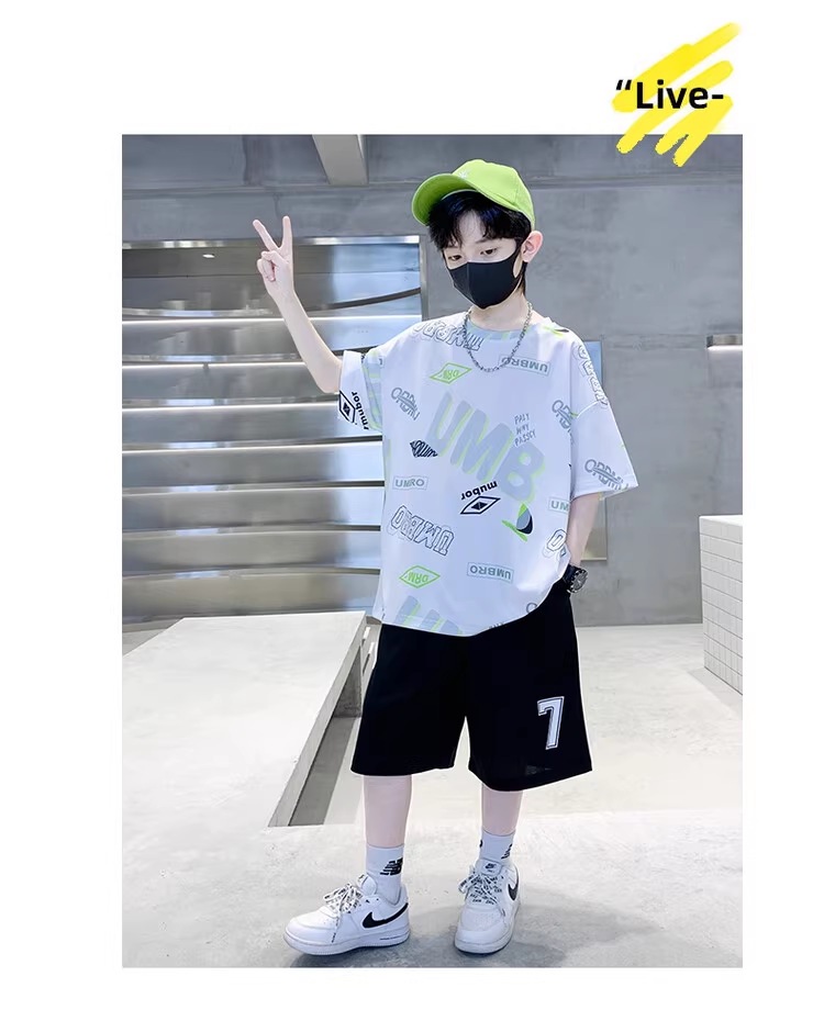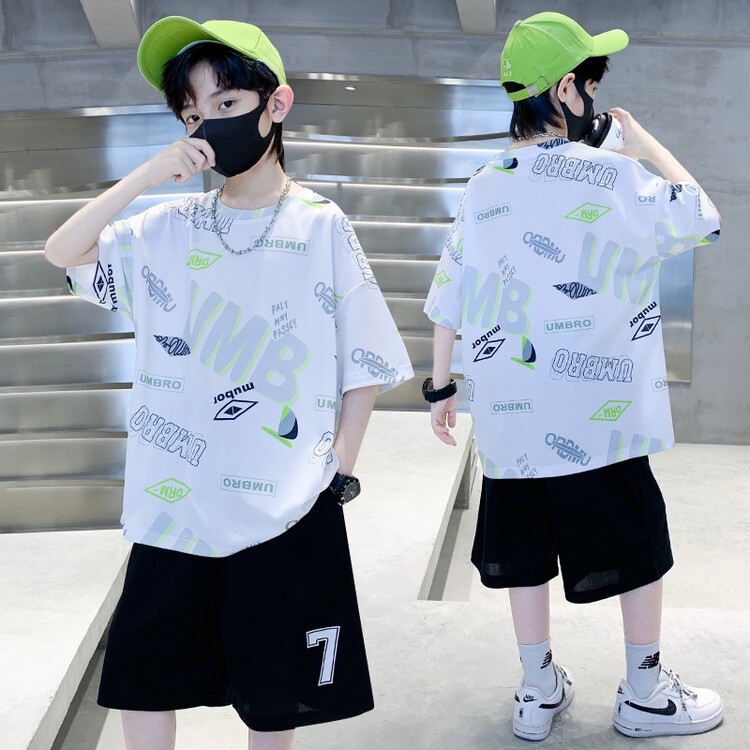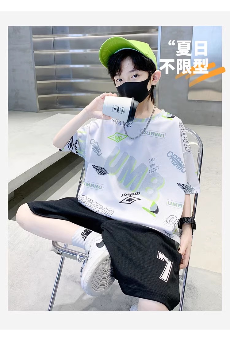 25 여름 새로운 어린이 반팔 반바지 세트 작은 소년의 편지 인쇄 둥근 목 캐주얼 스포츠 투피스 세트