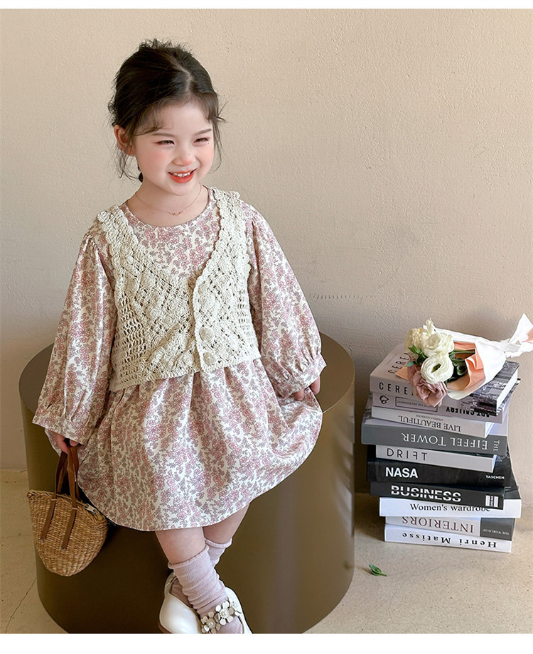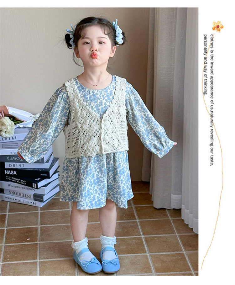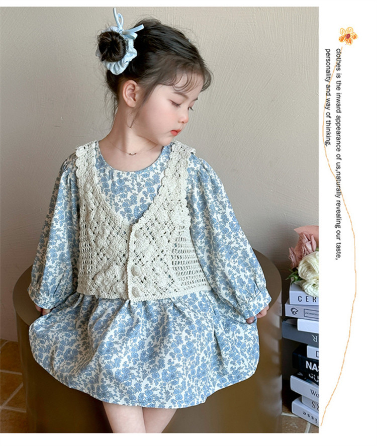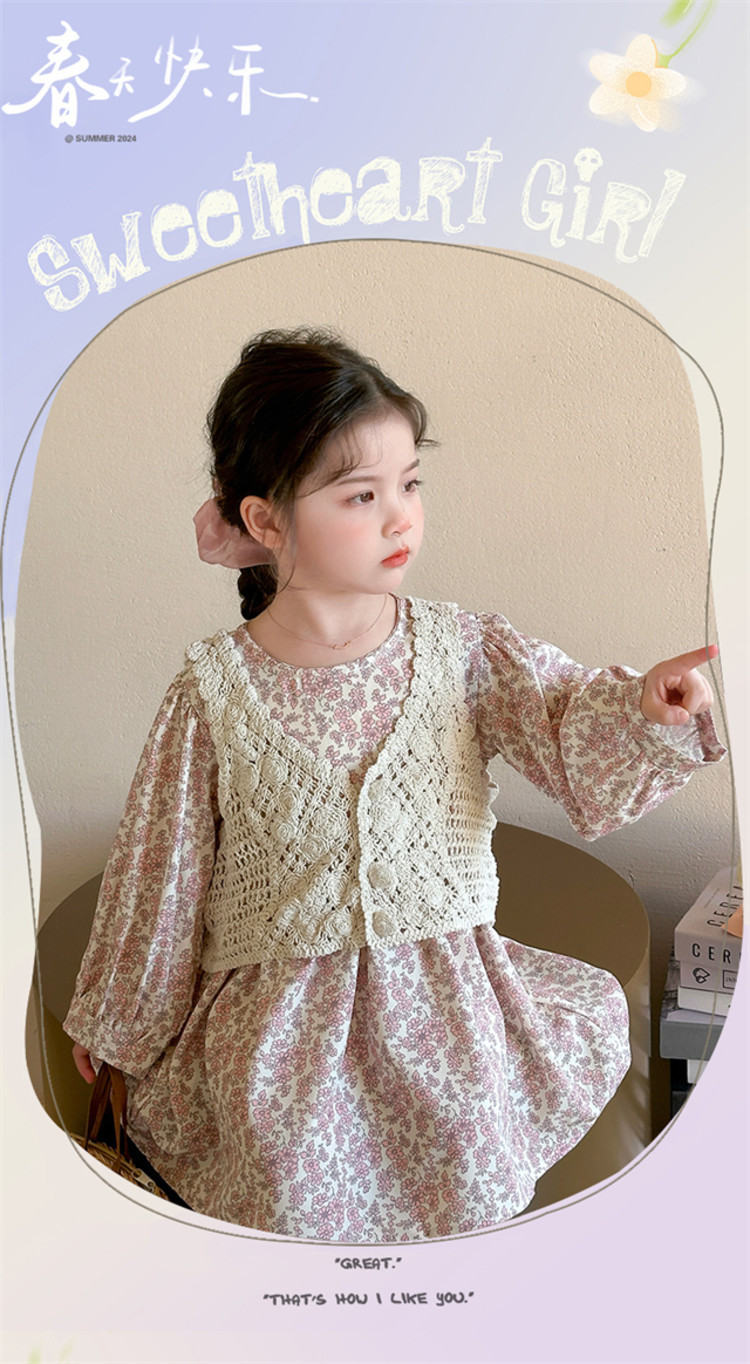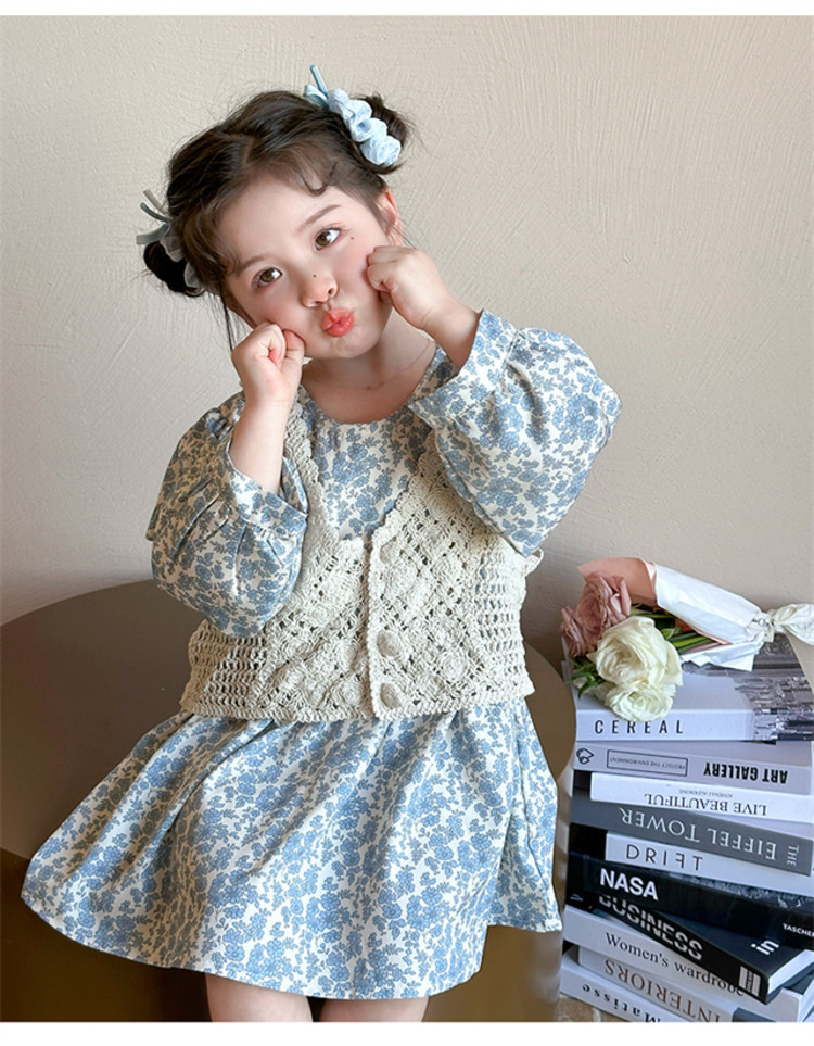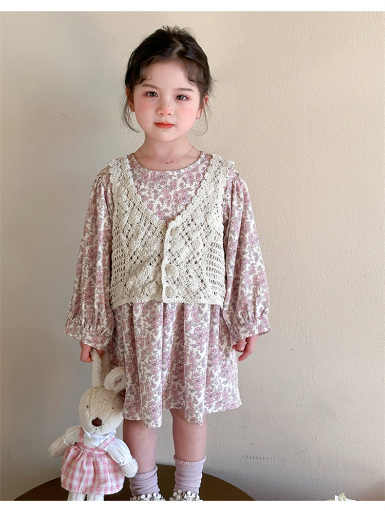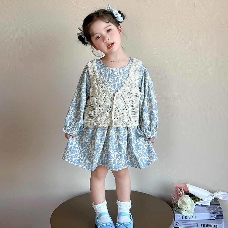 소녀 봄 원피스 2025 새로운 짠 조끼 꽃 원피스 두 조각 달콤한 귀여운 긴 소매 꽃 원피스