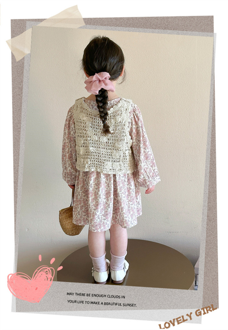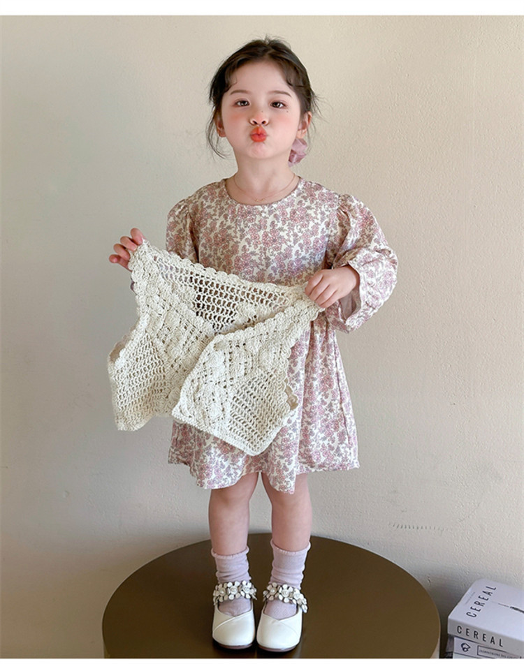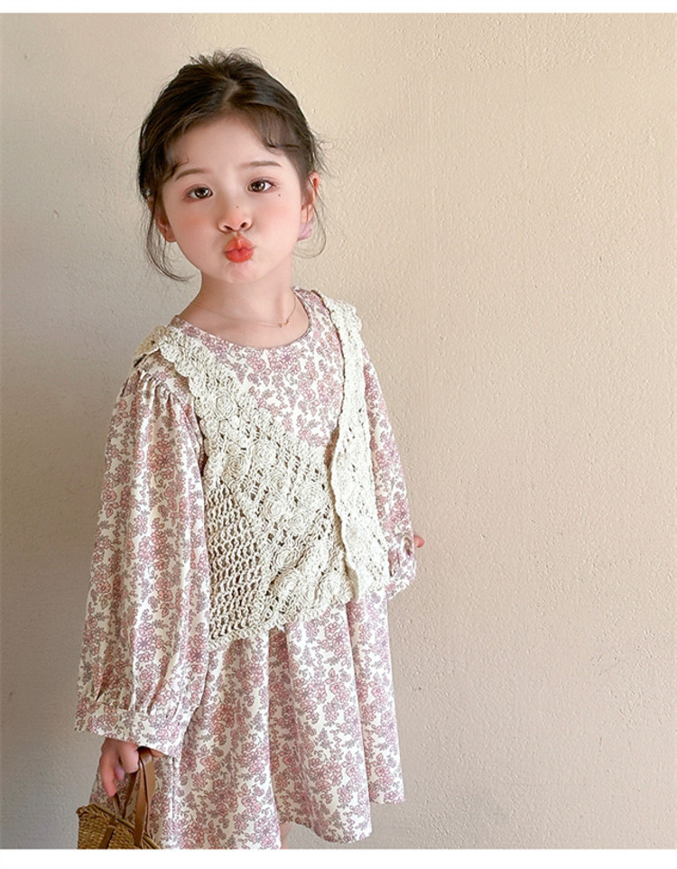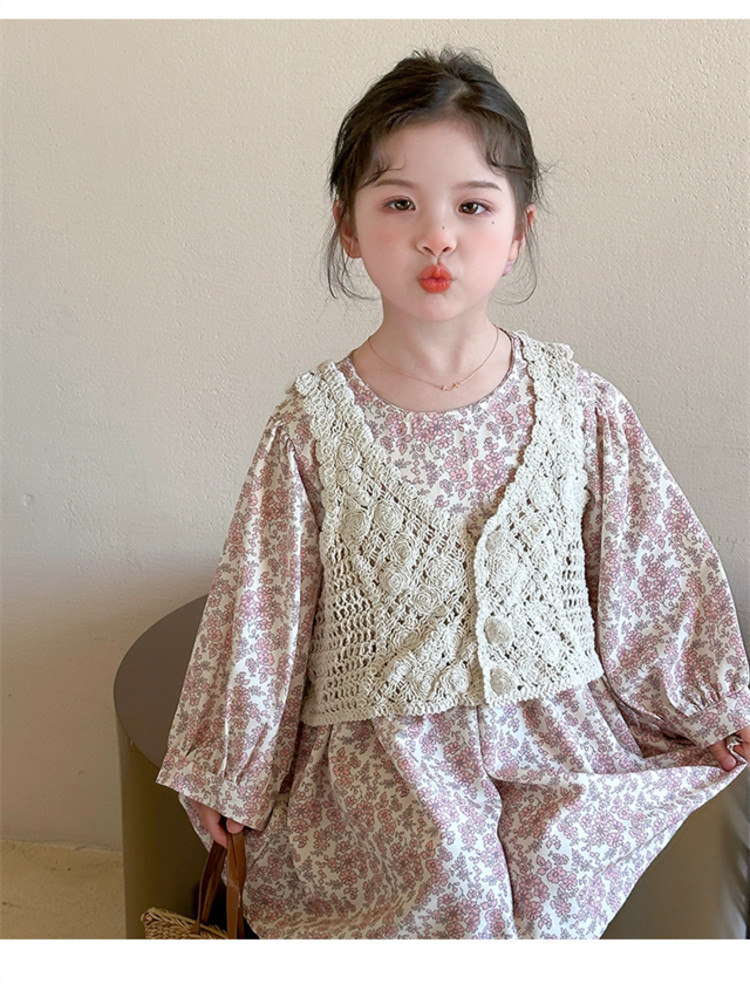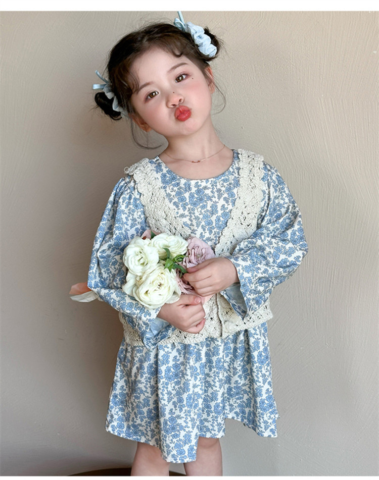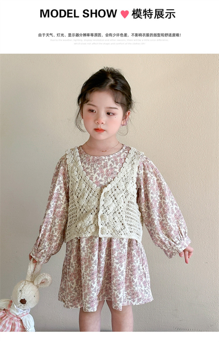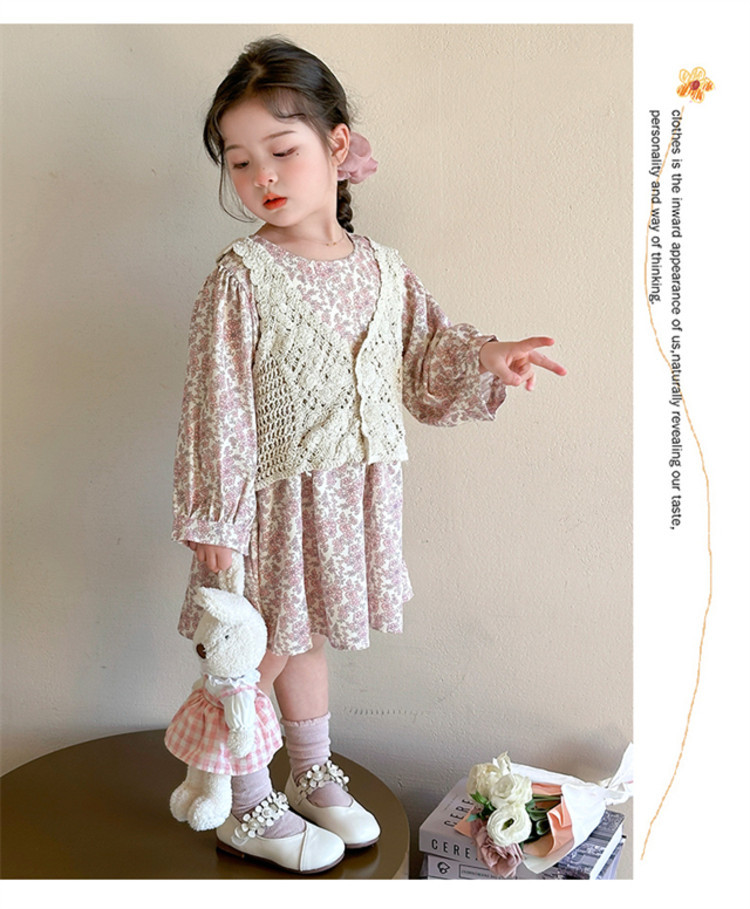 소녀 봄 원피스 2025 새로운 짠 조끼 꽃 원피스 두 조각 달콤한 귀여운 긴 소매 꽃 원피스