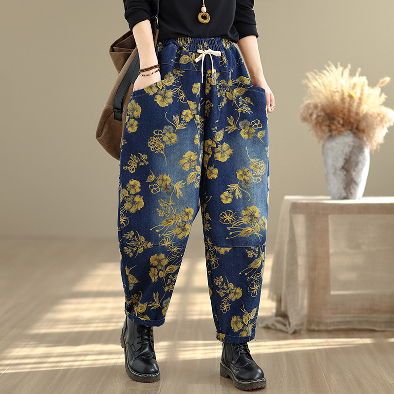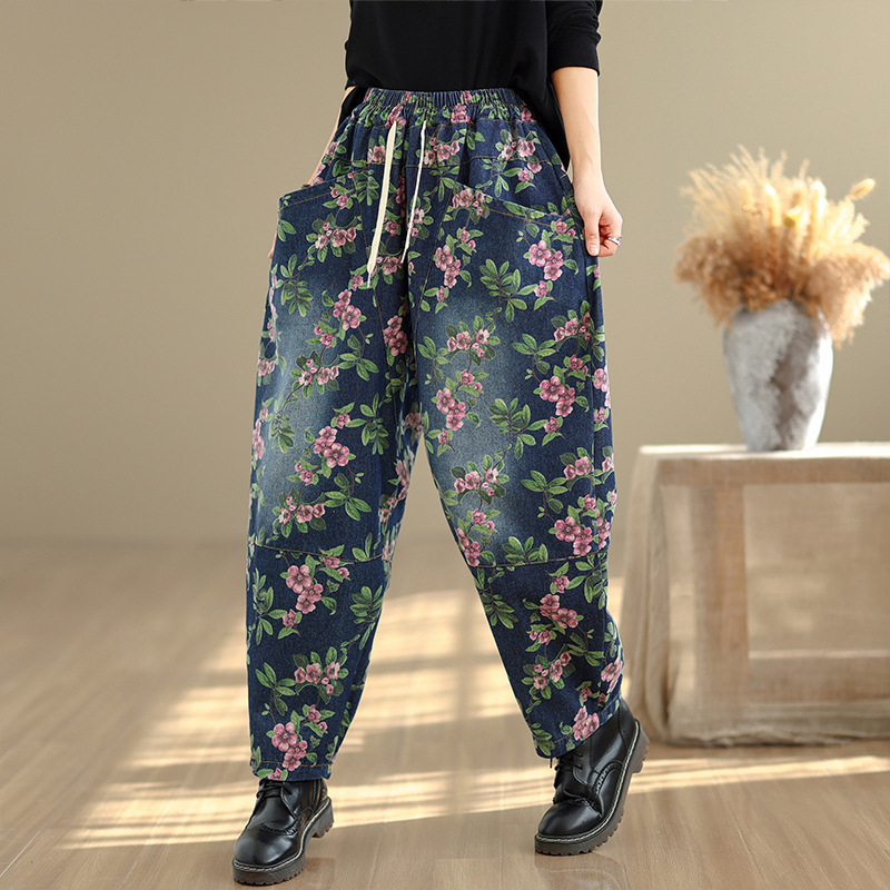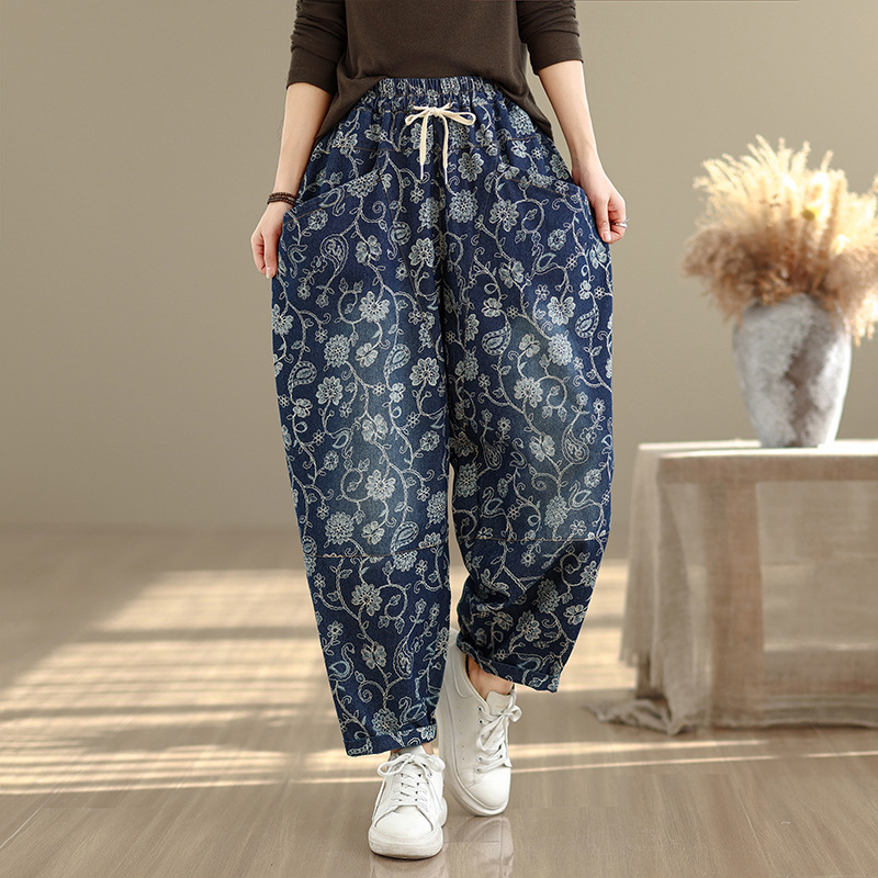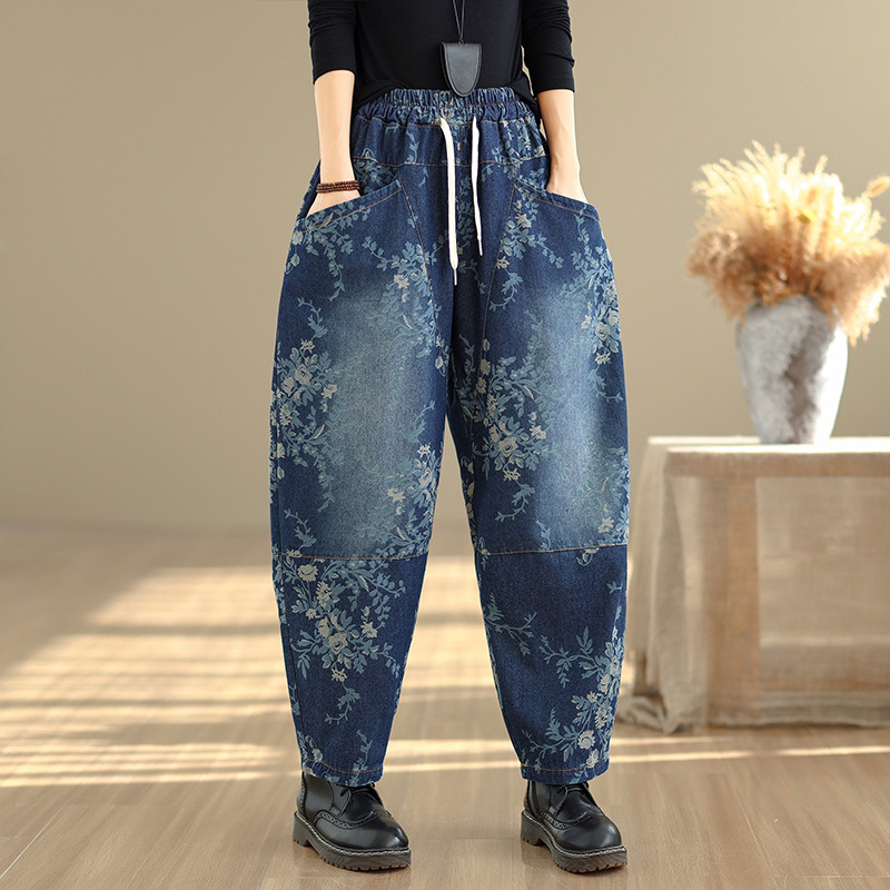 2025 봄 레트로 프린트 캐주얼 슬림핏 루즈핏 밴딩 허리끈 통통한 여성용 워싱 데님 하렘 팬츠