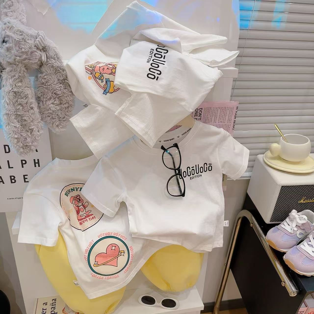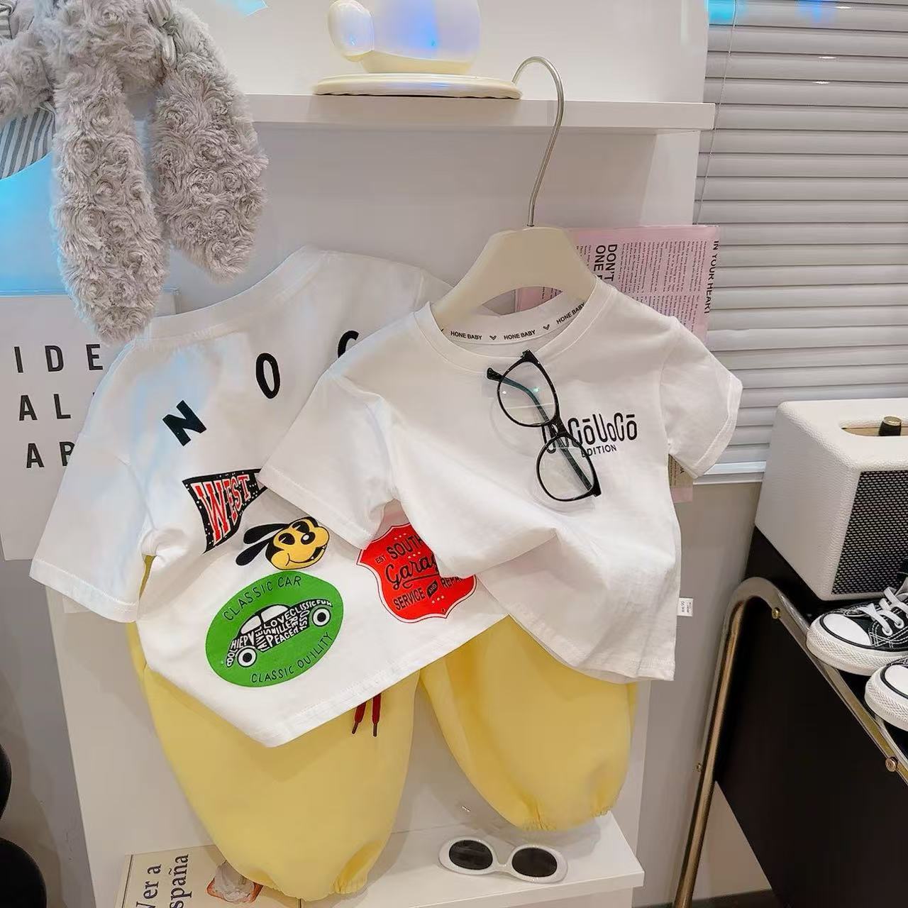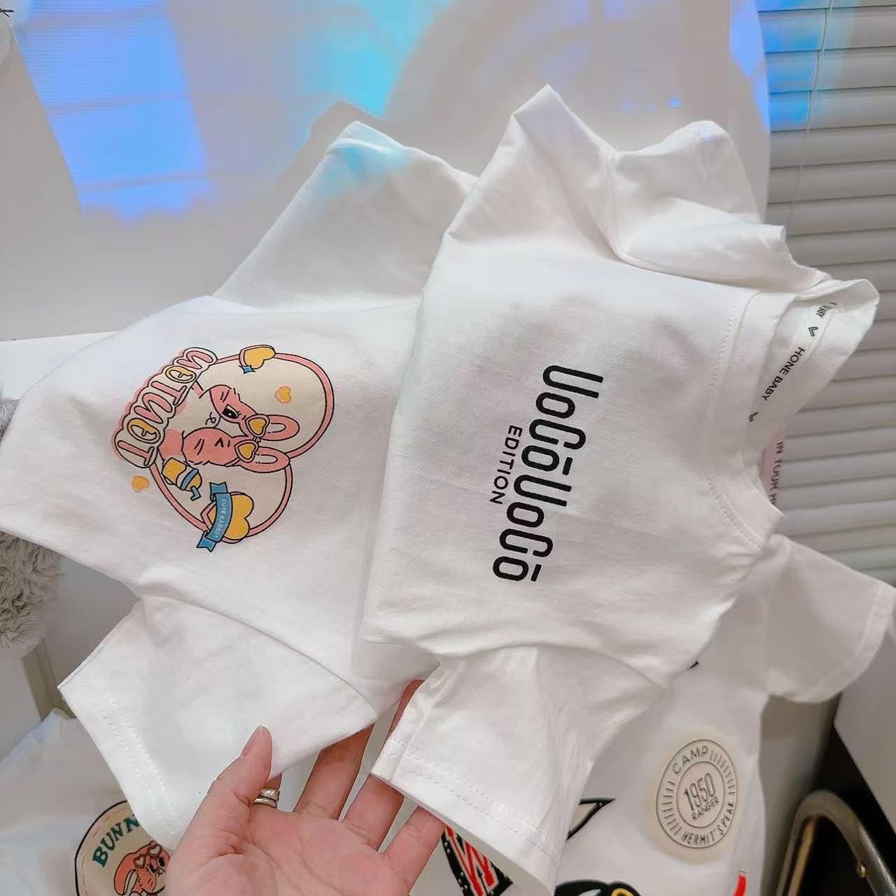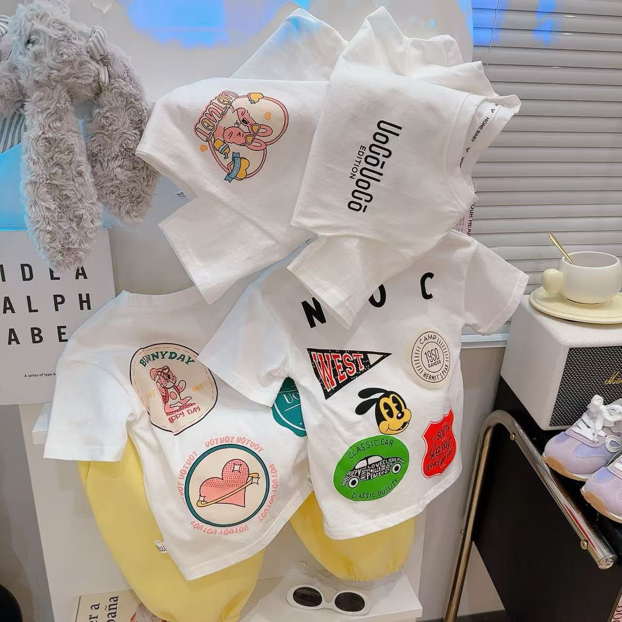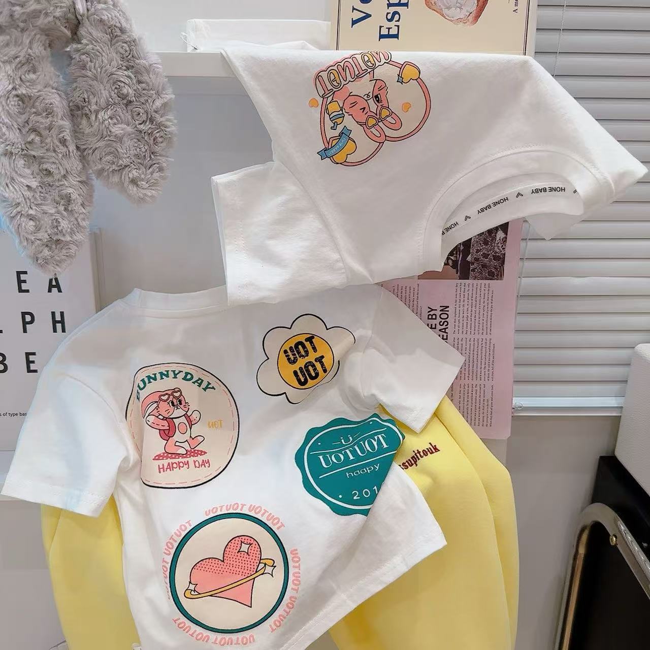 새로운 어린이 반팔 티셔츠 한국식 만화 인쇄 아기 여름 순수면 캐주얼 베이스 반팔 아동복스토어 가기