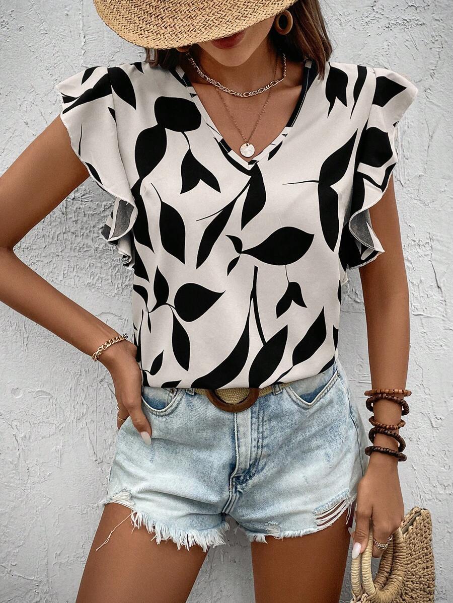 2025 봄과 여름 새로운 유럽과 미국의 국경 V-목 인쇄 패션 캐주얼 반팔 살구색 여성용 셔츠