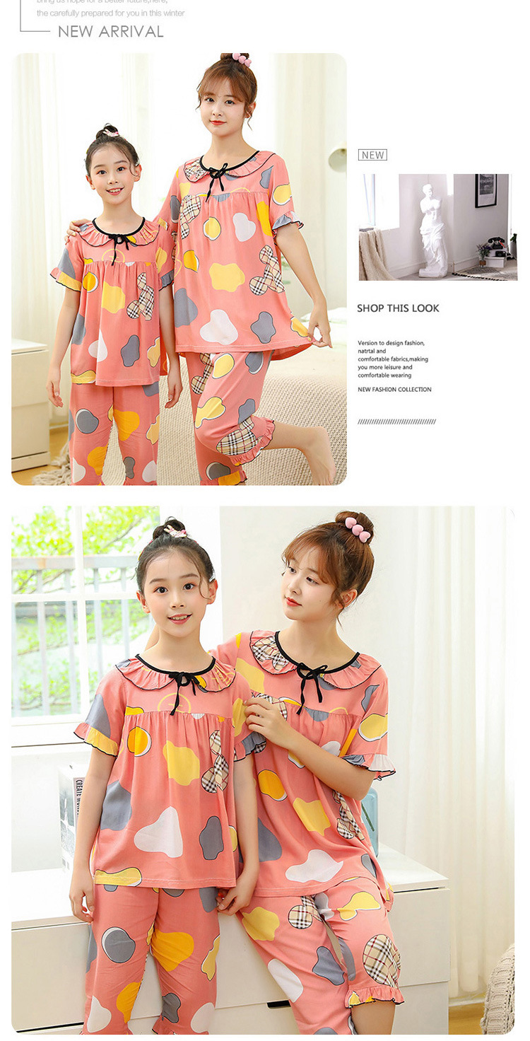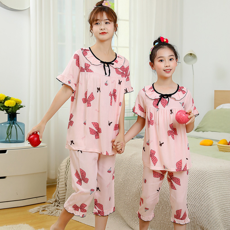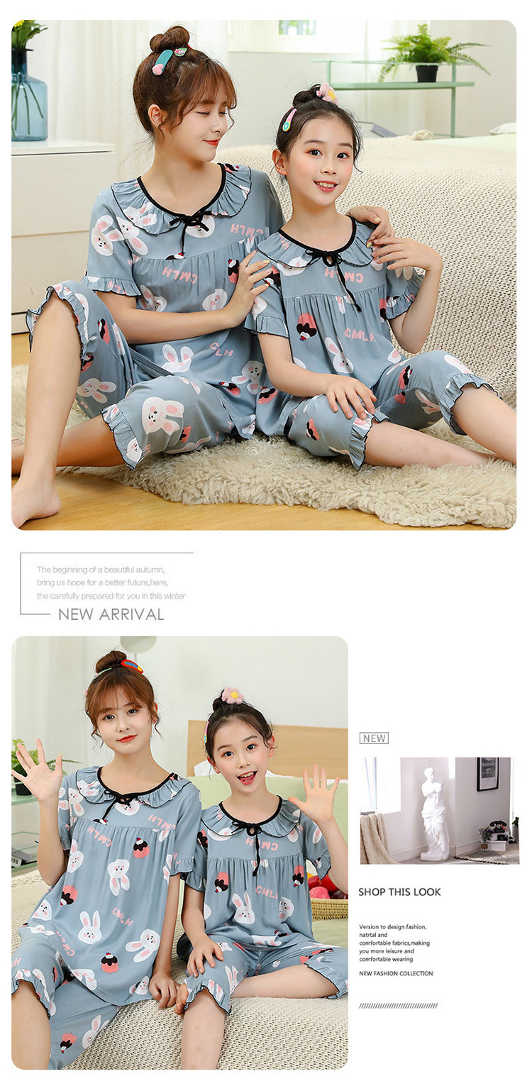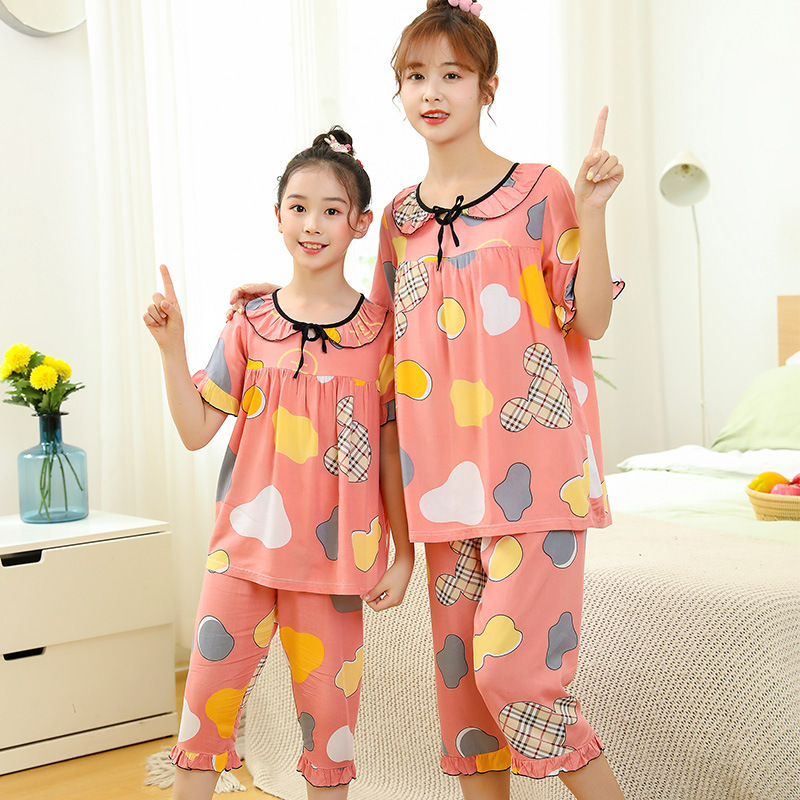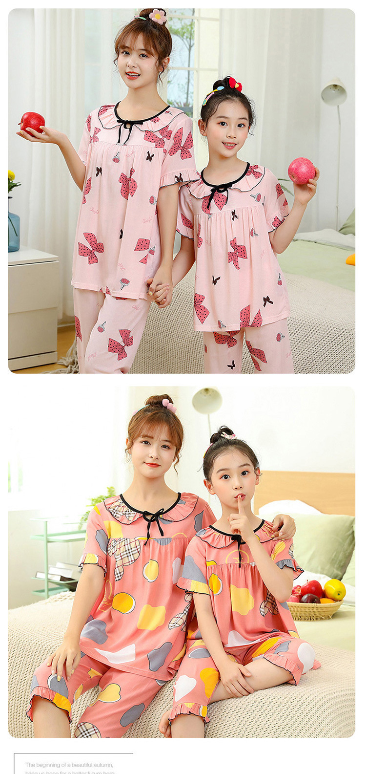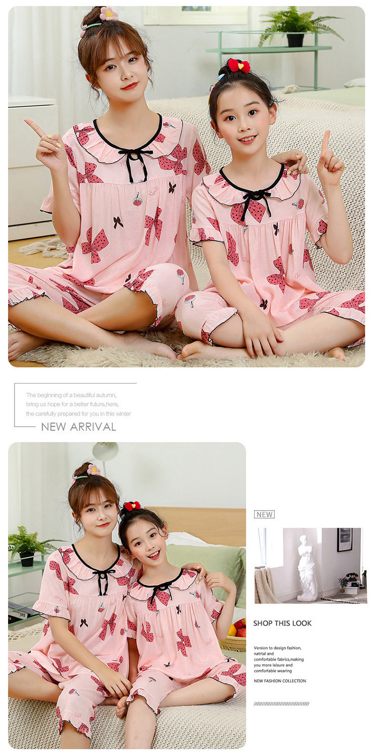 새 여름 어린이 잠옷 소녀 면 실크 반팔 카프리 바지 세트 부모-자식 어머니의 드레스 러플 홈 옷