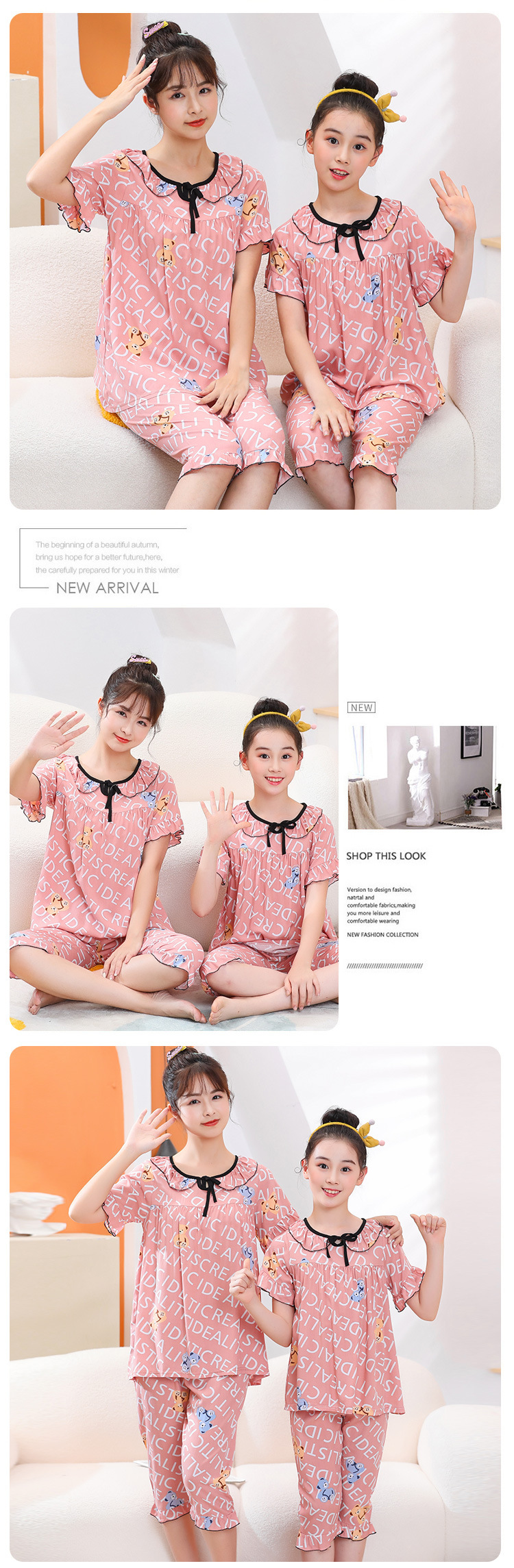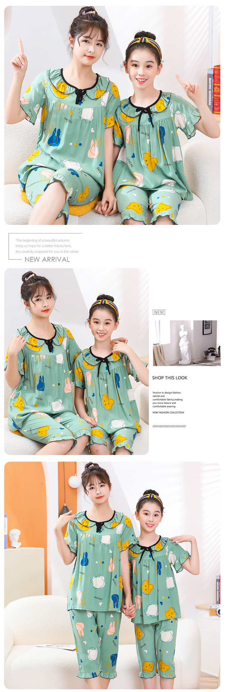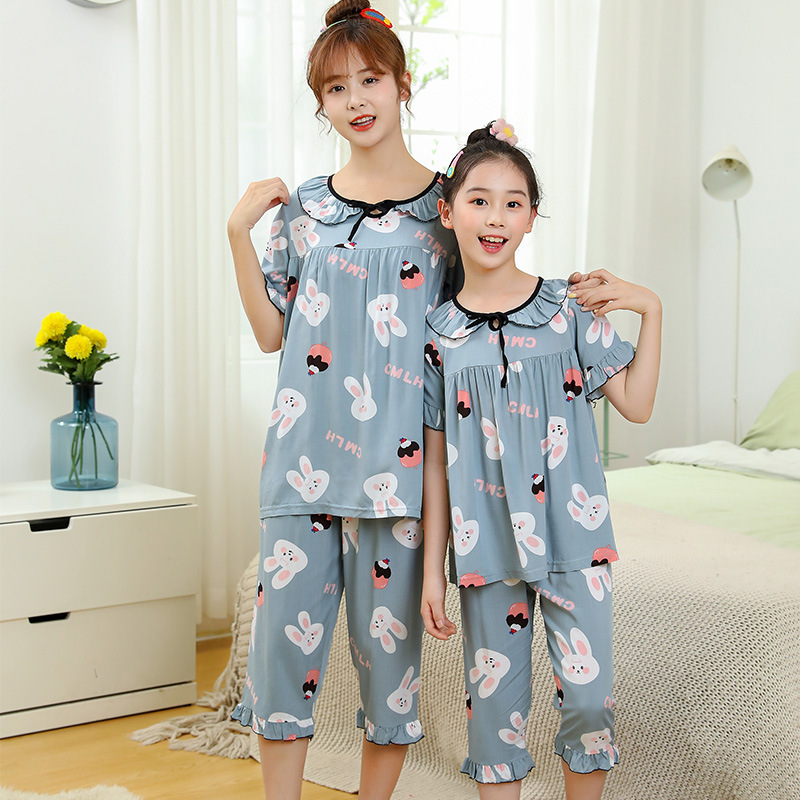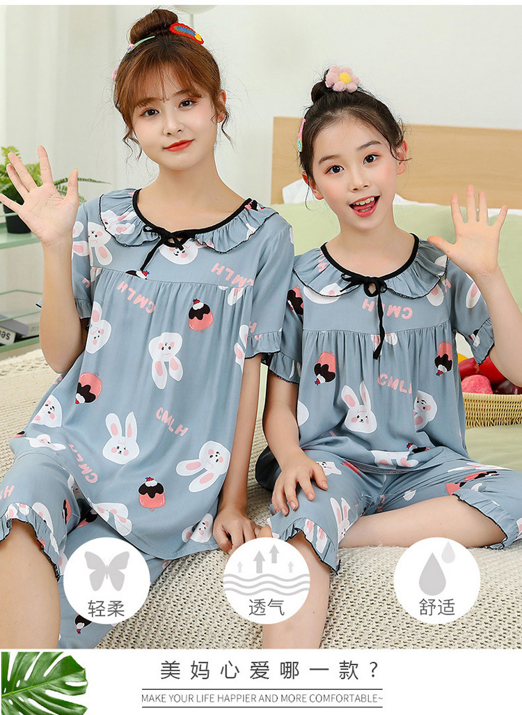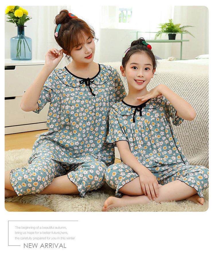 새 여름 어린이 잠옷 소녀 면 실크 반팔 카프리 바지 세트 부모-자식 어머니의 드레스 러플 홈 옷