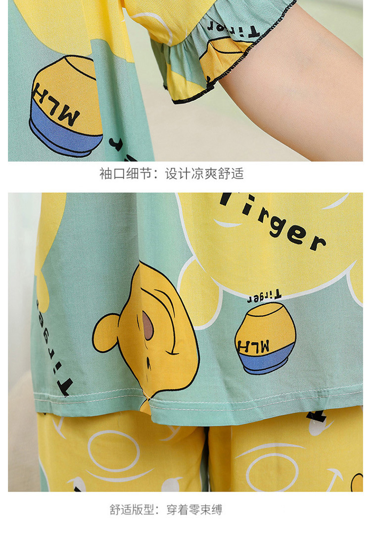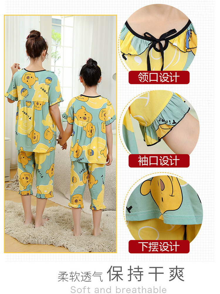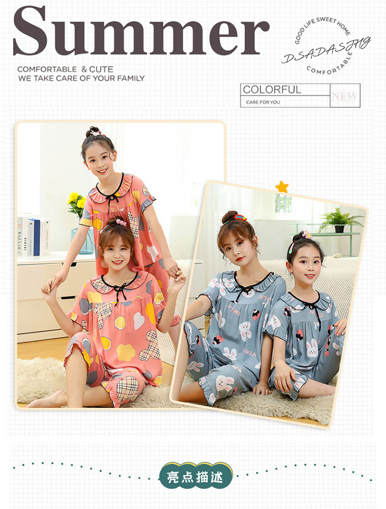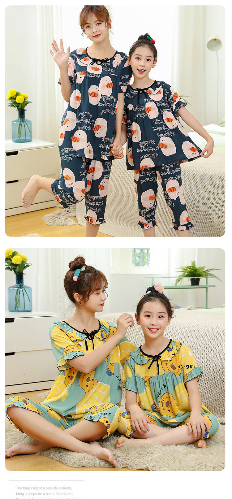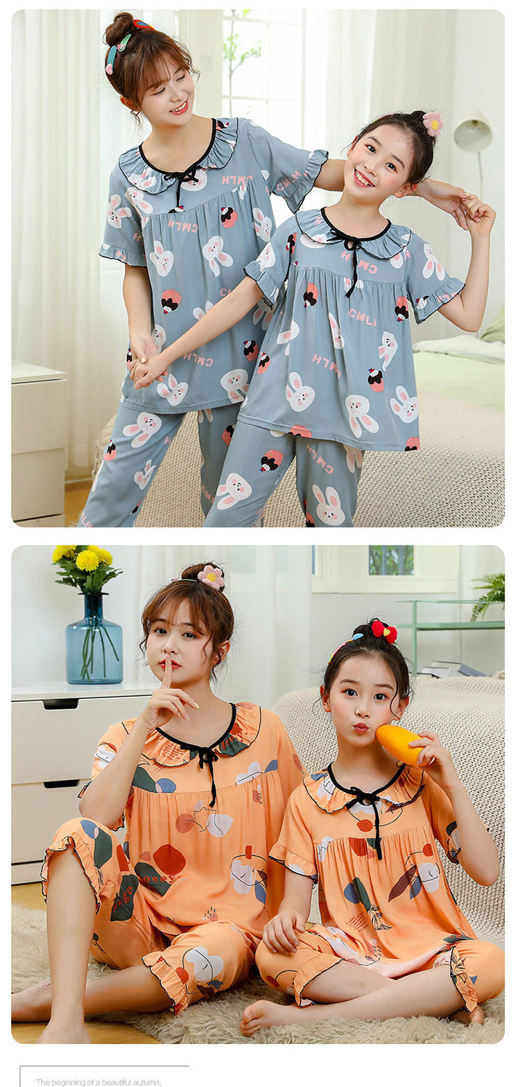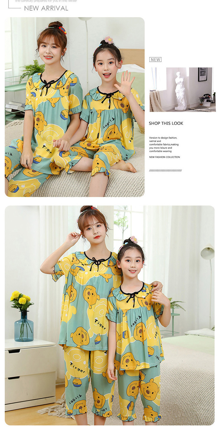 새 여름 어린이 잠옷 소녀 면 실크 반팔 카프리 바지 세트 부모-자식 어머니의 드레스 러플 홈 옷