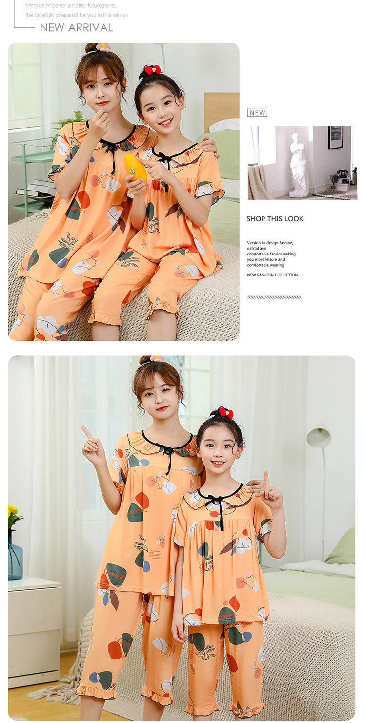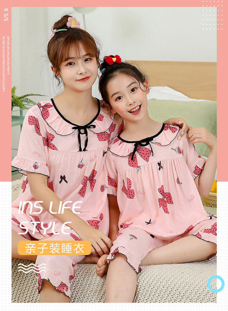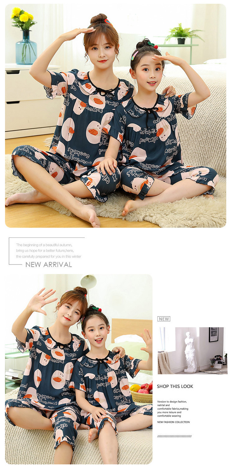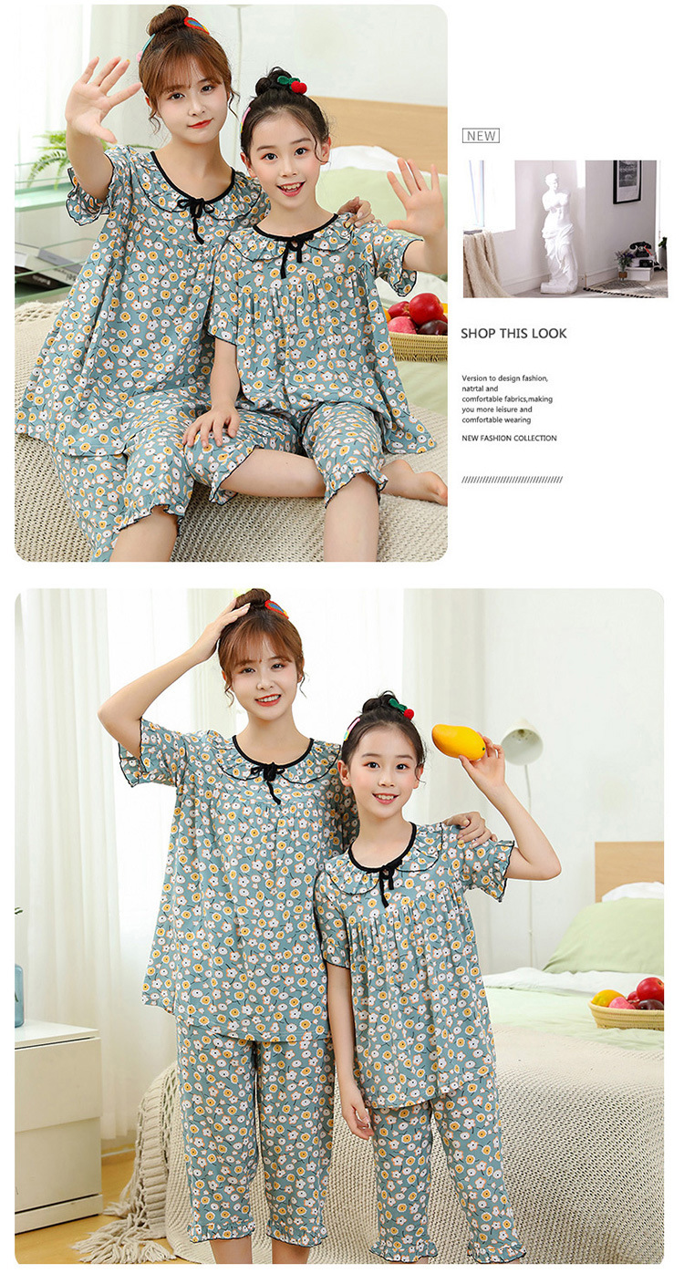 새 여름 어린이 잠옷 소녀 면 실크 반팔 카프리 바지 세트 부모-자식 어머니의 드레스 러플 홈 옷스토어 가기
