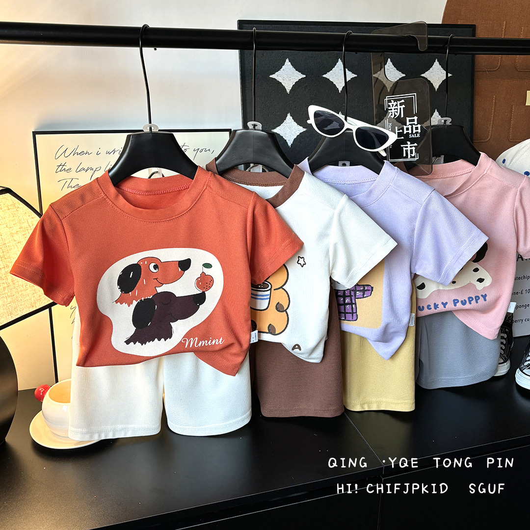 어린이 반팔 반바지 여름 소년 스포츠 만화 반팔 티셔츠 세트 아기 소녀 달콤한 프린트 의상스토어 가기