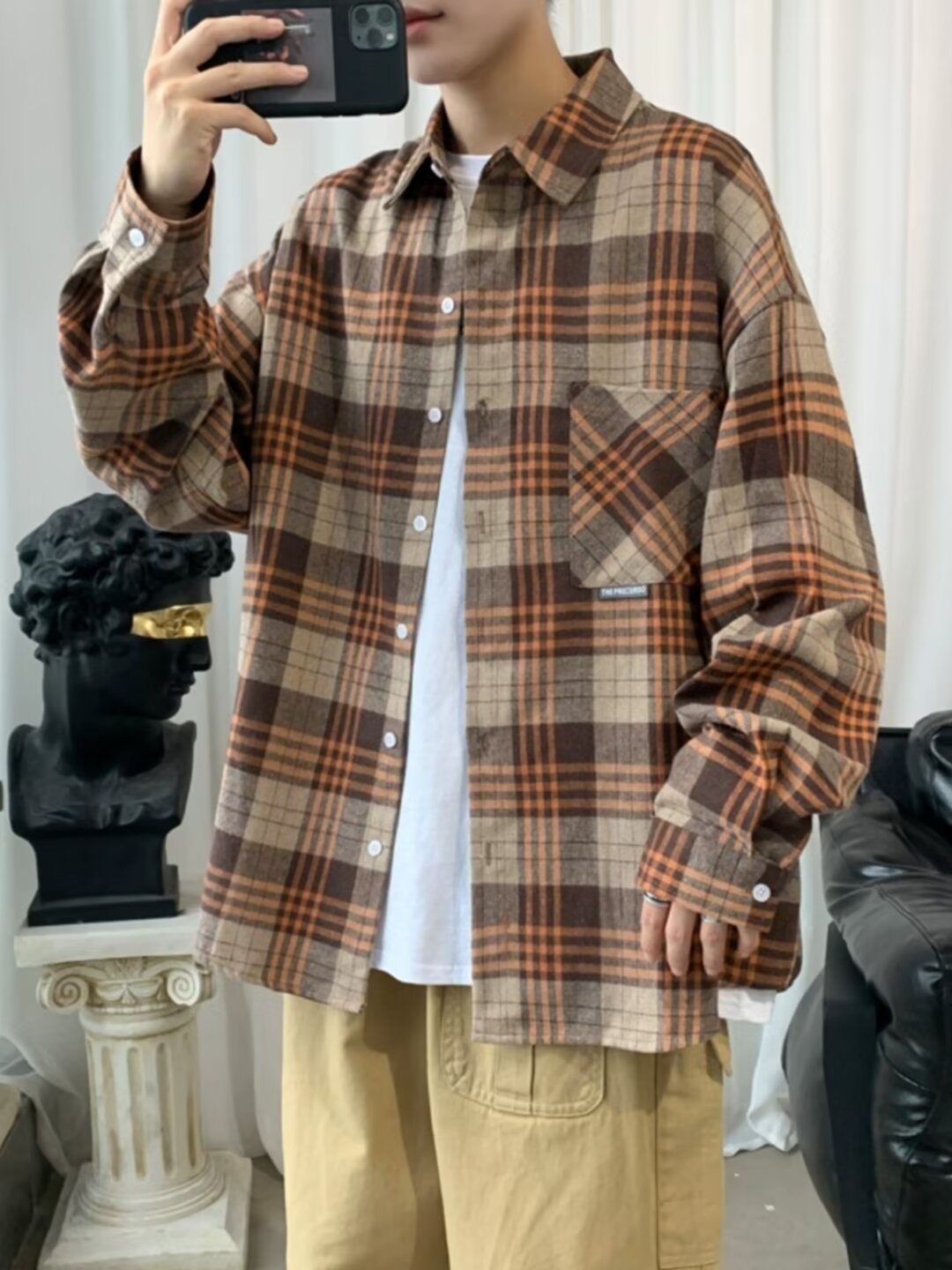 봄과 가을 격자 무늬 긴 소매 셔츠 남자의 느슨한 한국 스타일 유행 학생 카디건 캐주얼 레트로 외부 착용 격자 무늬 셔츠 재킷