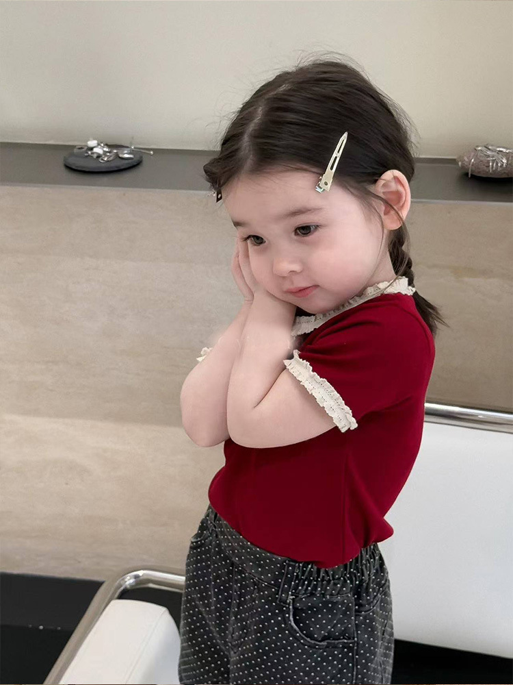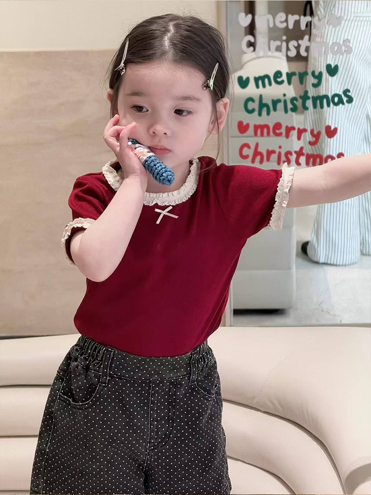 여자 반팔 티셔츠 2025 여름 새 한국 스타일 어린이 느슨한 레이스 크루 넥 탑 아기 소녀베이스 셔츠 T