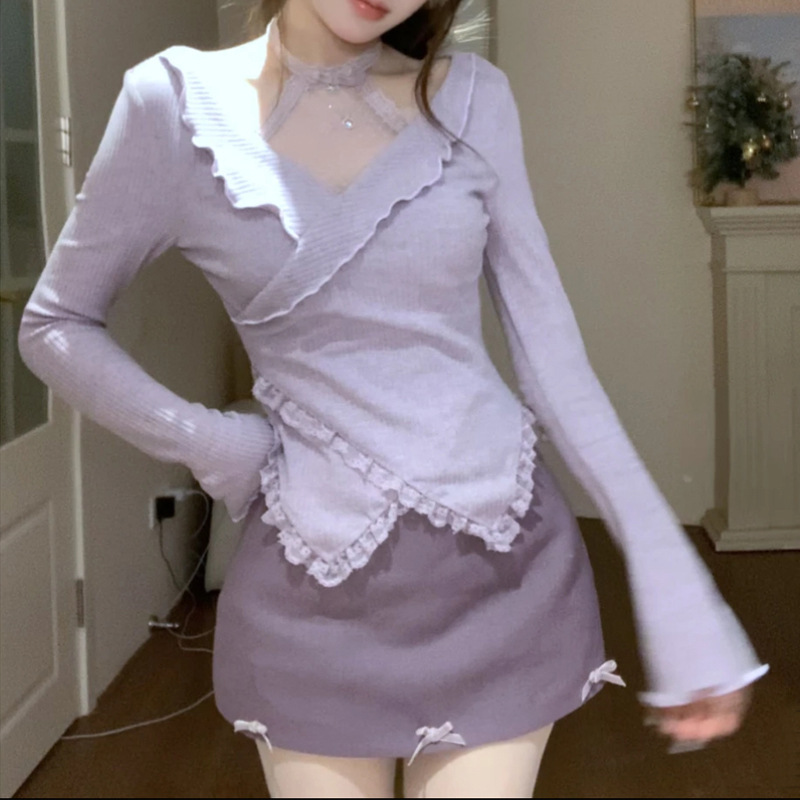 순수한 욕망 스파이스 소녀 스타일 귀 가장자리 디자인 센스 퍼플 크로스 탑 여성의 봄 새로운 우아한 A 라인 짧은 치마 세트