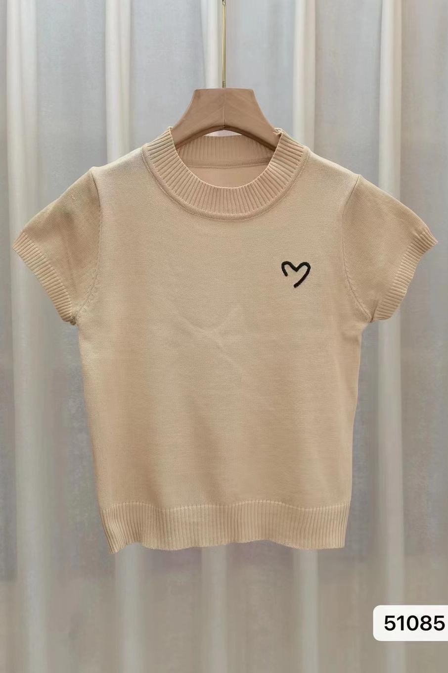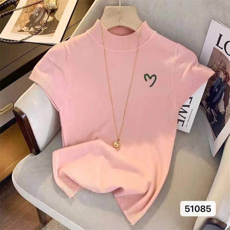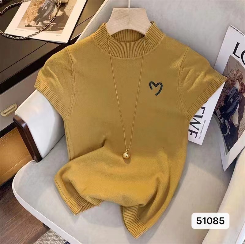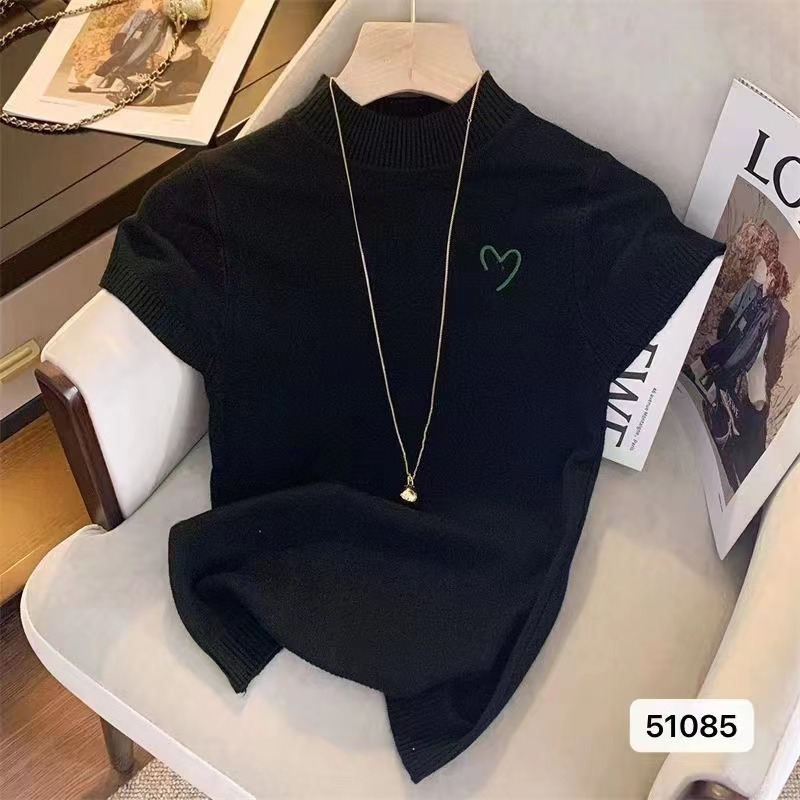 여성용 하프 하이 넥 자수 반소매 니트웨어 2025 새로운 프랑스 스타일 달콤한 핫 걸 슬림-핏 보텀링 최고 유행 영어스토어 가기