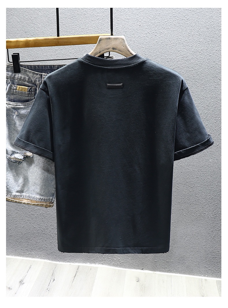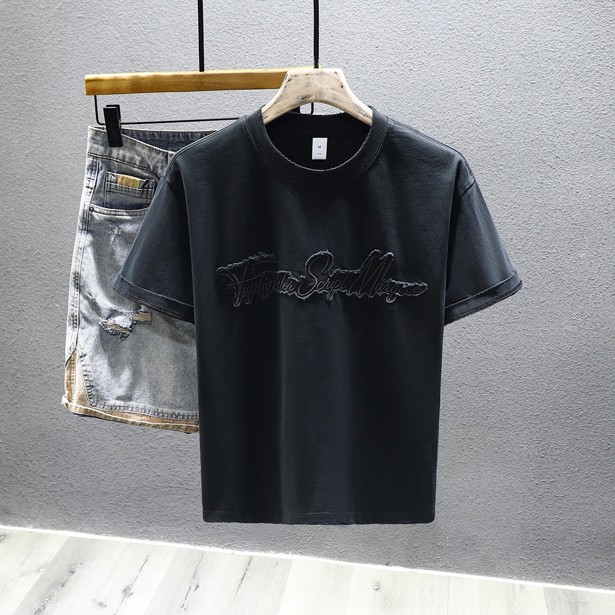 하이 엔드 아메리칸 헤비 자수 반팔 티셔츠 남자 2025 년 여름 뉴 루즈 티셔츠 라운드 넥 면베이스 셔츠스토어 가기