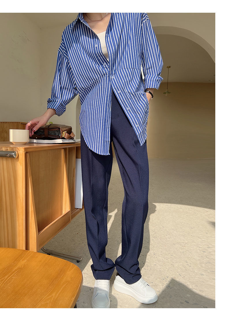 2025 새로운 블루 스트라이프 셔츠 여성의 봄과 가을 디자인 센스 틈새 느슨한 우아한 세련된 셔츠 탑 여성스토어 가기
