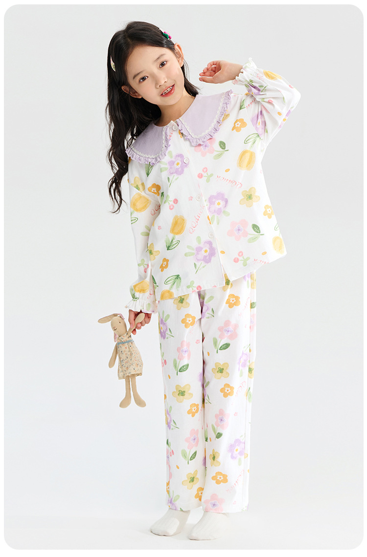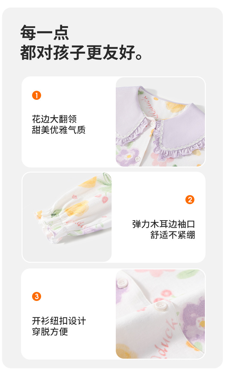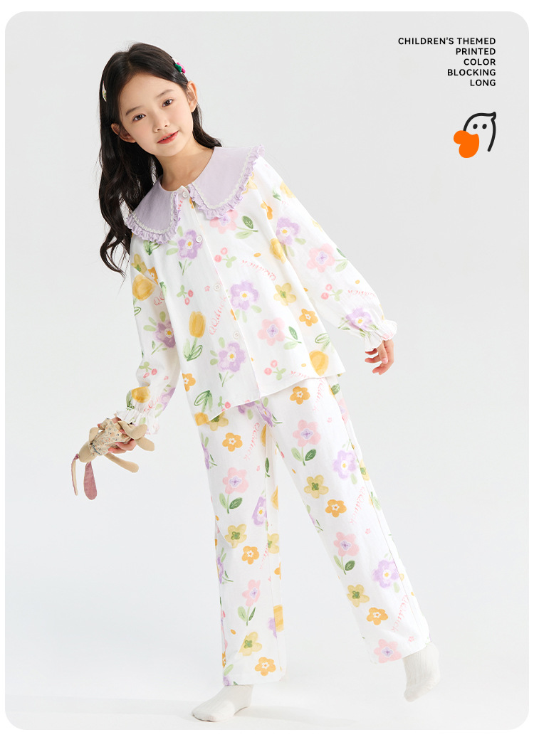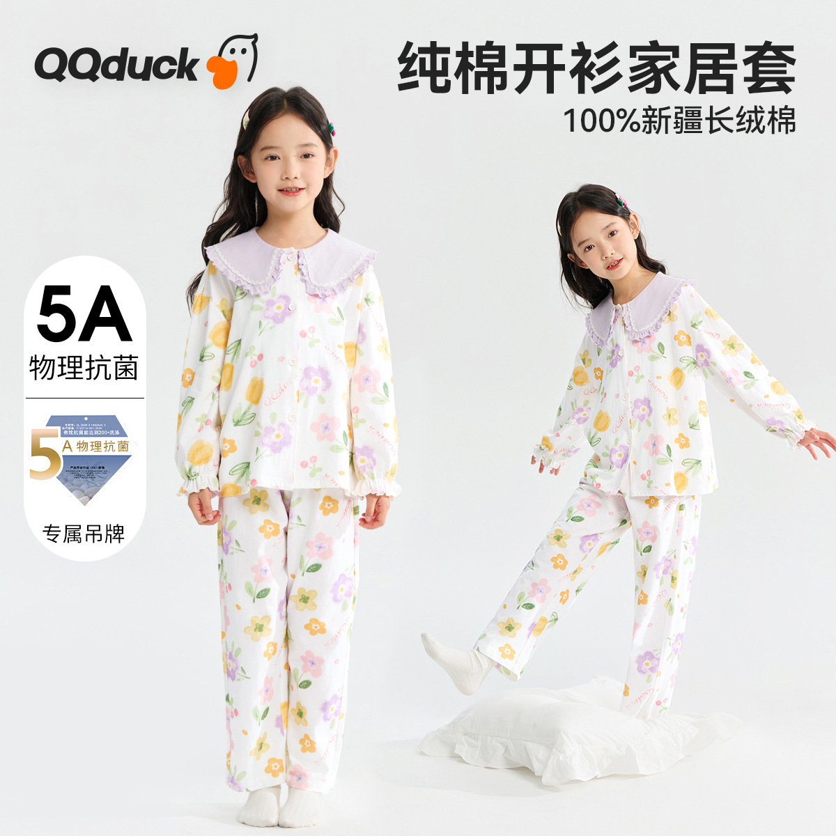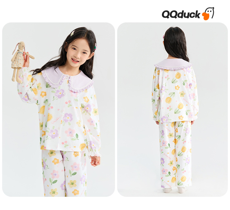 QQduck Cocoa Duck Spring New Girls 'Pajamas 세트 어린이 면 꽃 집 옷 투피스 세트