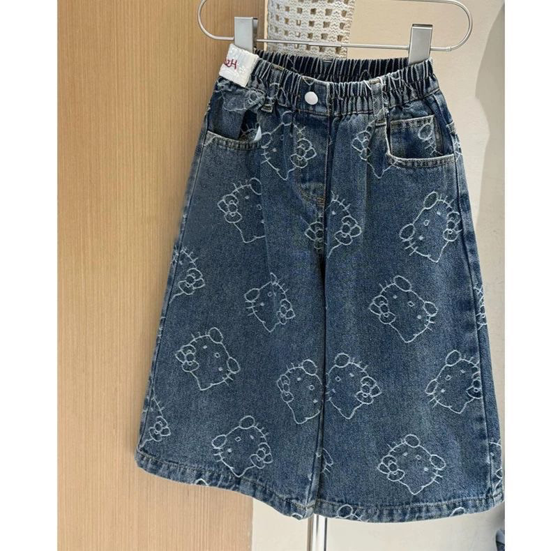 여아 바지 청바지 봄, 가을 한국 스타일 어린이 귀여운 키티 고양이 전체 인쇄 어린이 와이드 팬츠스토어 가기