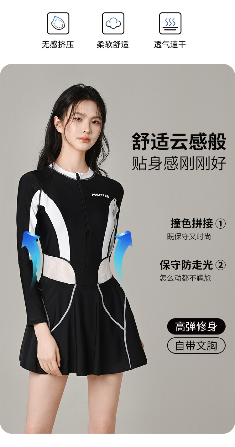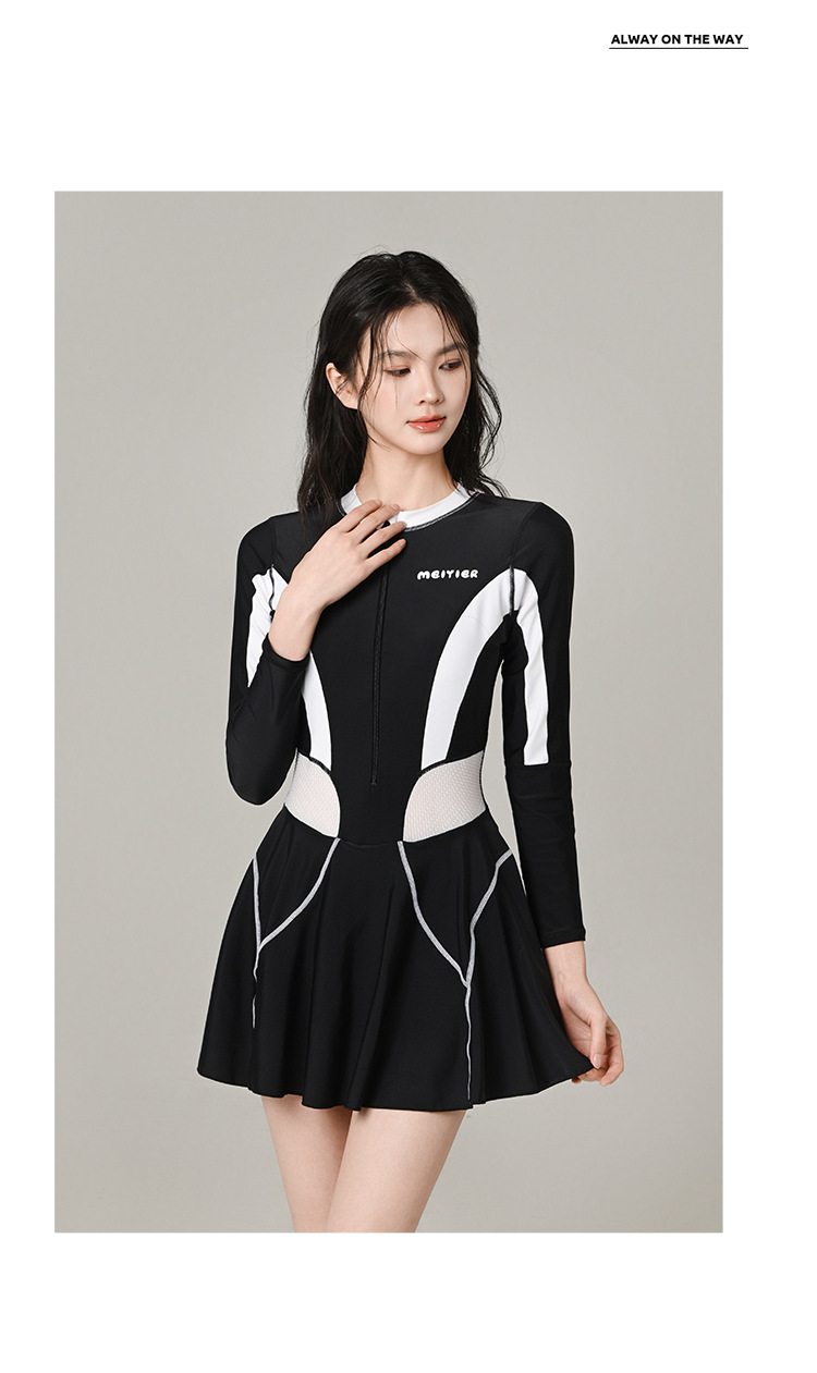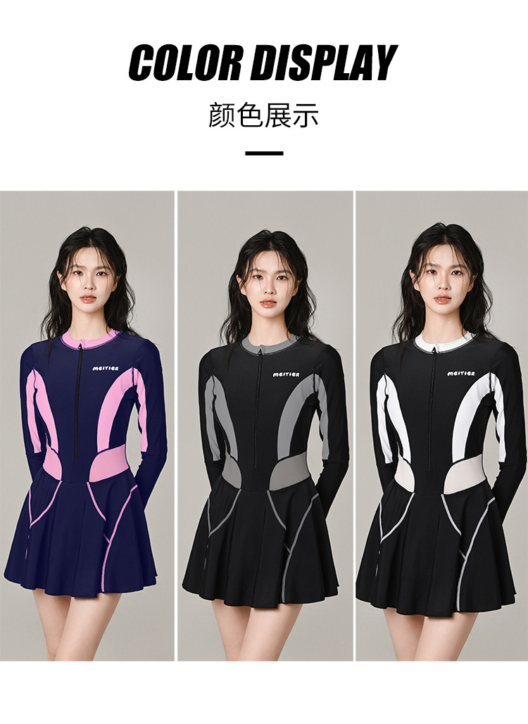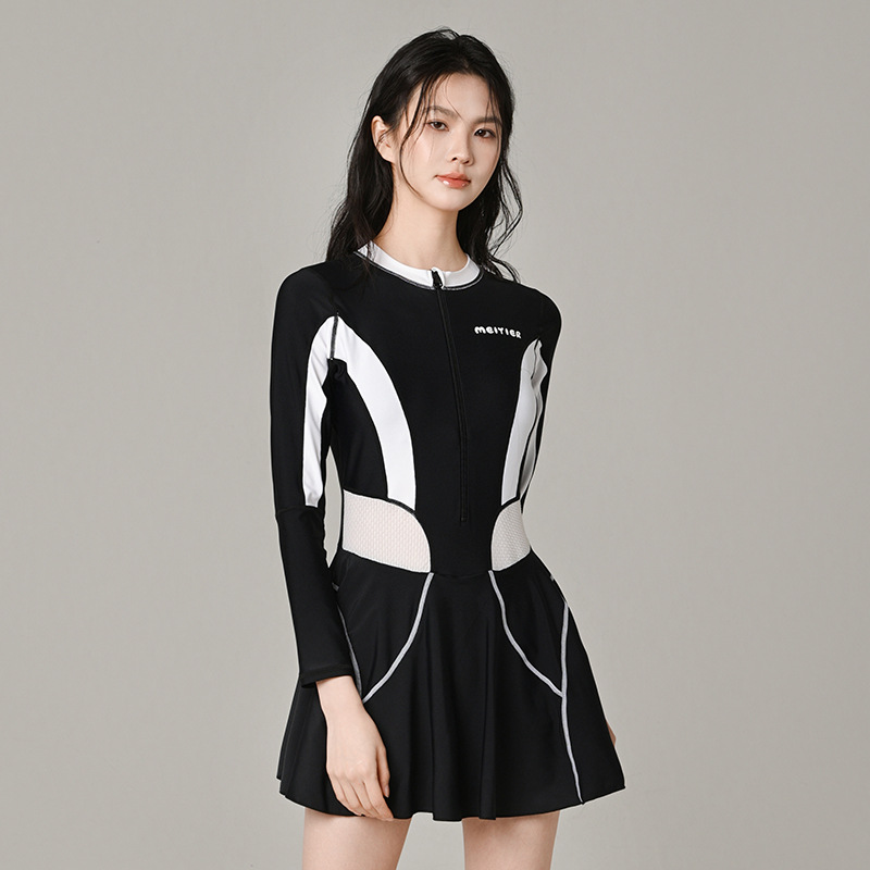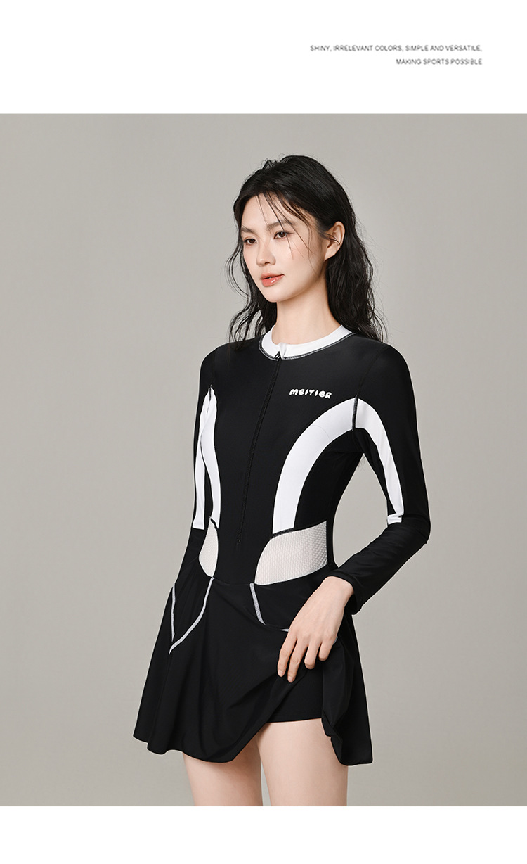 2025 살짝 뚱뚱한 여성을 위한 원피스 수영복, 긴팔 원피스 스커트 수영복, 스포츠 스타일 슬리밍 속건 수영복