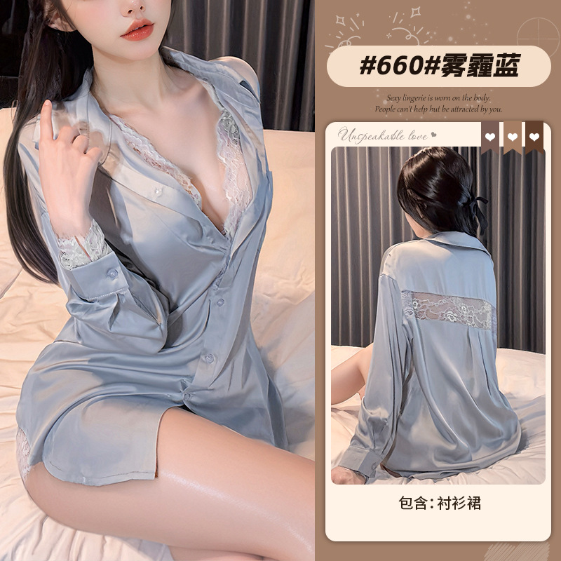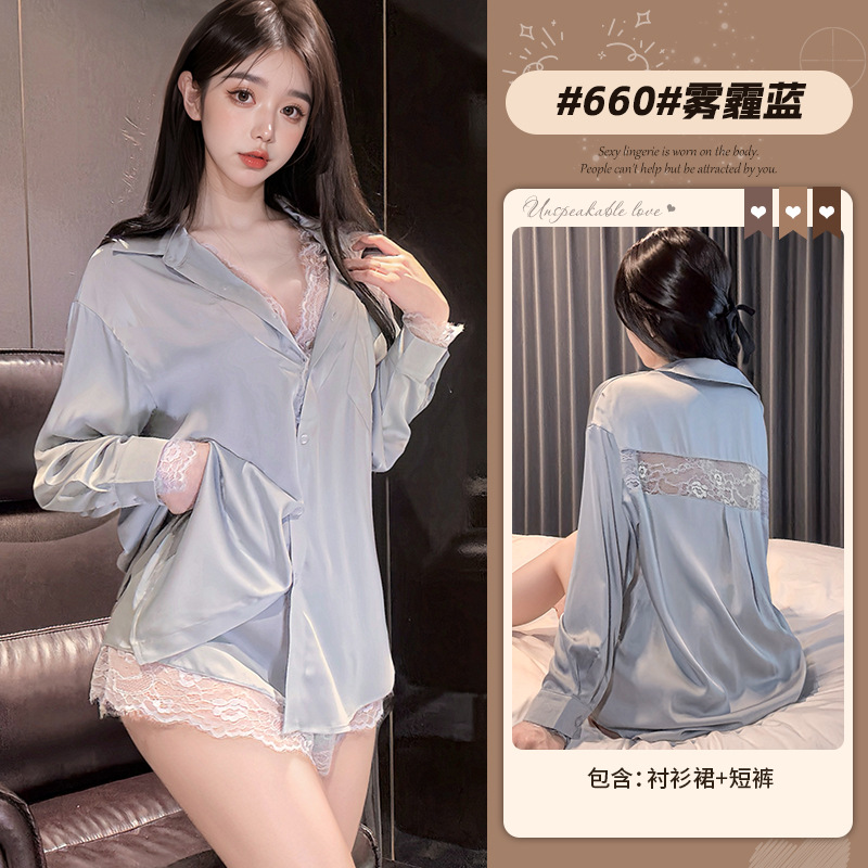 선이 여성 여름 잠옷 순수한 레이스 섹시 긴팔 루즈핏 흰색 셔츠 아이스 실크 잠옷 홈웨어 투피스 세트 660스토어 가기