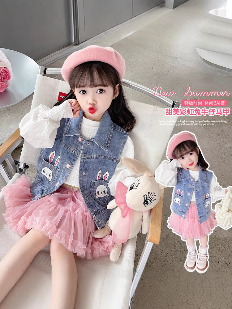 소녀 조끼 봄과 가을 2025 새로운 어린이 서양식 가을 데님 코트 아기의 유행 외모 조끼 가을 착용스토어 가기