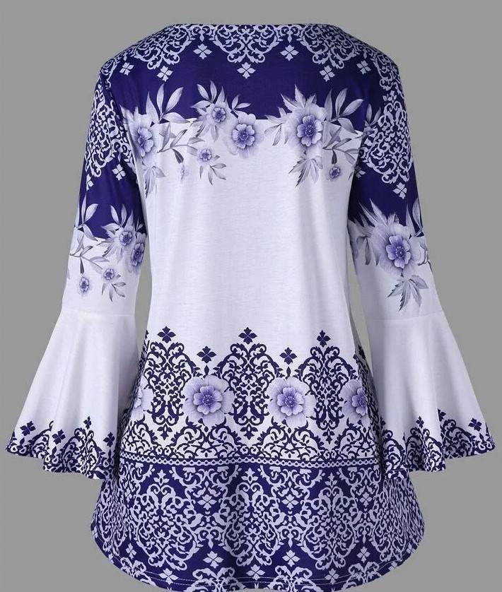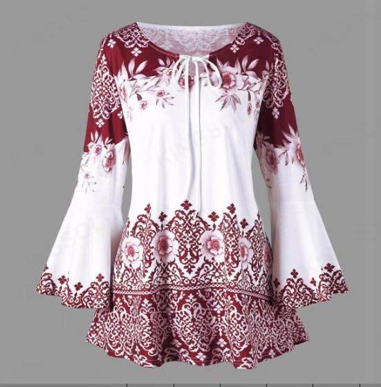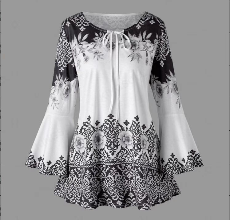 2025 유럽과 미국의 새로운 아마존 여성 인쇄 긴 벨 슬리브 스트랩 티셔츠 슬림핏 긴 소매 플러스 사이즈 여성 의류스토어 가기