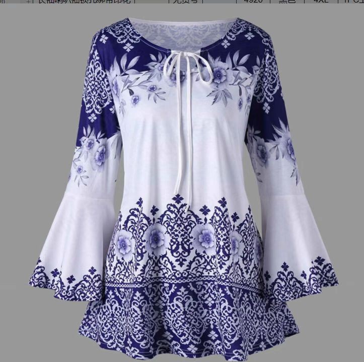 2025 유럽과 미국의 새로운 아마존 여성 인쇄 긴 벨 슬리브 스트랩 티셔츠 슬림핏 긴 소매 플러스 사이즈 여성 의류