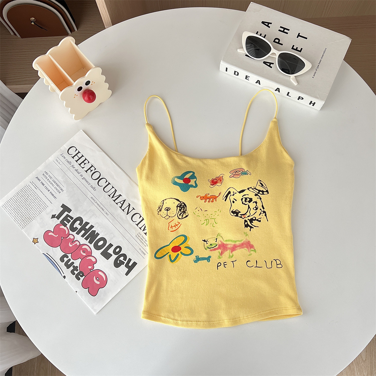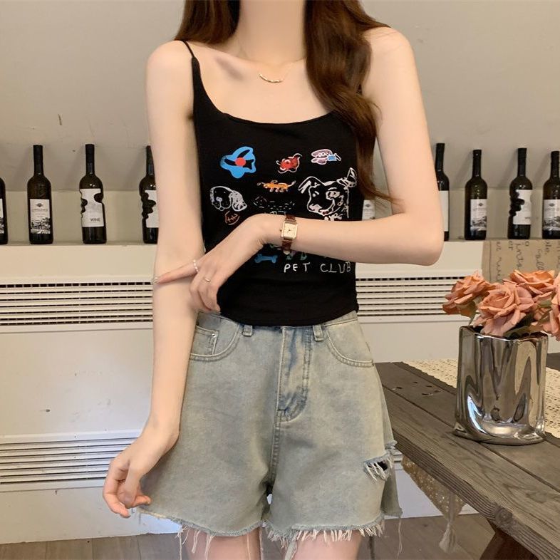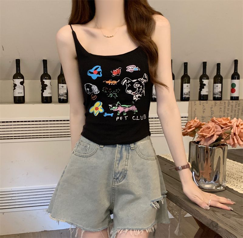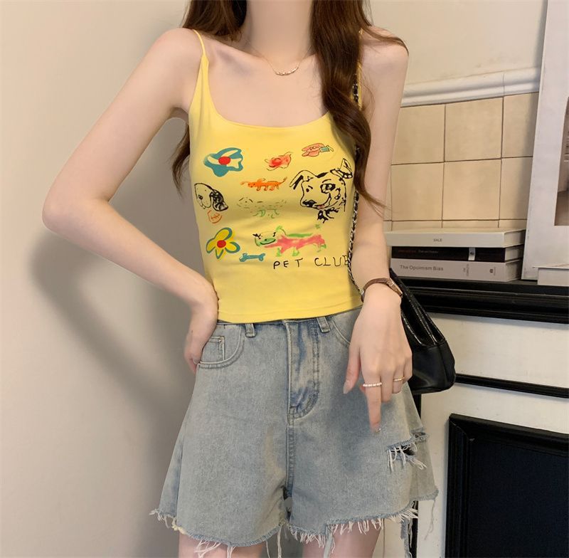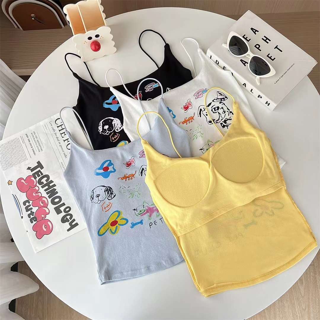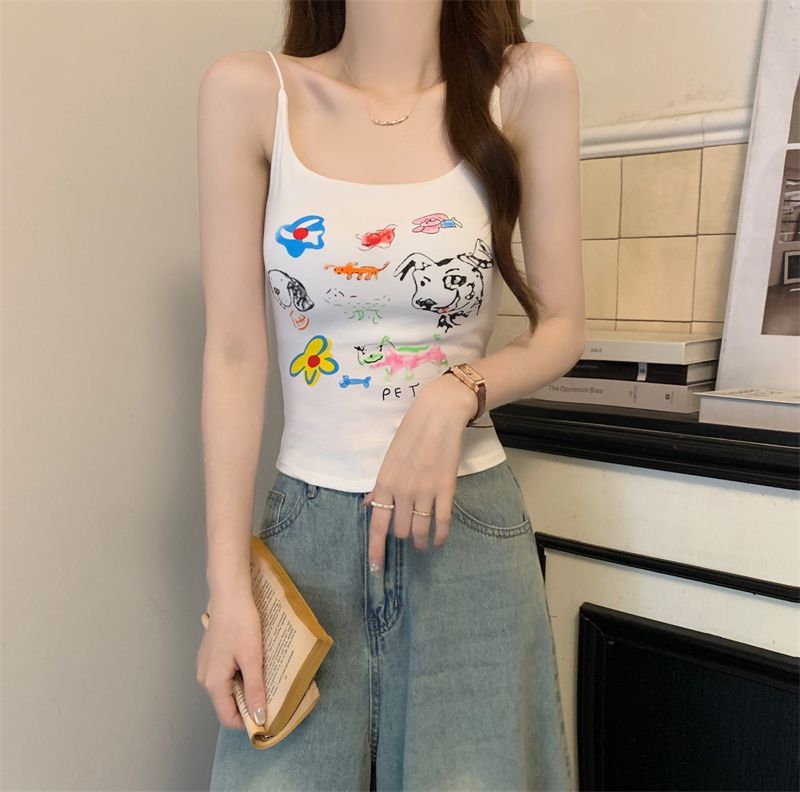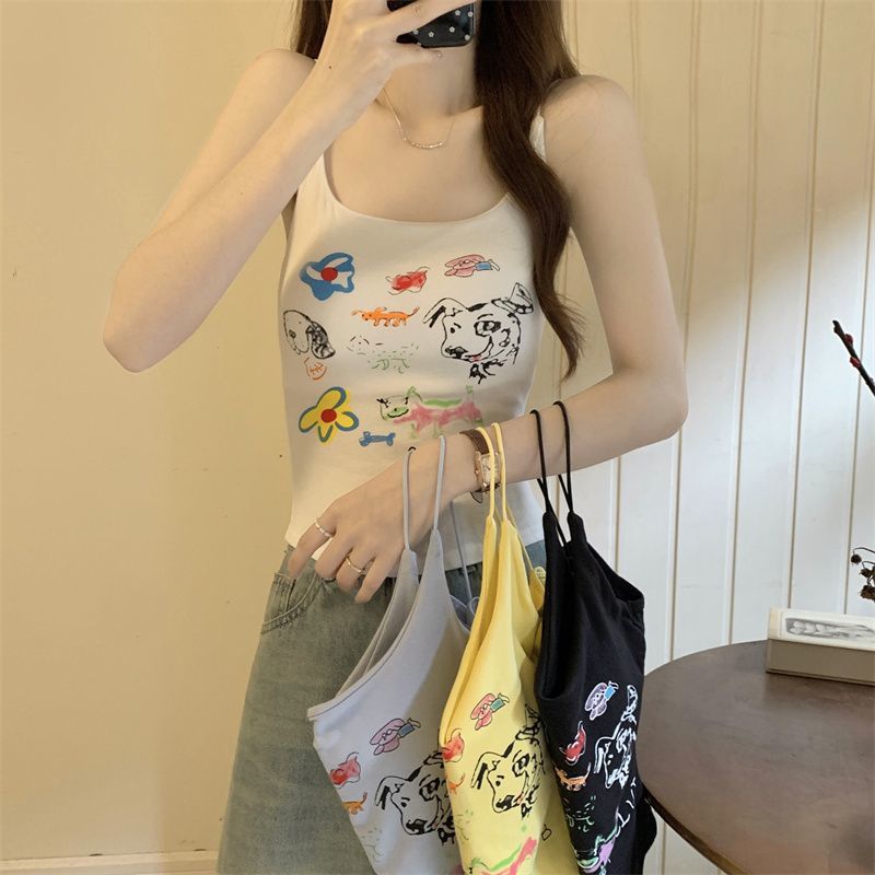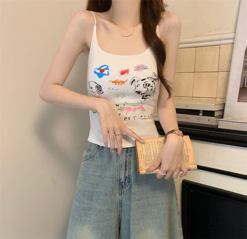 여성을위한 미국 달콤한과 매운 만화 프린트 작은 캐미솔 봄 태국 스타일 민소매 핫 소녀 짧은 탑 가슴 패드 포함스토어 가기