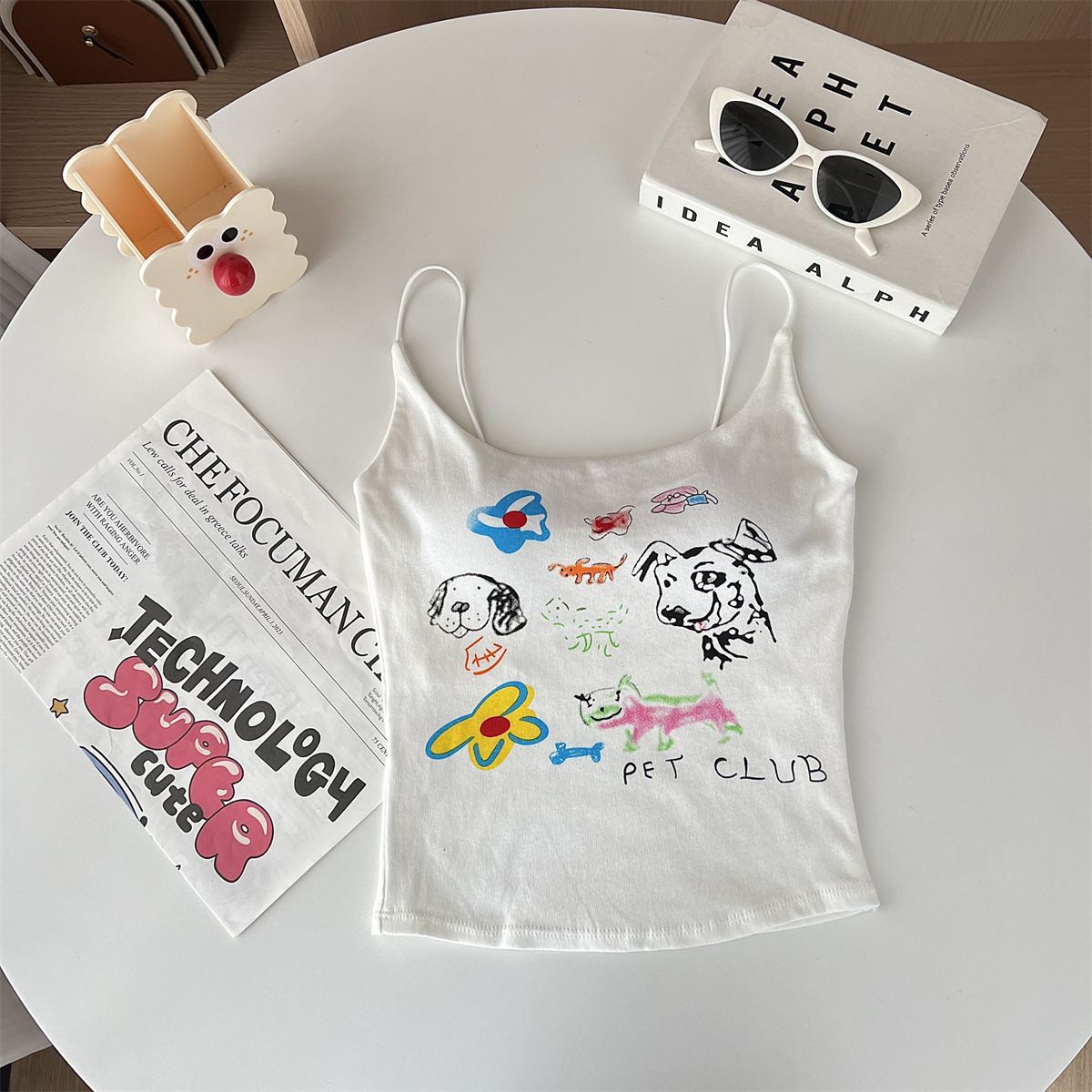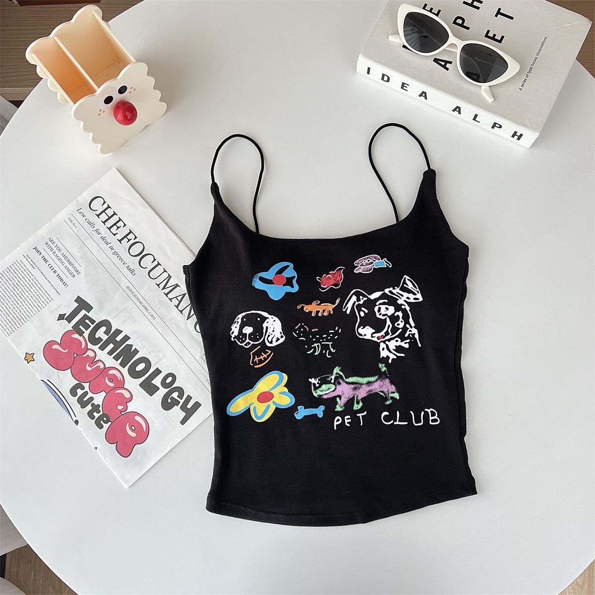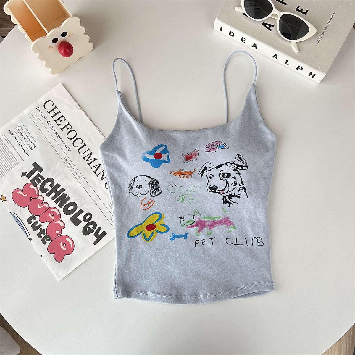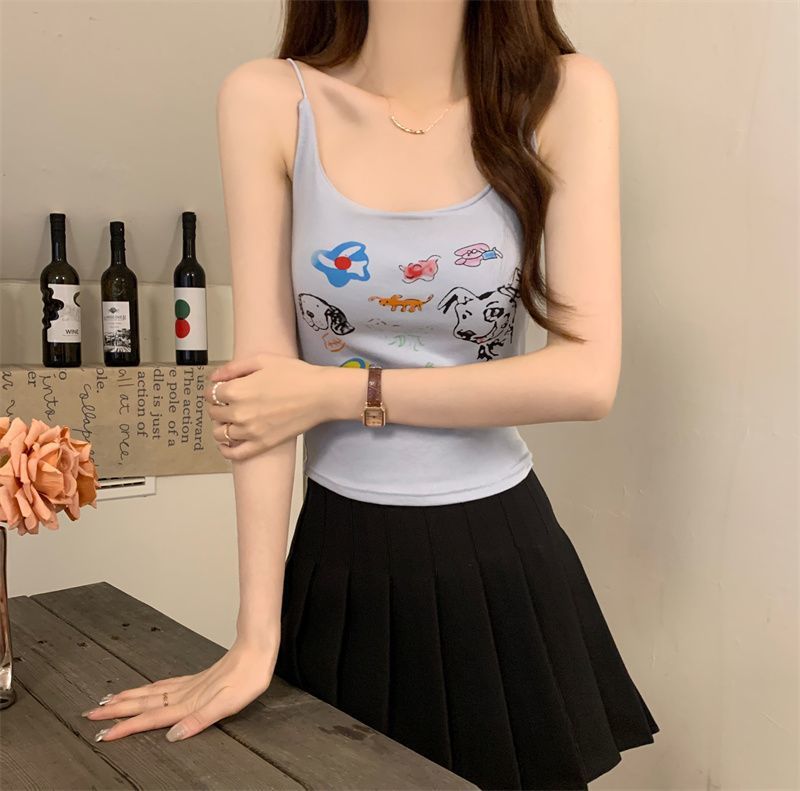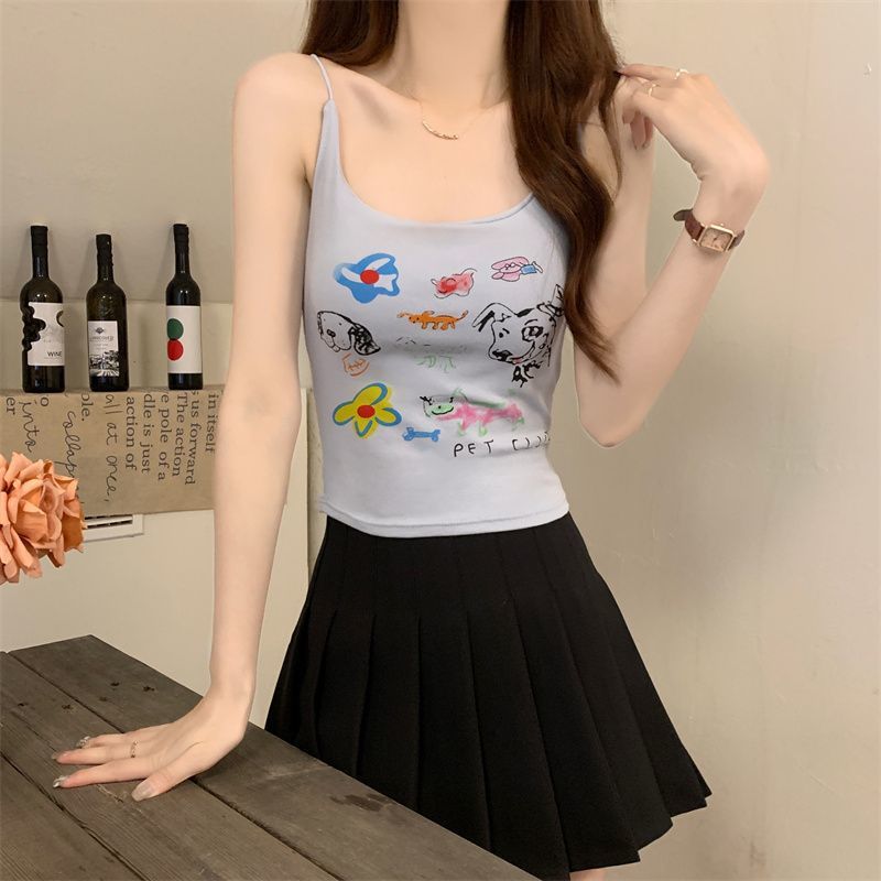 여성을위한 미국 달콤한과 매운 만화 프린트 작은 캐미솔 봄 태국 스타일 민소매 핫 소녀 짧은 탑 가슴 패드 포함