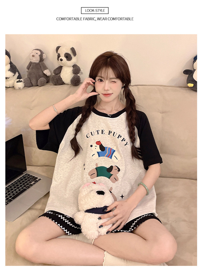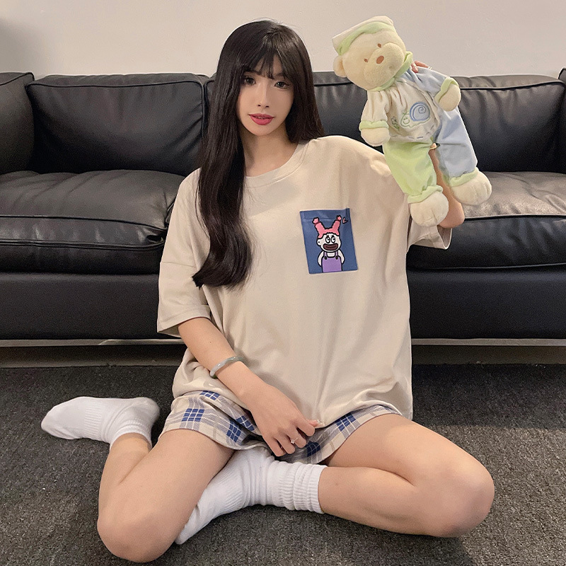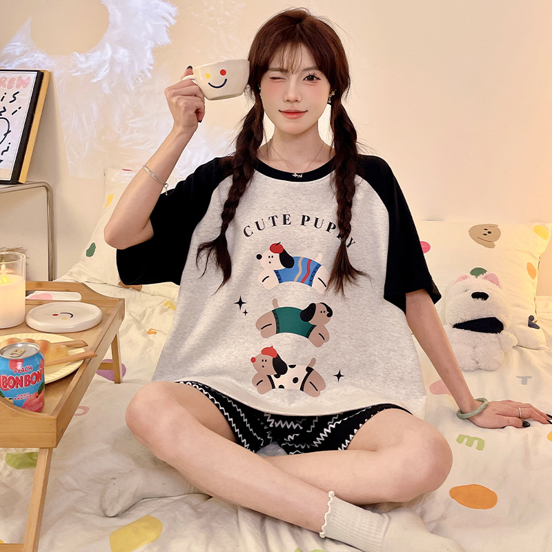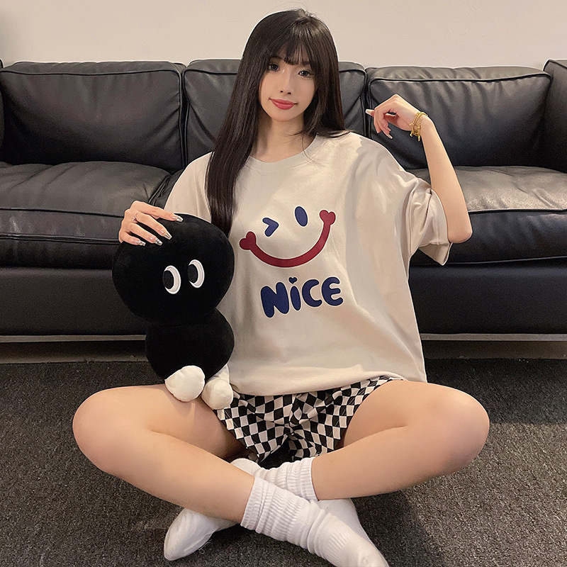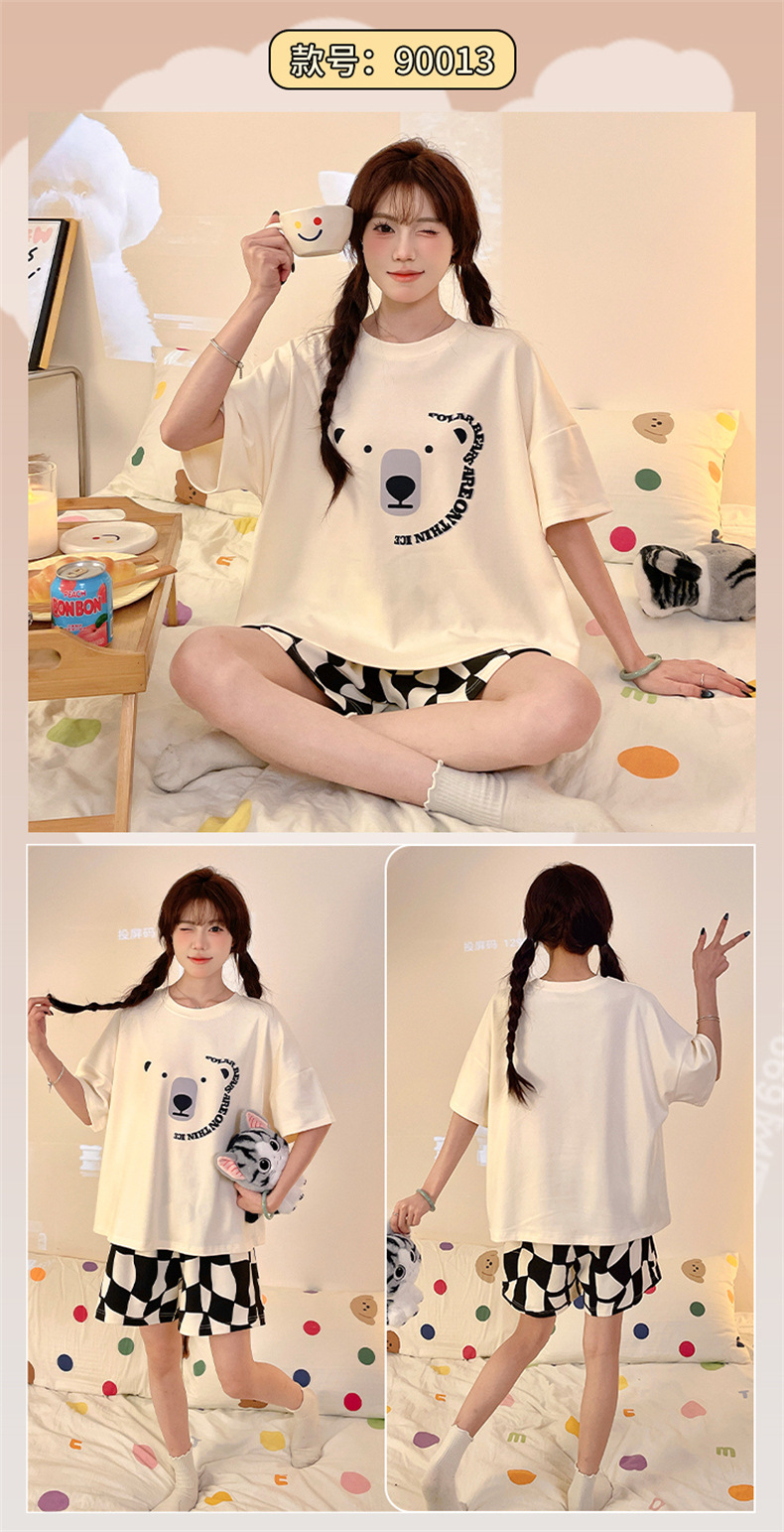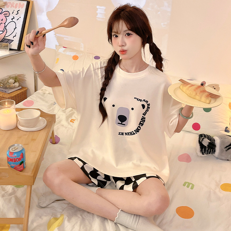 여성용 면 잠옷, 여름 반팔 반바지, 얇은 홈웨어, 한국 스타일, 귀여운 만화 캐주얼 스타일, 외부에서 착용 가능