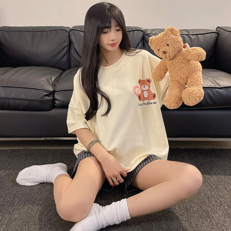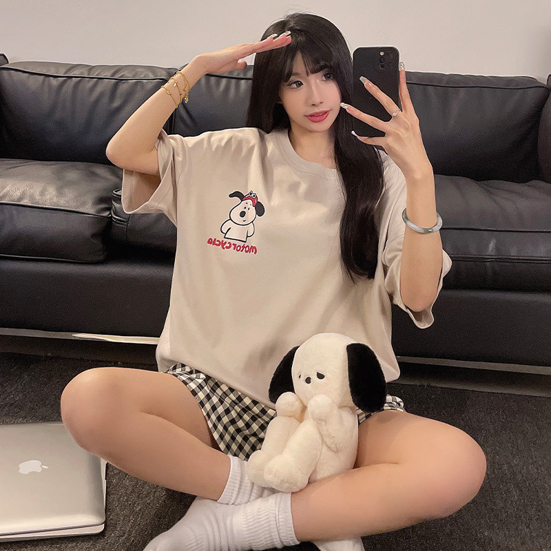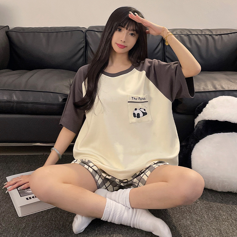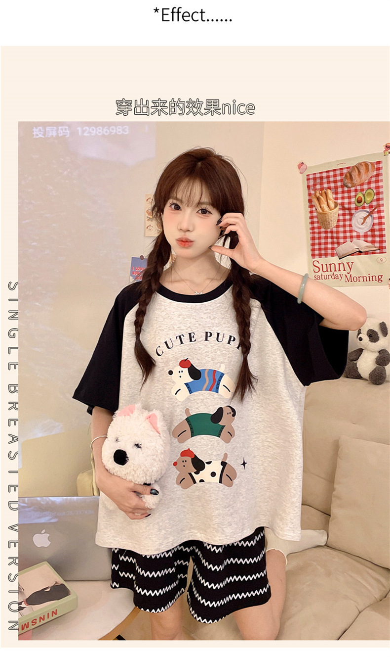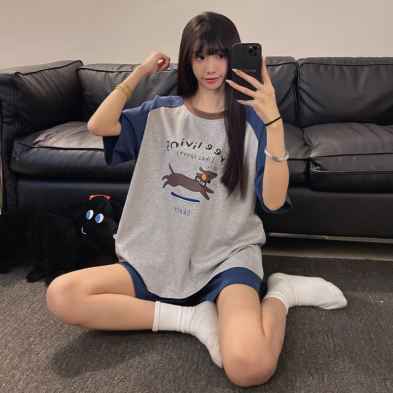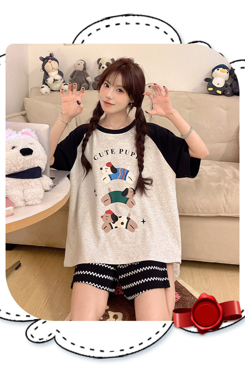 여성용 면 잠옷, 여름 반팔 반바지, 얇은 홈웨어, 한국 스타일, 귀여운 만화 캐주얼 스타일, 외부에서 착용 가능
