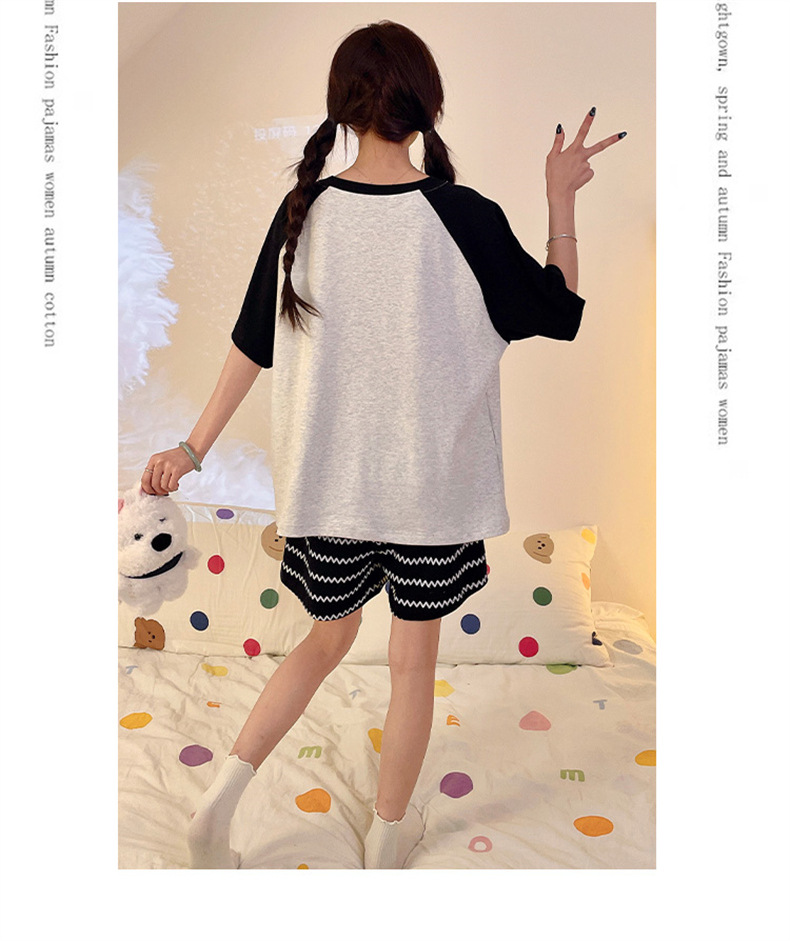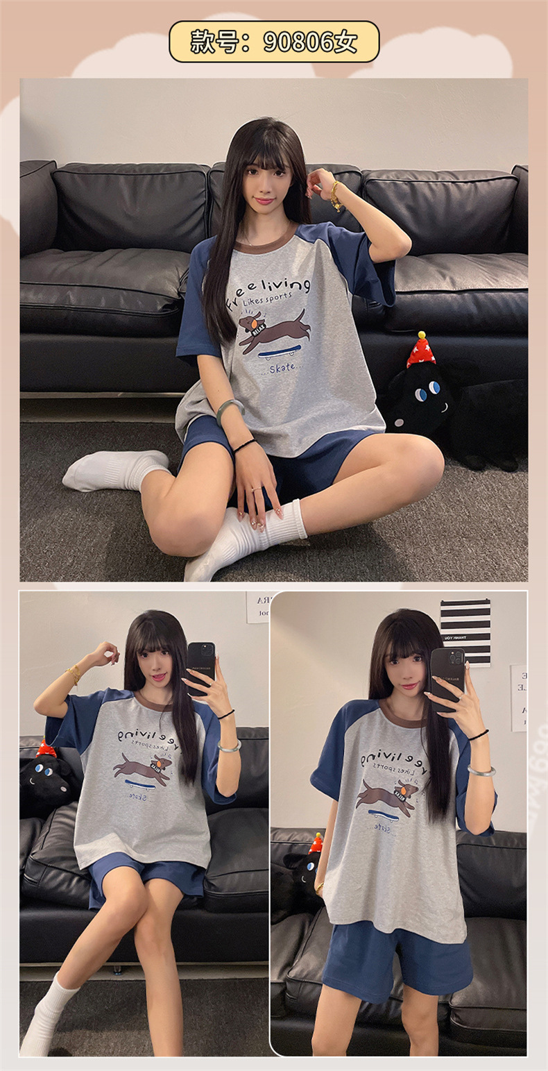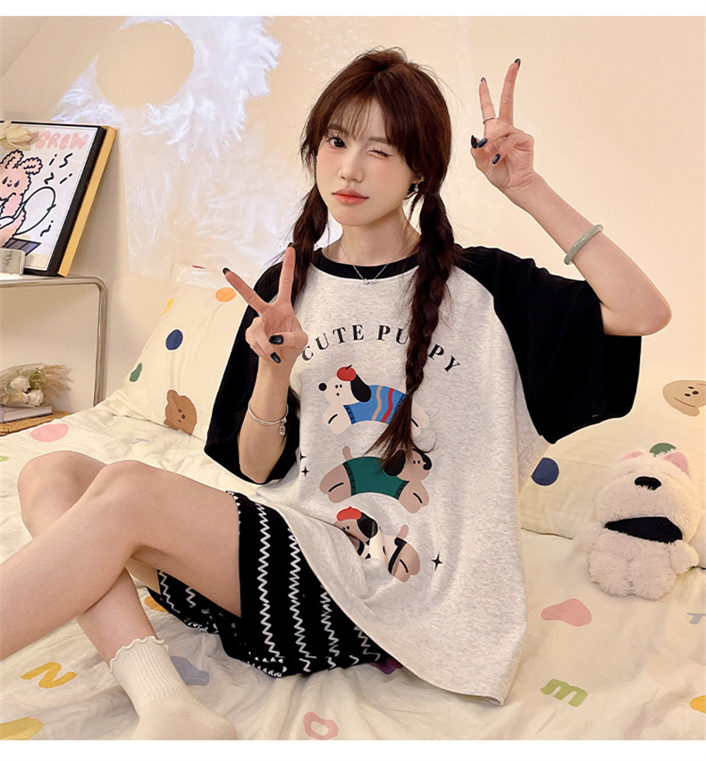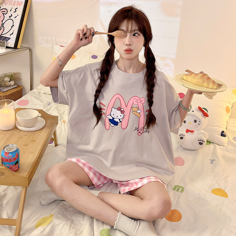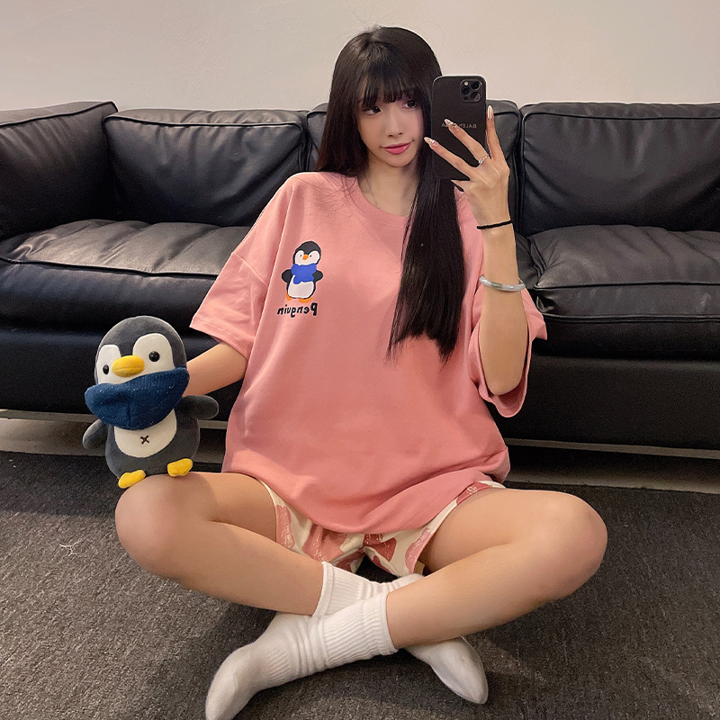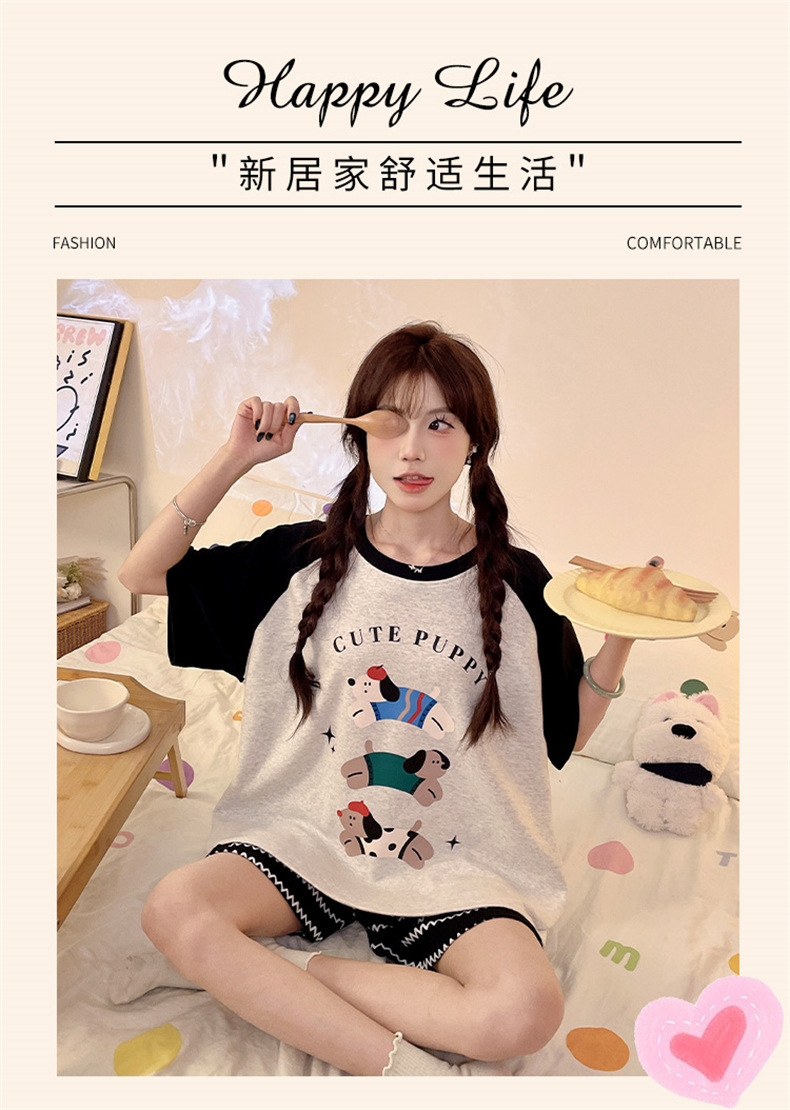 여성용 면 잠옷, 여름 반팔 반바지, 얇은 홈웨어, 한국 스타일, 귀여운 만화 캐주얼 스타일, 외부에서 착용 가능