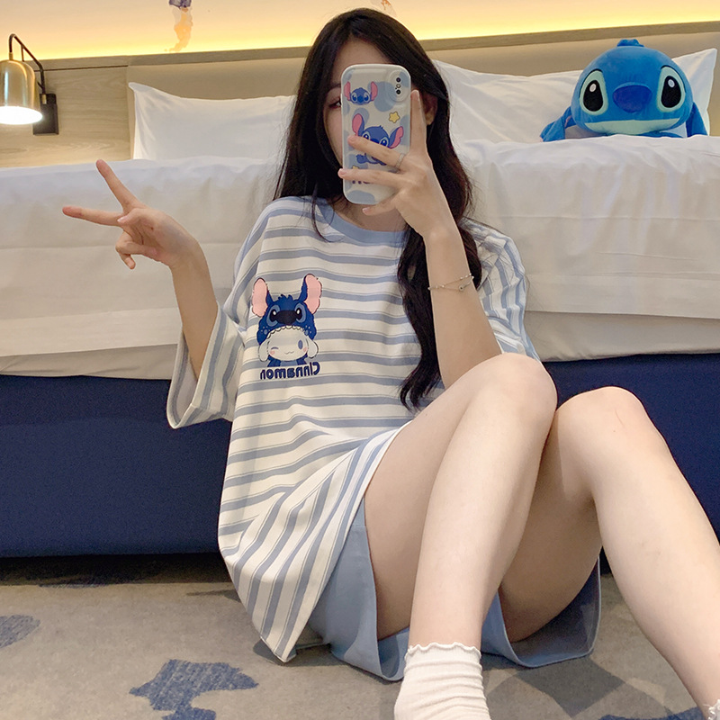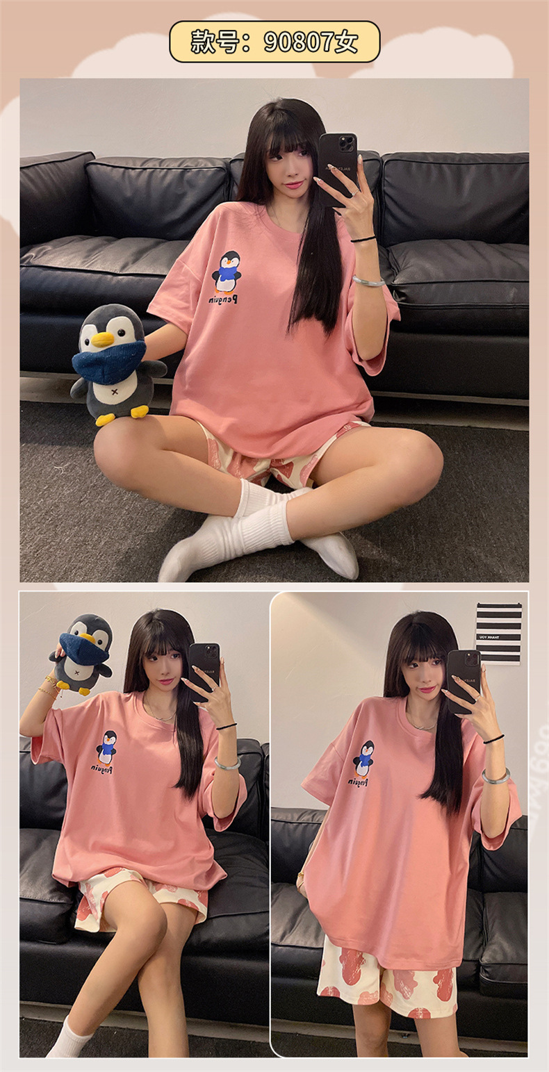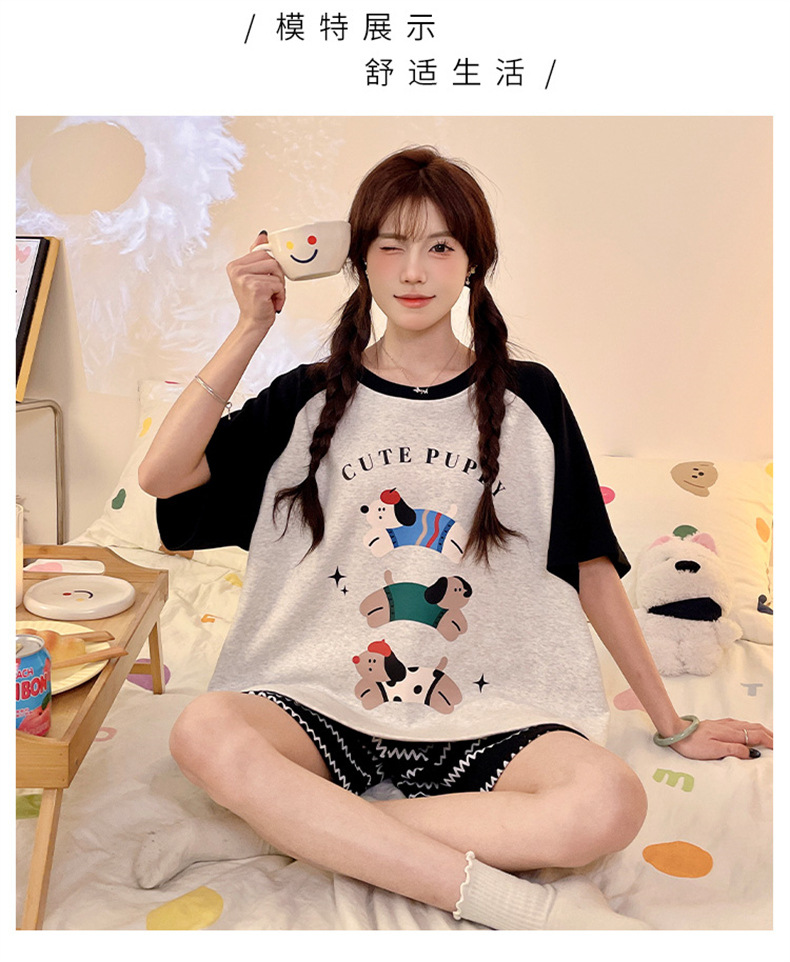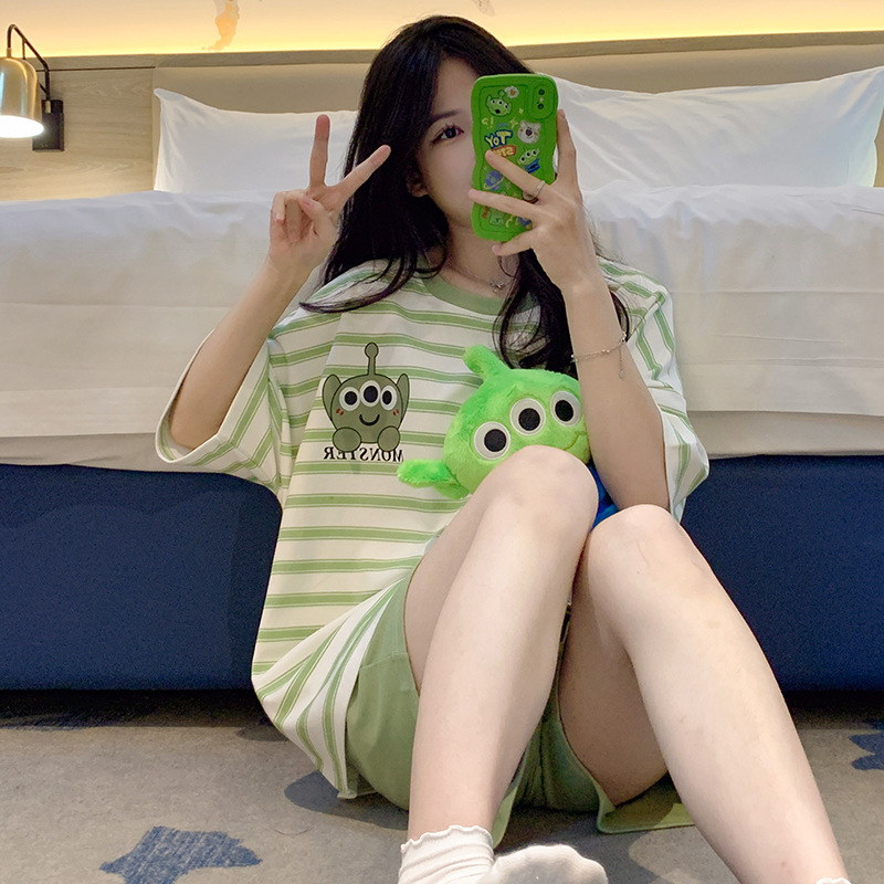 여성용 면 잠옷, 여름 반팔 반바지, 얇은 홈웨어, 한국 스타일, 귀여운 만화 캐주얼 스타일, 외부에서 착용 가능스토어 가기