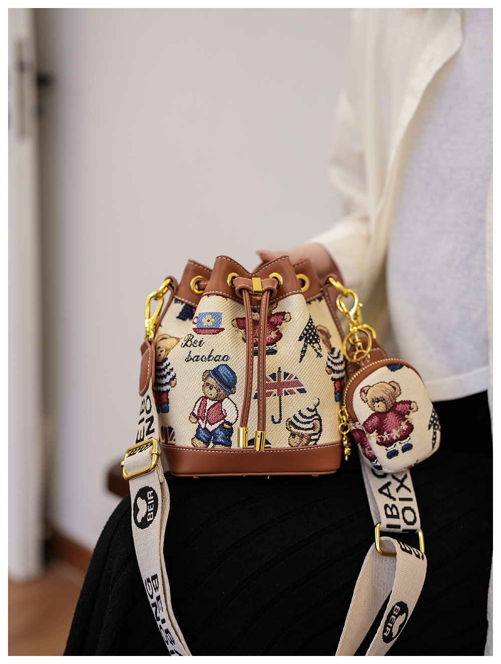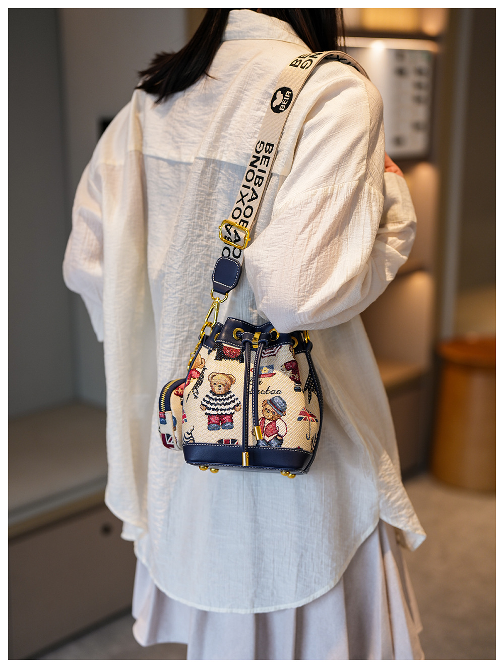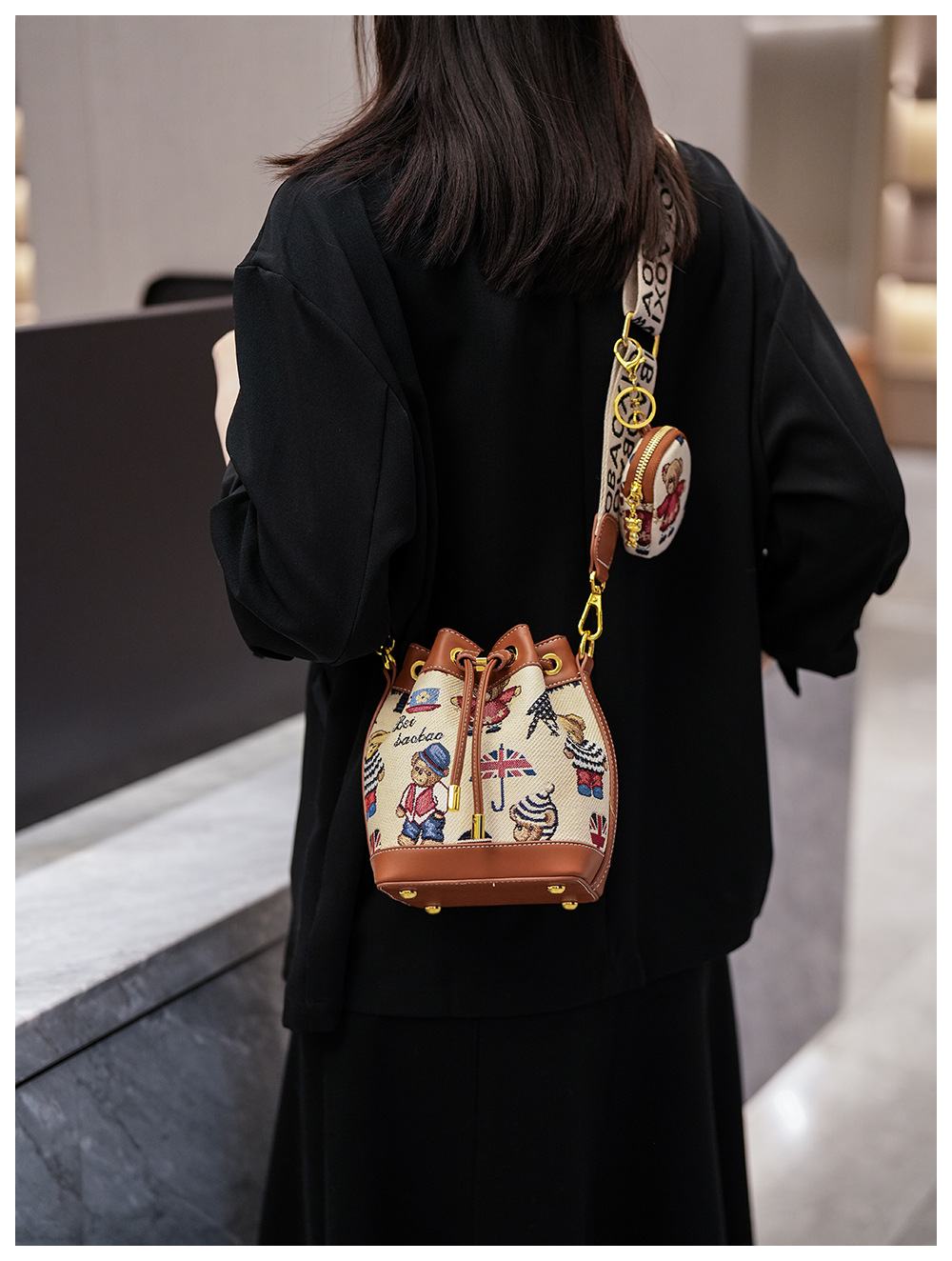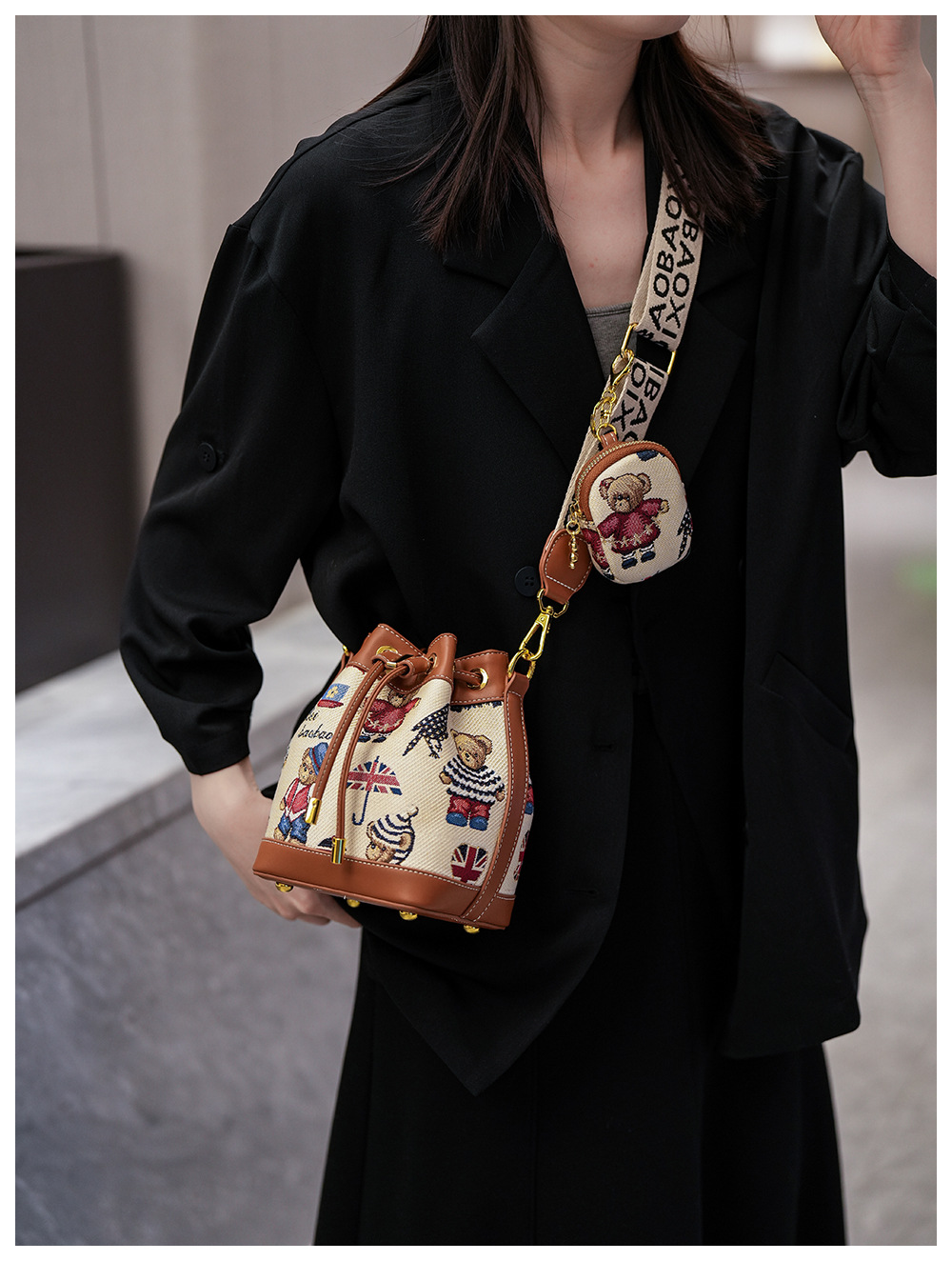 노스 백 소스 공장 새로운 귀여운 귀여운 간단한 올 매치 버킷 가방 만화 곰 어깨 크로스 바디 가방 여성스토어 가기