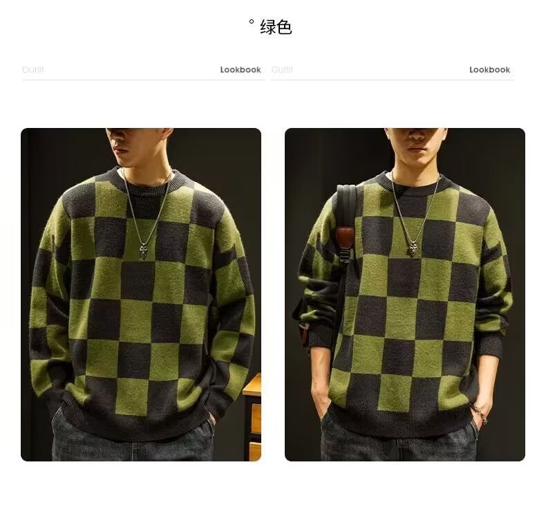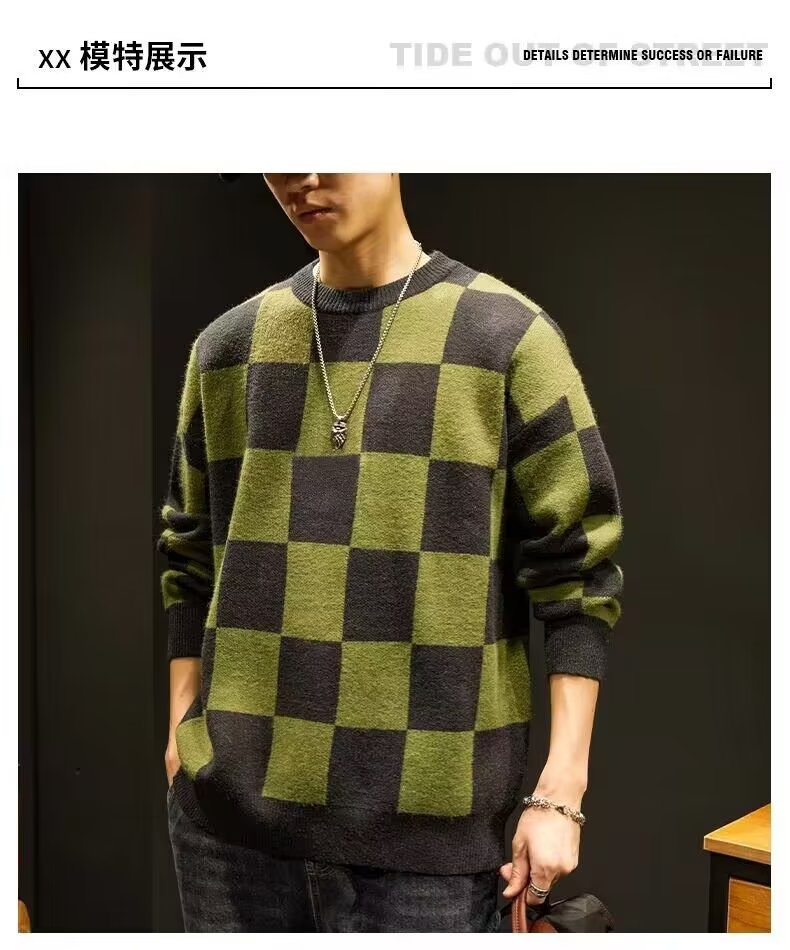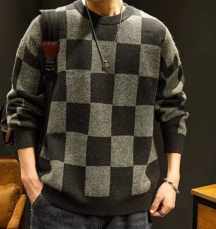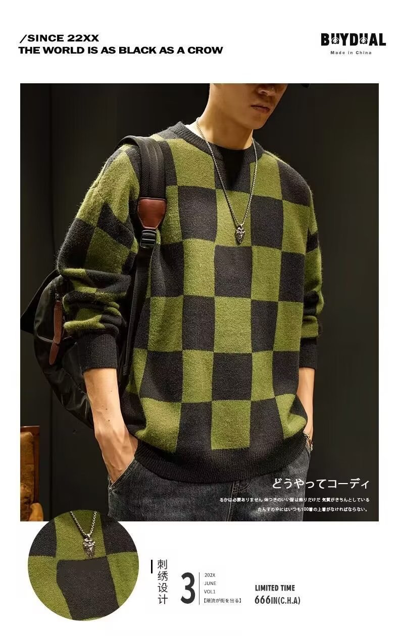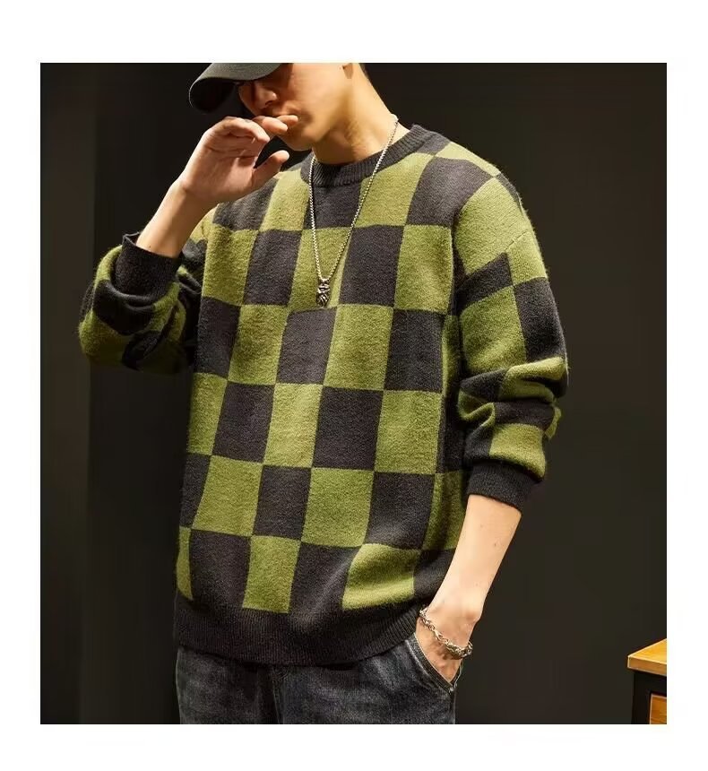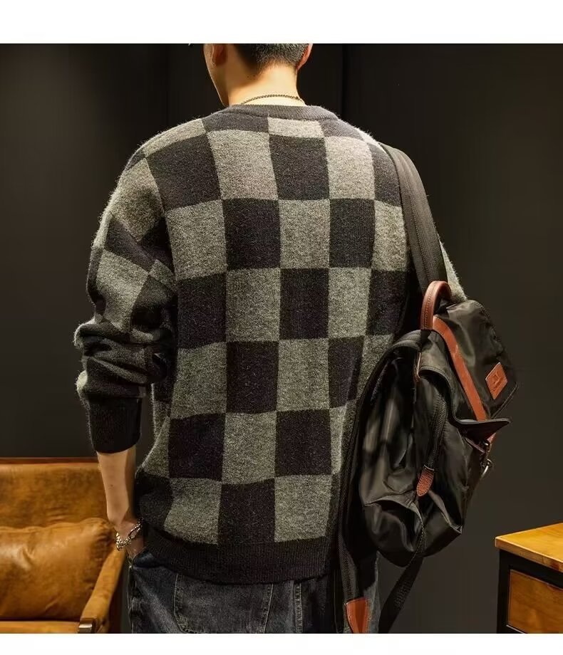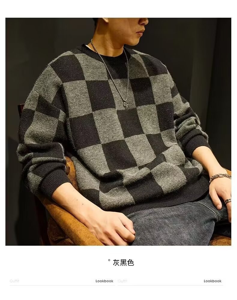 가을과 겨울 일본의 느슨한 격자 무늬 스웨터 남성용 트렌디 브랜드 플러스 사이즈 크루 넥베이스 스웨터 니트 스웨터 겨울 옷스토어 가기